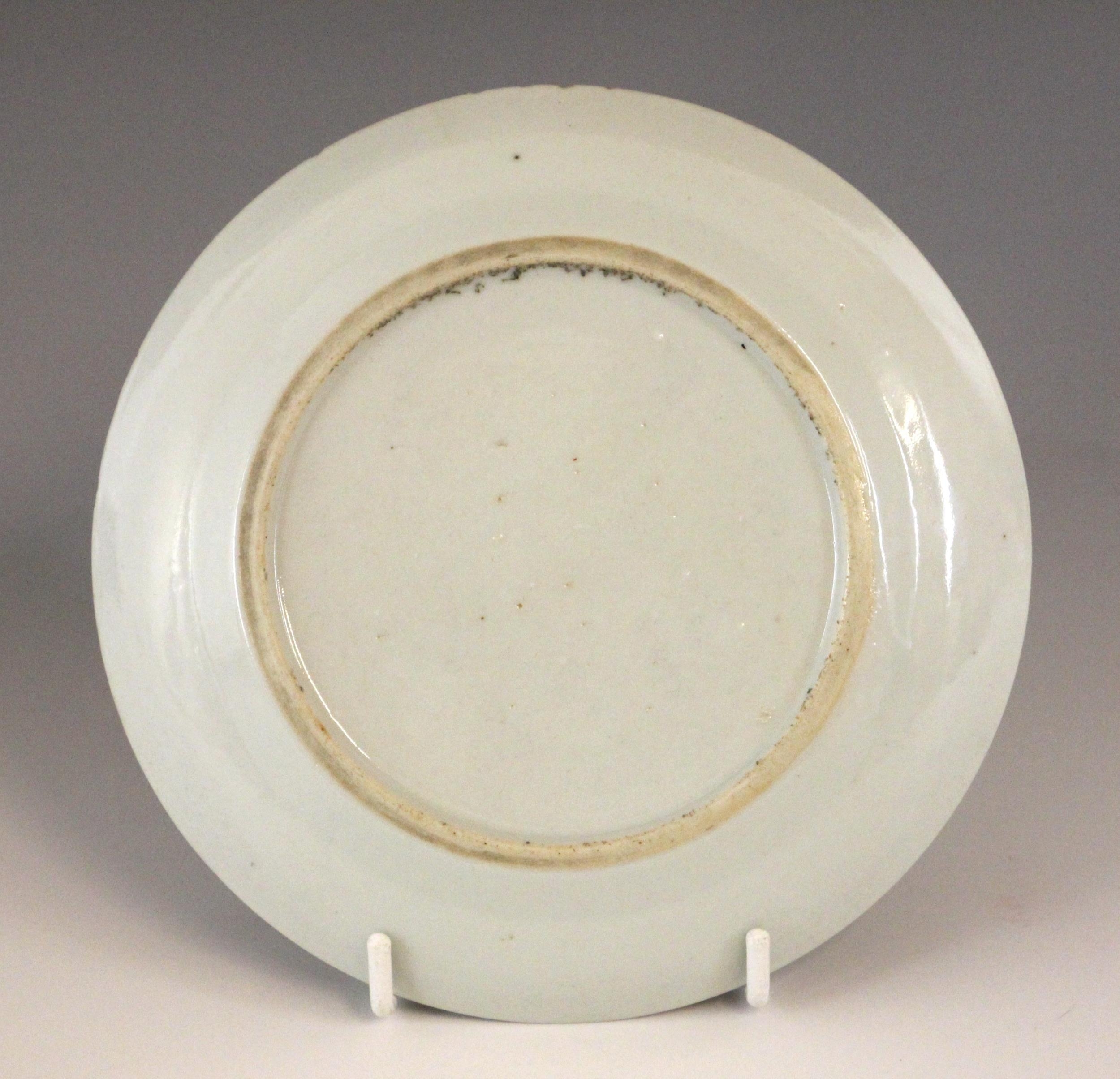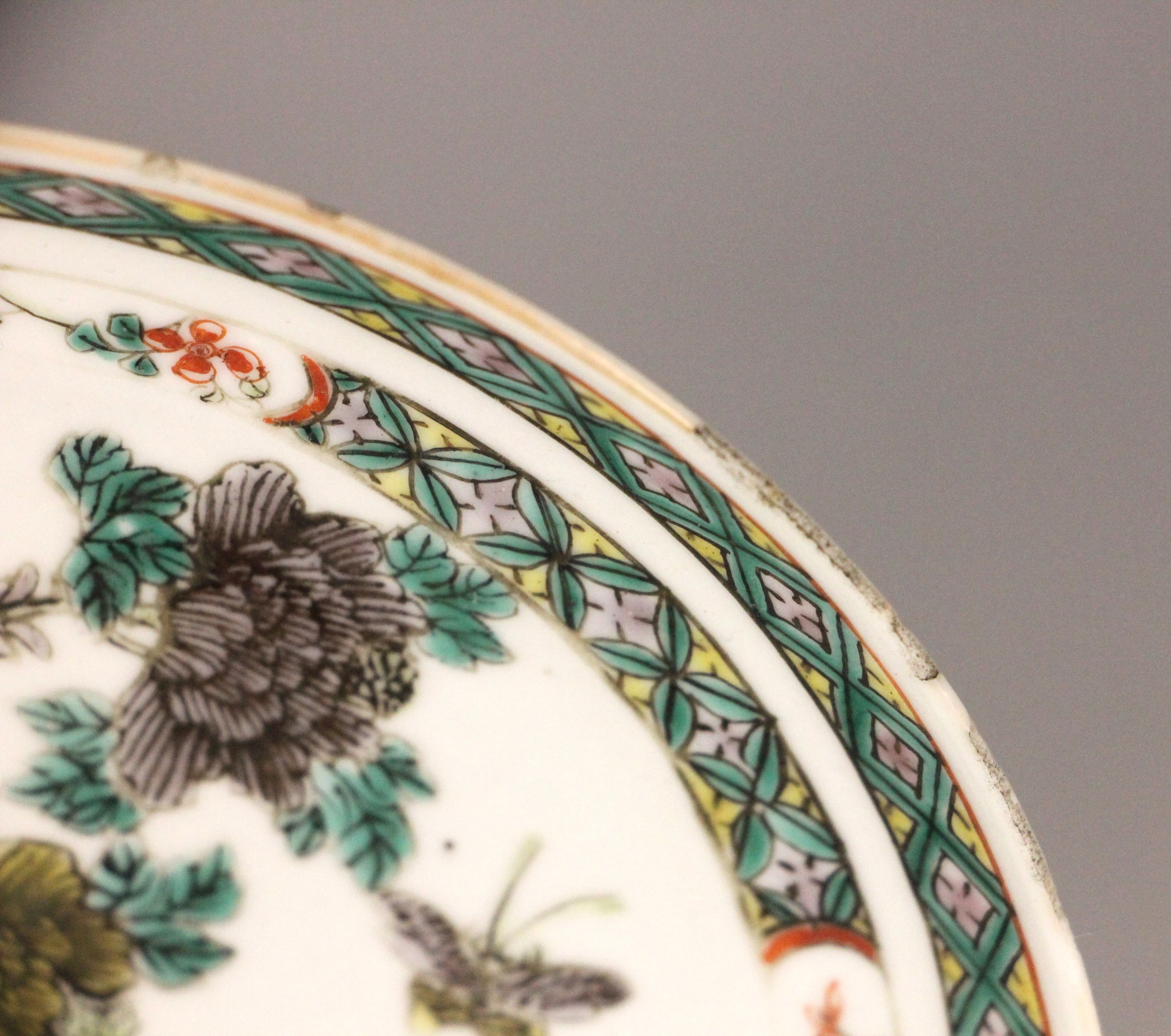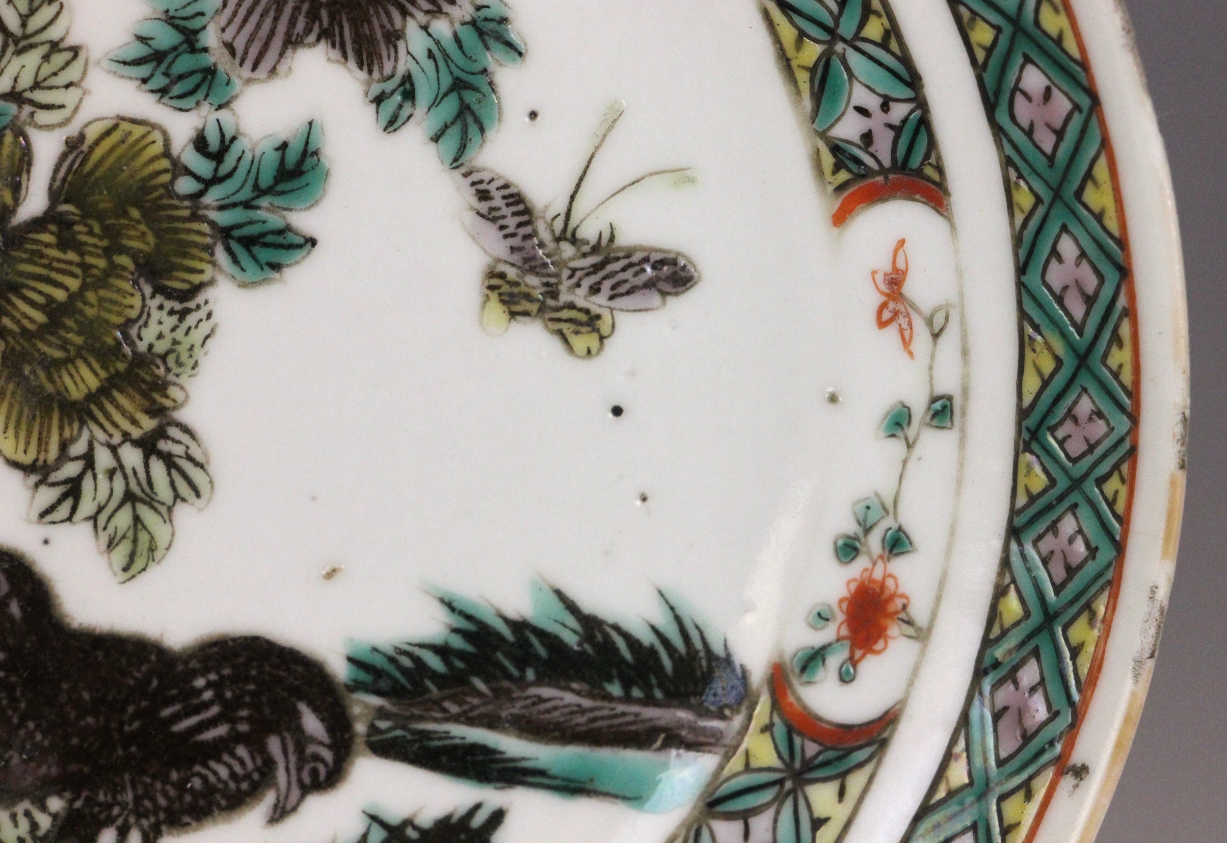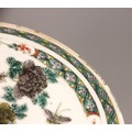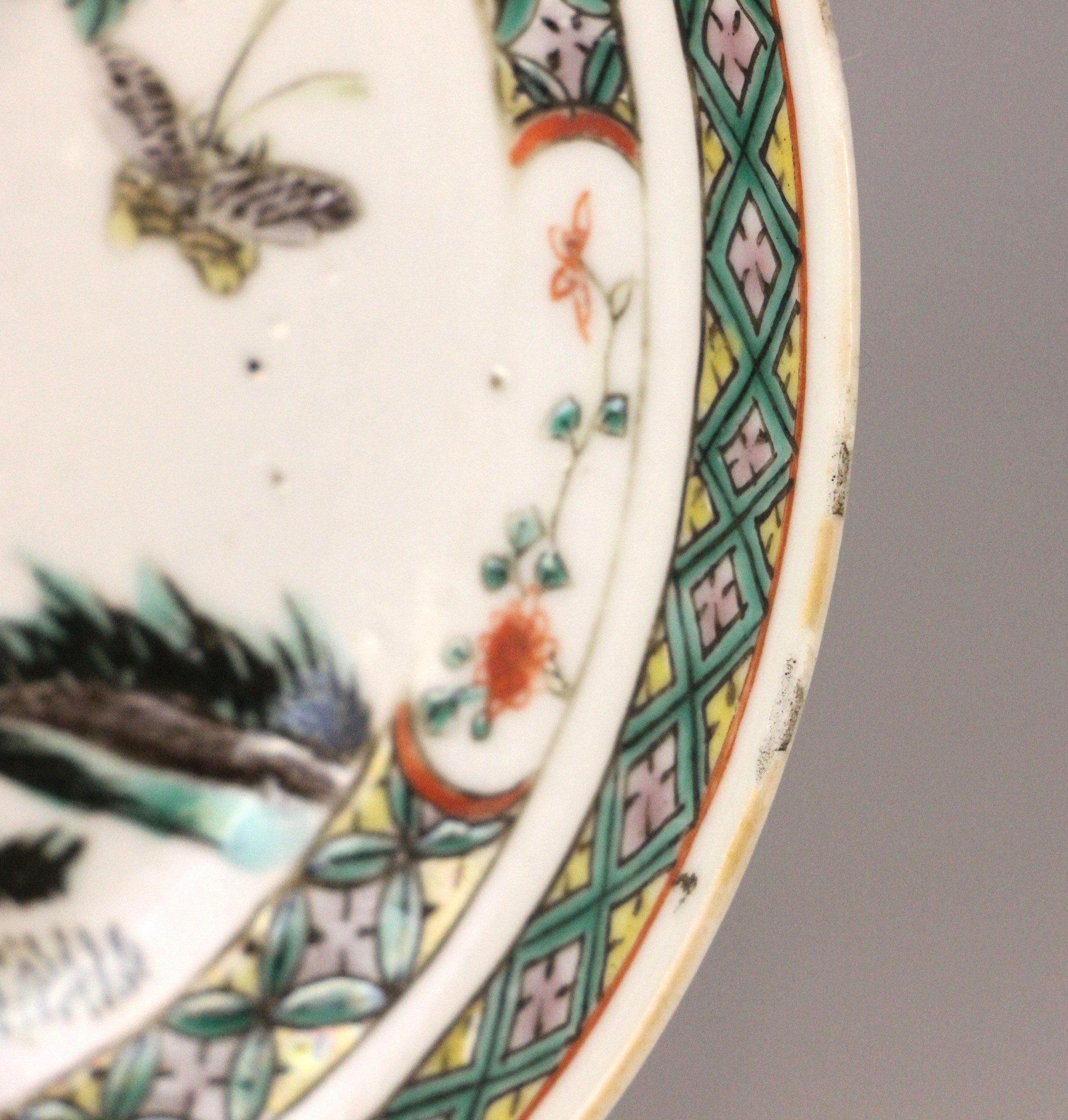 A Chinese porcelain famille verte saucer dish, 18th century, the small circular dish painted to the centre with two quail beside a rocky outcrop issuing chrysanthemum sprays, 15.2cm diameter