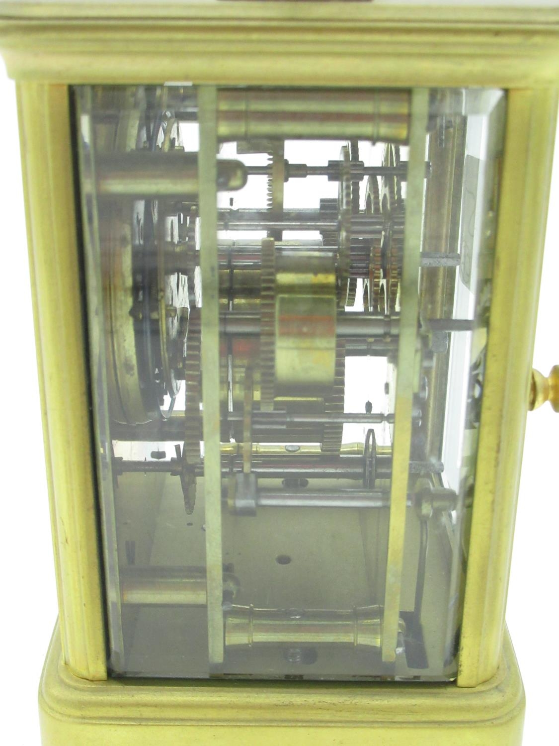 French gilt brass gorge cased repeating carriage alarm clock with platform lever escapement, the white enamel Roman dial indistinctly inscribed and with Arabic alarm dial, movement stamped Aiguilles Aig Le Reveil and serial number 15850, H15cm