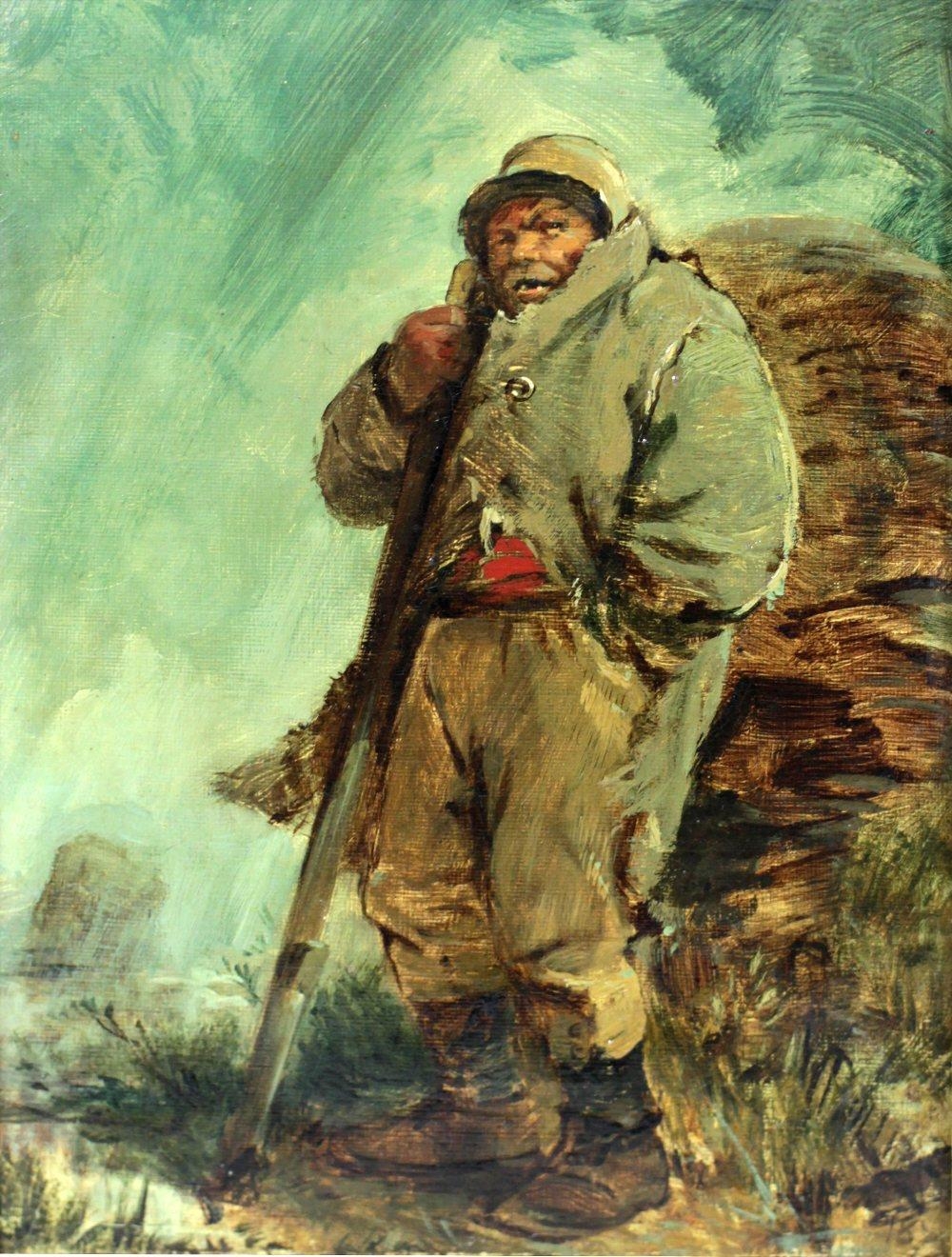 W.R. Phillips, 19th Century English School"Making Hay," O.O.C., depicting an elderly gentleman in ragged attire, with stick in hand, leaning against a haystack, approx. 26cms x 18cms (10" x 8"), signed lower right, in ornate gilt frame. (1)