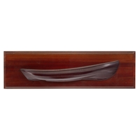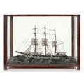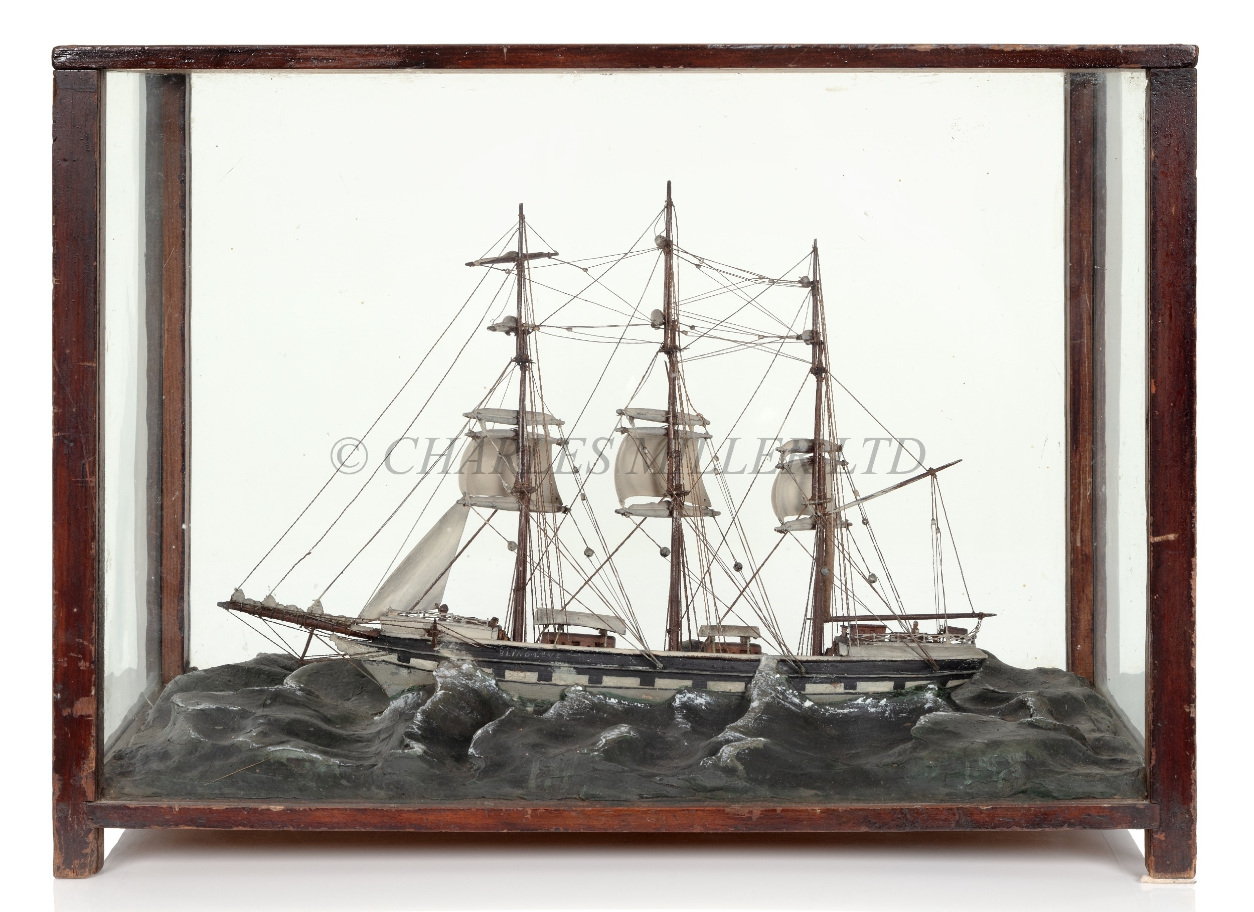 the 12in. hull carved from the solid with simple carved fittings, carved reefed and set sails, depicted on a port reach in a high moulded running sea contained in glazed wooden case -- 16 x 21½ x 11½in. (40.5 x 55 x 29cm.)