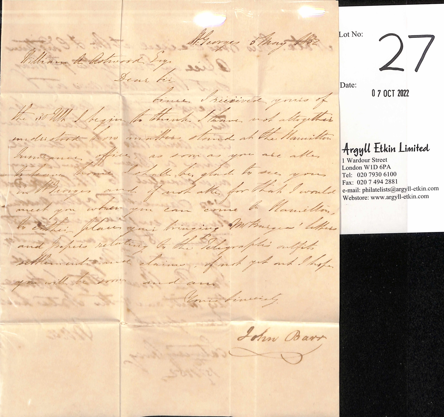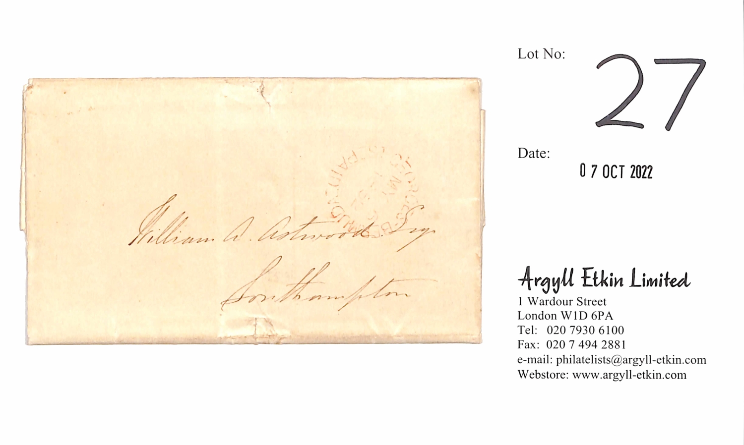 1852 (May 6) Entire letter from St. Georges to Southampton with red "ST GEORGES - BERMUDA / PAID". A note added on the second page states the letter was delivered on May 7th; it was then put under cover with two notes and directed to Somerset. After several enquiries it was finally delivered on May 15th, this letter and one of the notes having been opened. Small tear at upper and lower edges, otherwise fine.