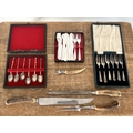Three cased sets of EPNS cutlery including pastry forks and teaspoons (case as found) together with a horn handle carving set and a bottle opener