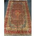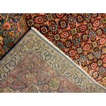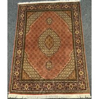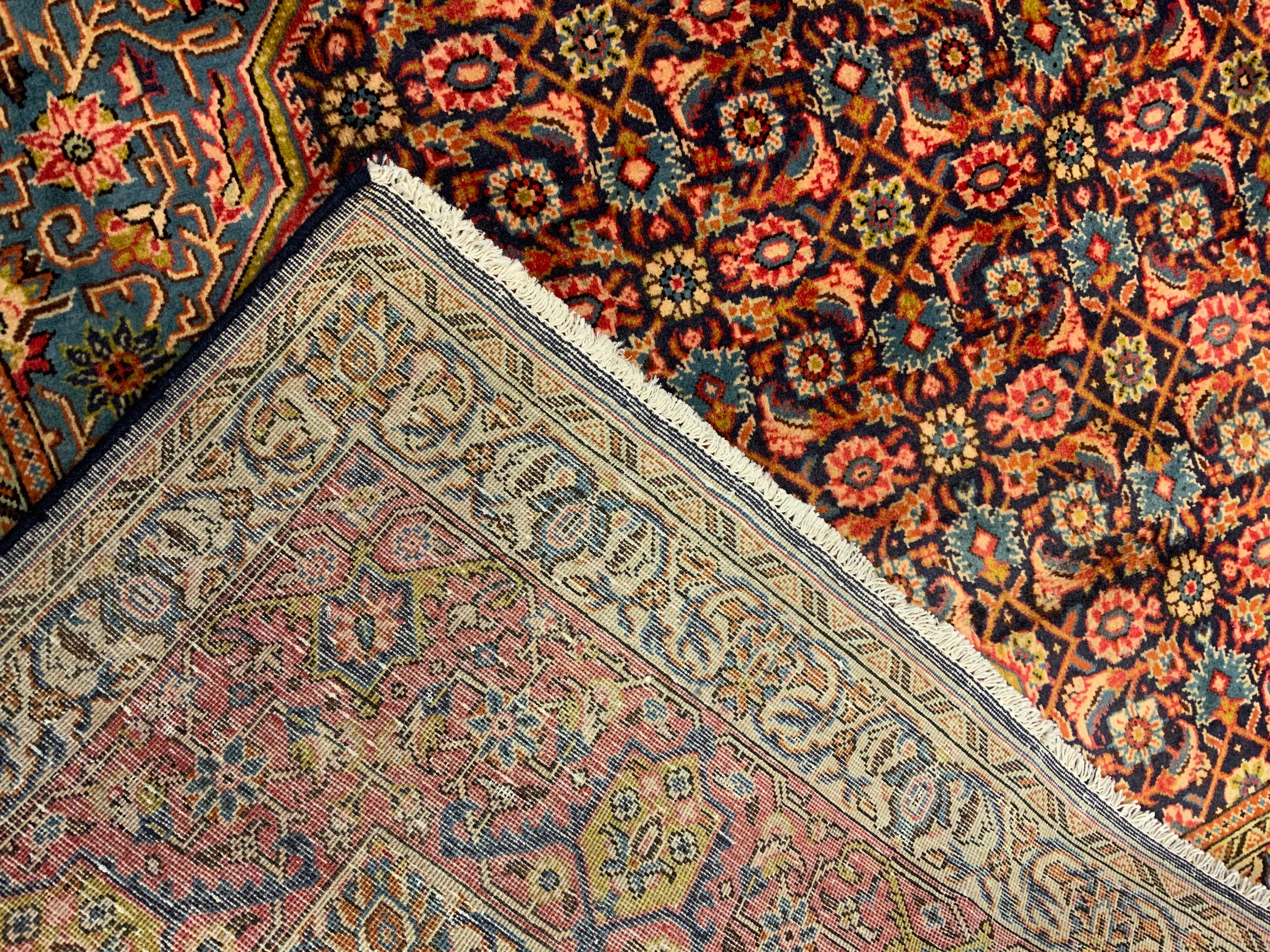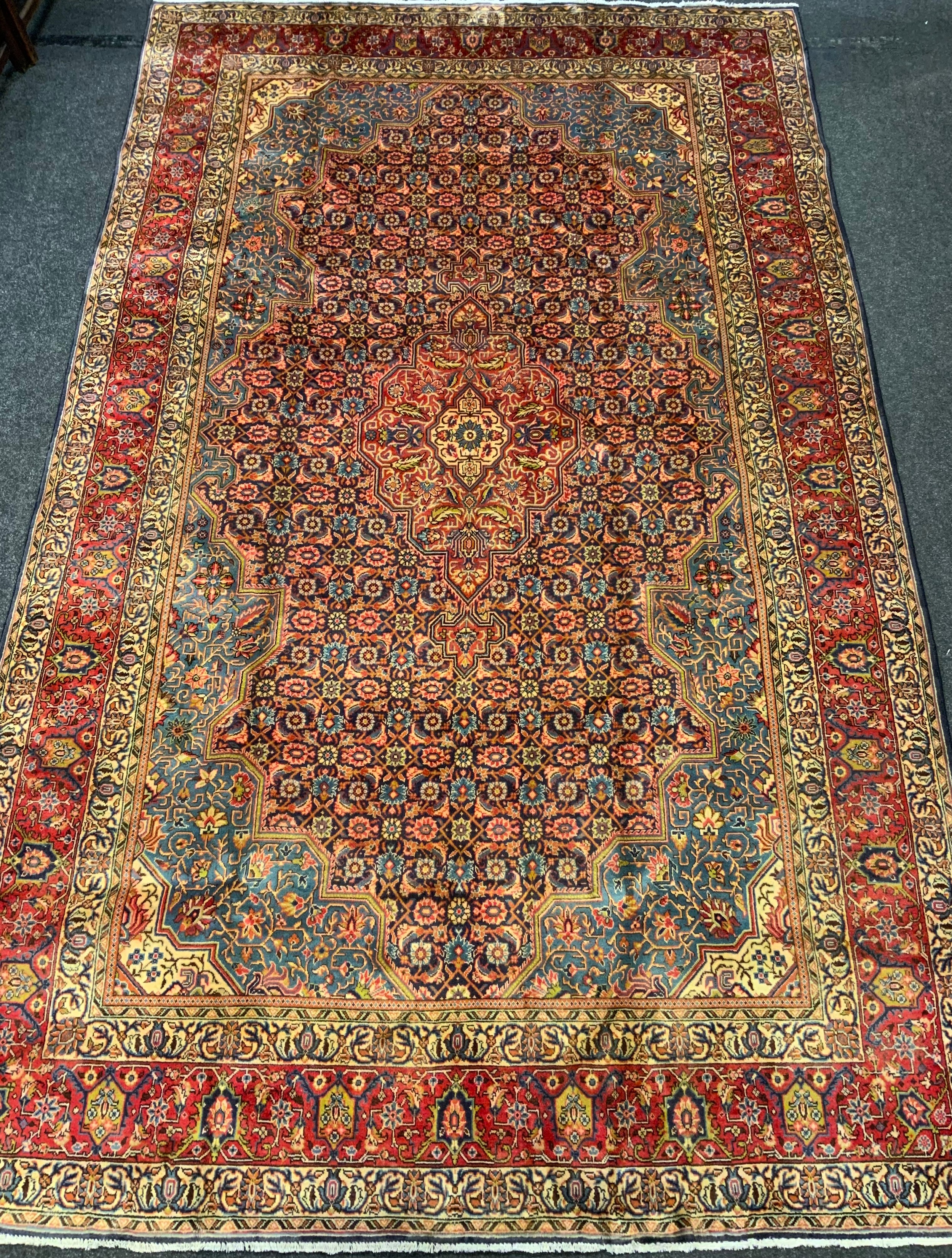 A fine Persian Tabriz rug / carpet, woven in shades of red, pale blue, and indigo, 350cm x 215cm.