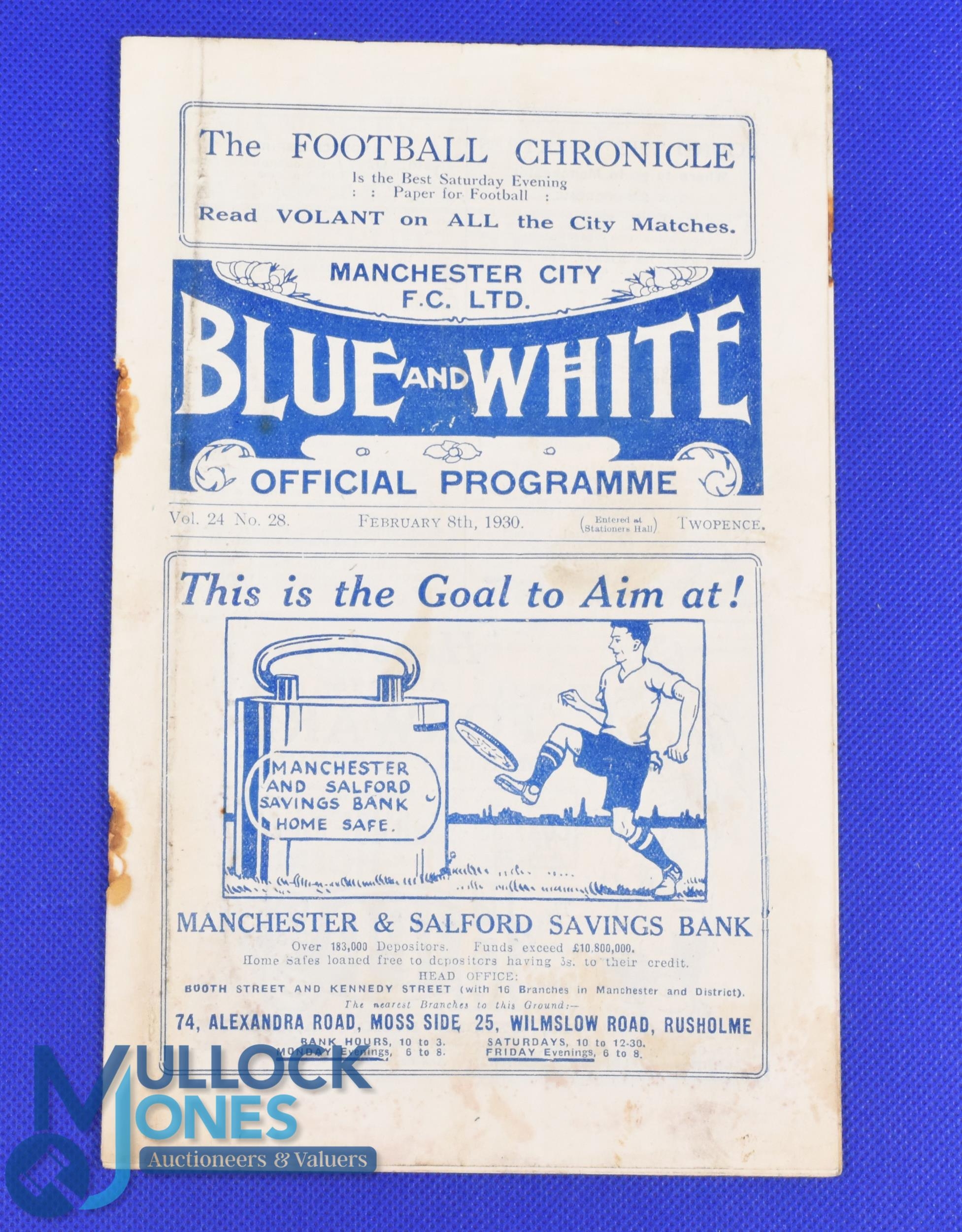 Pre-War 1929/1930 Scarce issue Manchester City v Manchester Utd, Div. 1 match programme at Maine Road 8 February 1930; rusty staples, foxing. (1)