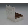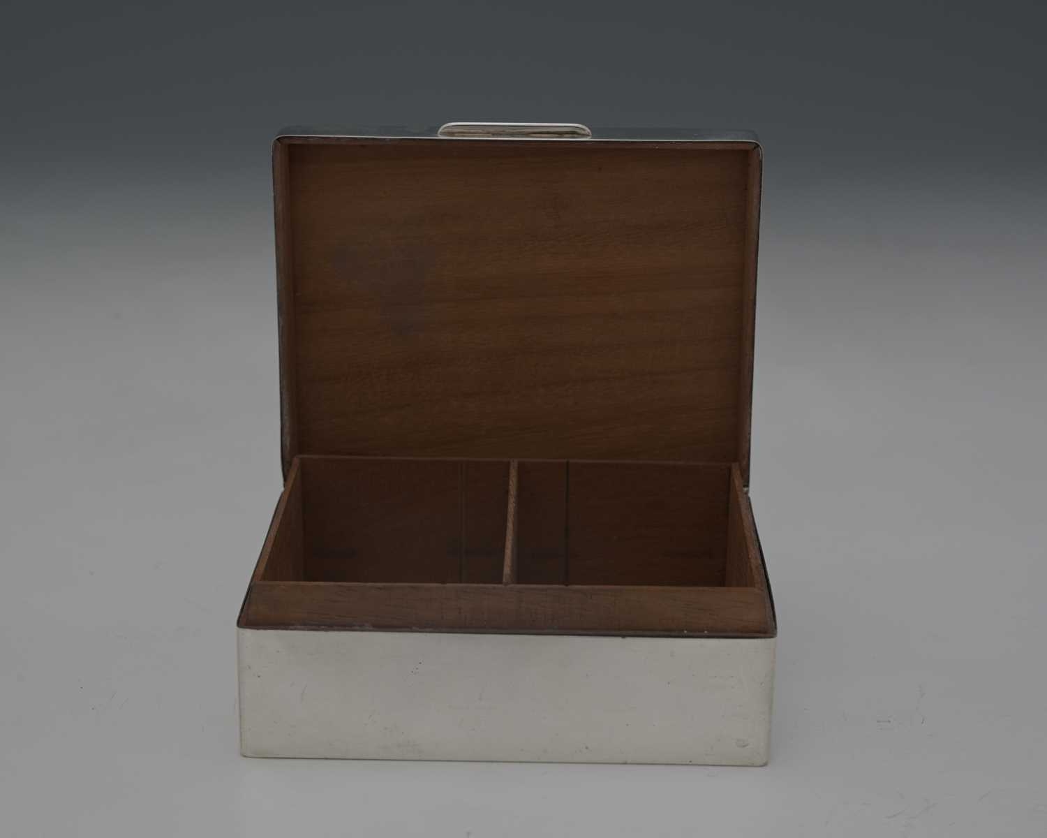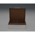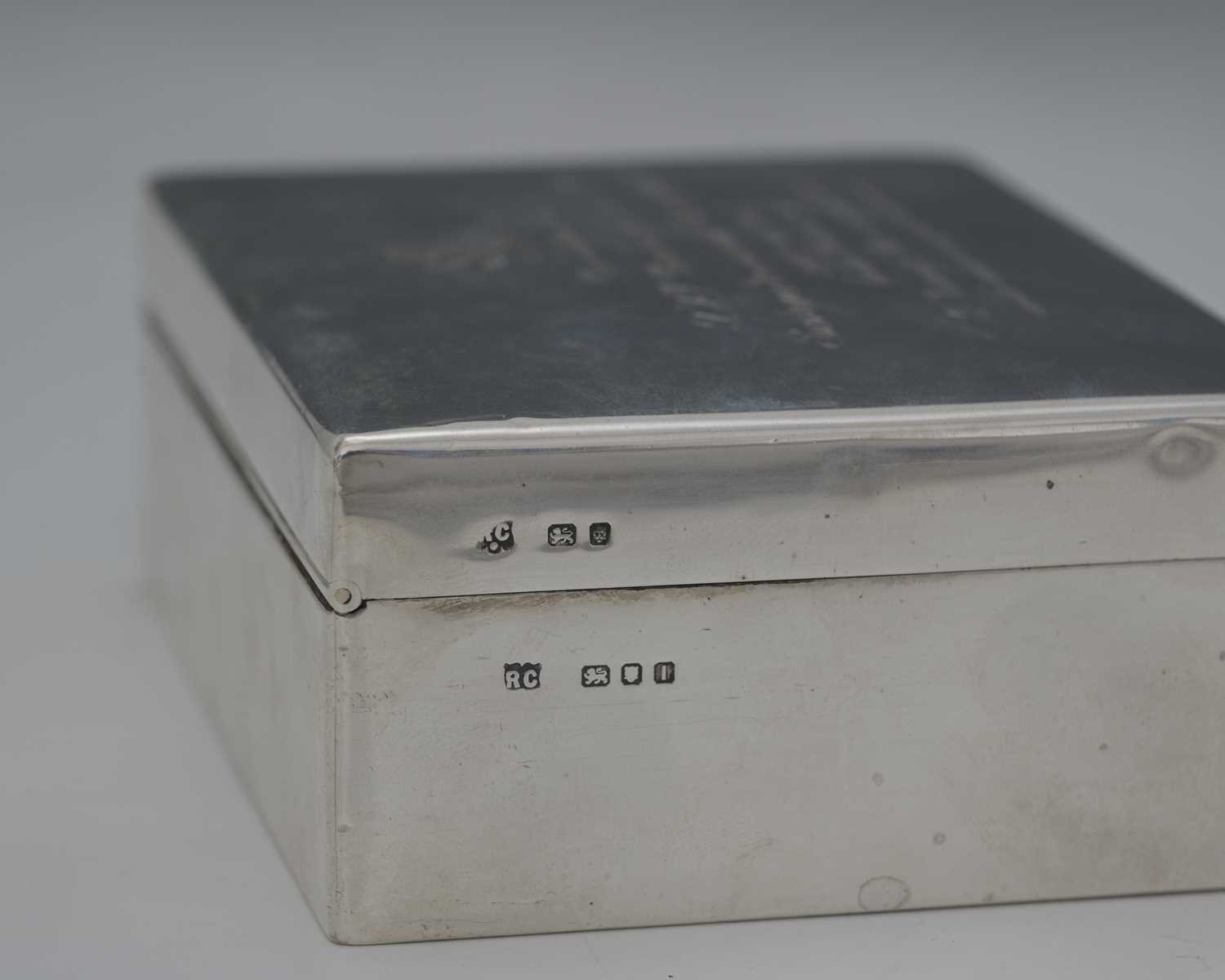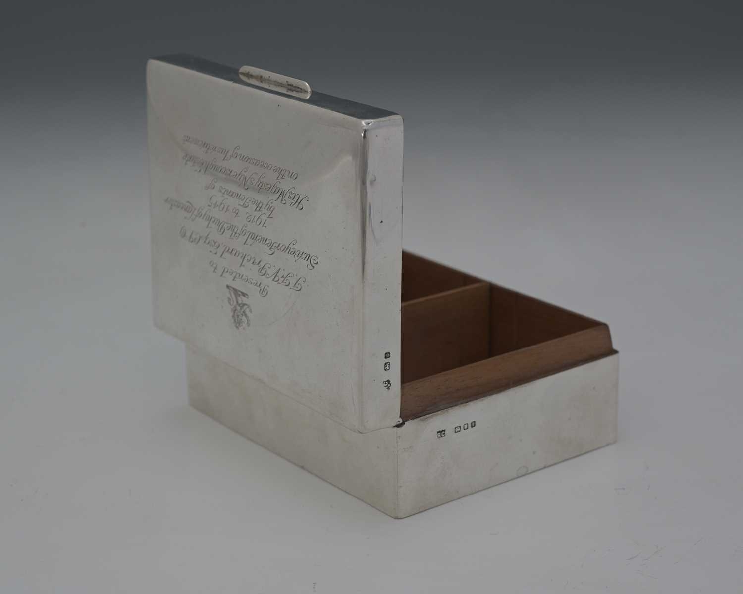 A George VI silver cigarette box, by William Comyns & Sons Ltd., London 1944, of plain rectangular form, the hinged cover opens to reveal a wood-lined interior, the cover with presentation inscription, 'Presented to T F V Pritchard, Esq, CVO, Surveyor General of the Duchy of Lancaster, 1912 to 1945, by the Tenants of His Majesty's Myerscough Estate', length 10.5cm approx