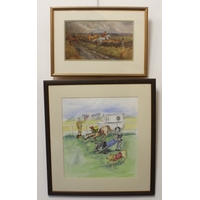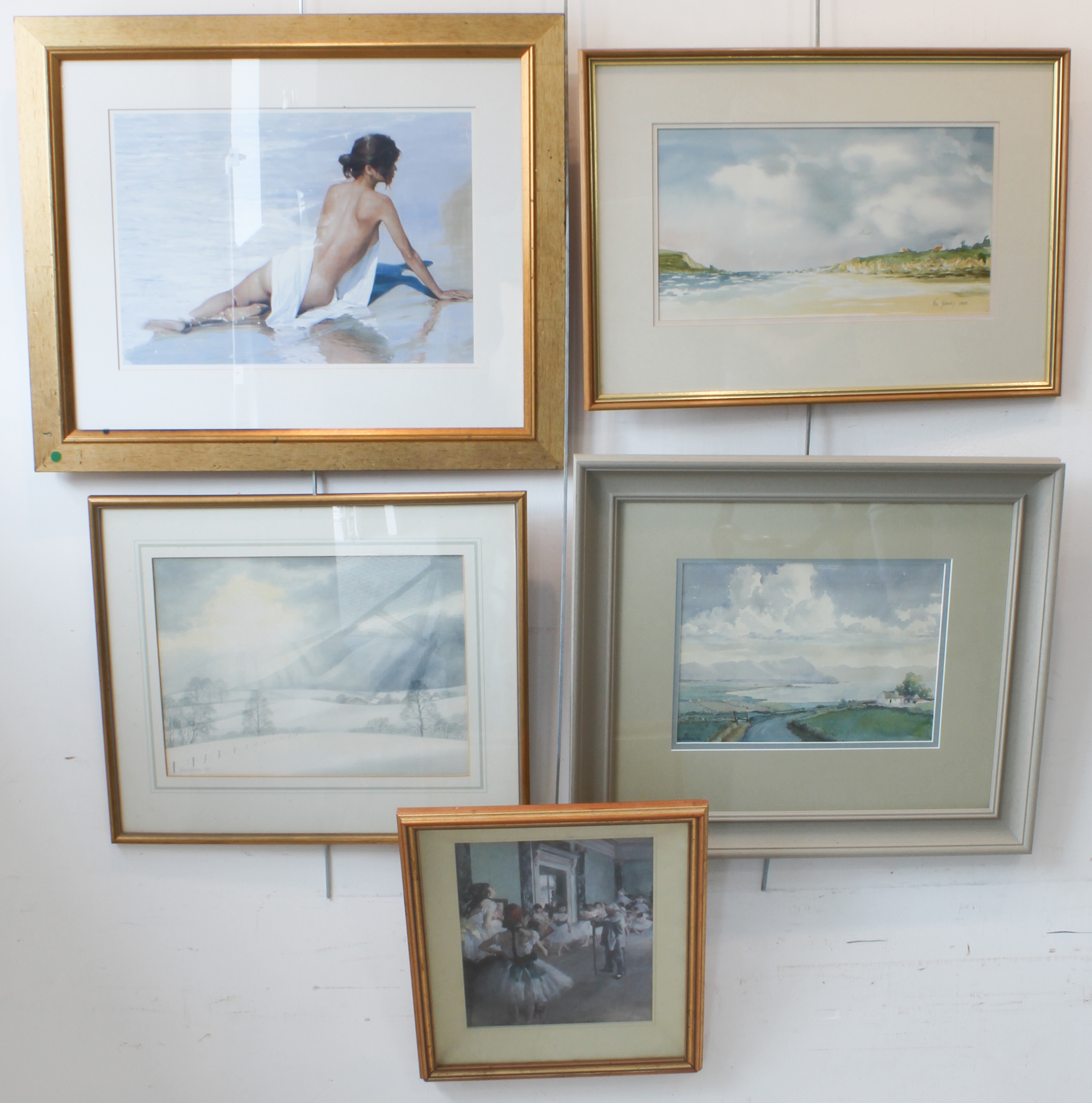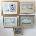 Three watercolours and two prints: