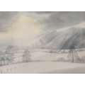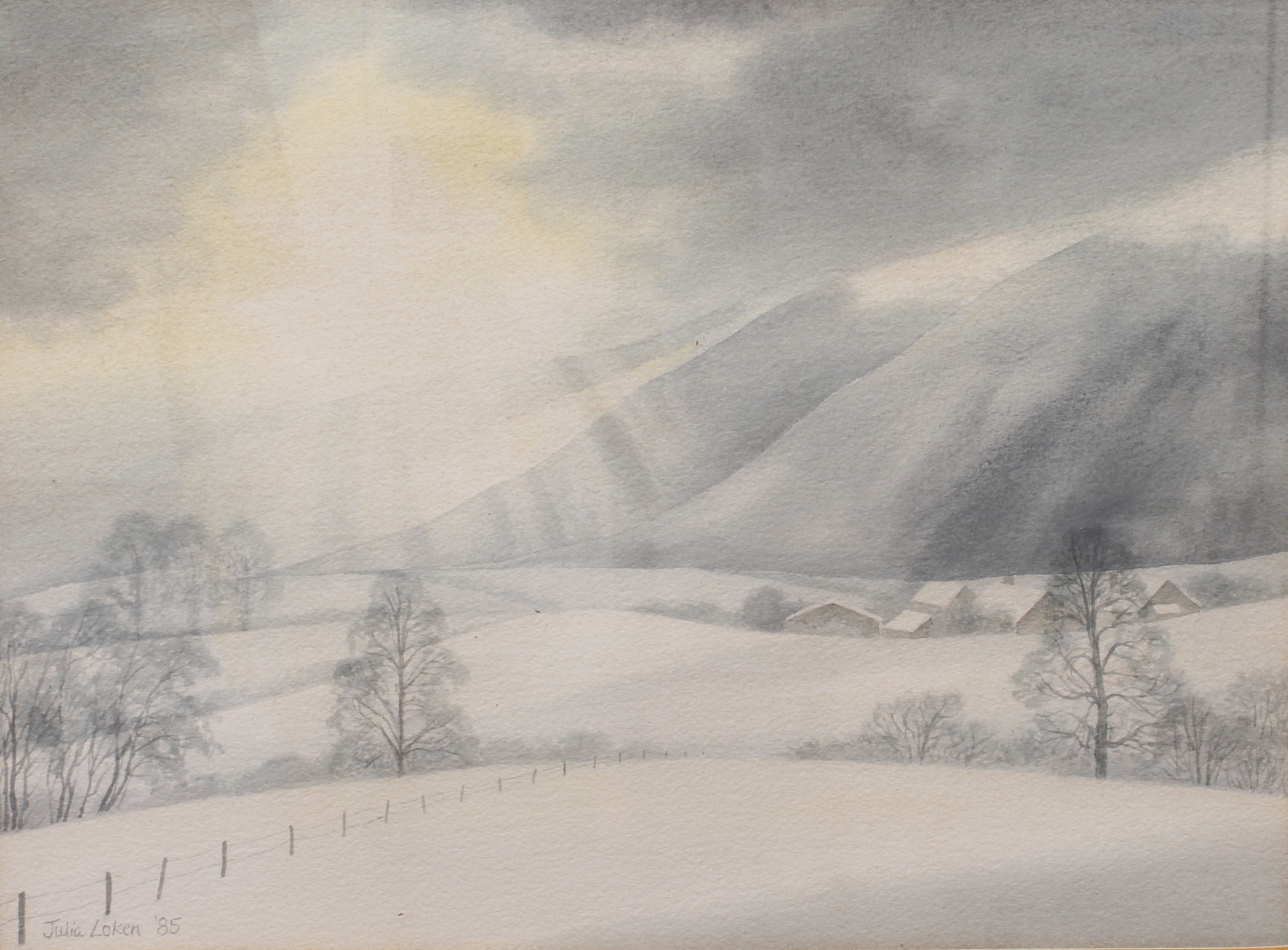JULIA LOKEN - countryside snow scene, watercolour signed and dated '85 lower left (27 x 36 cm);