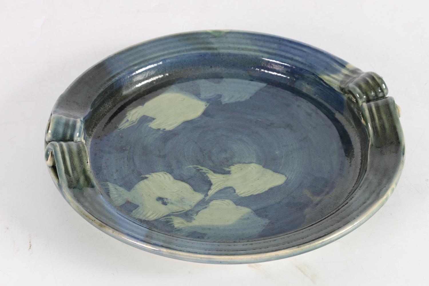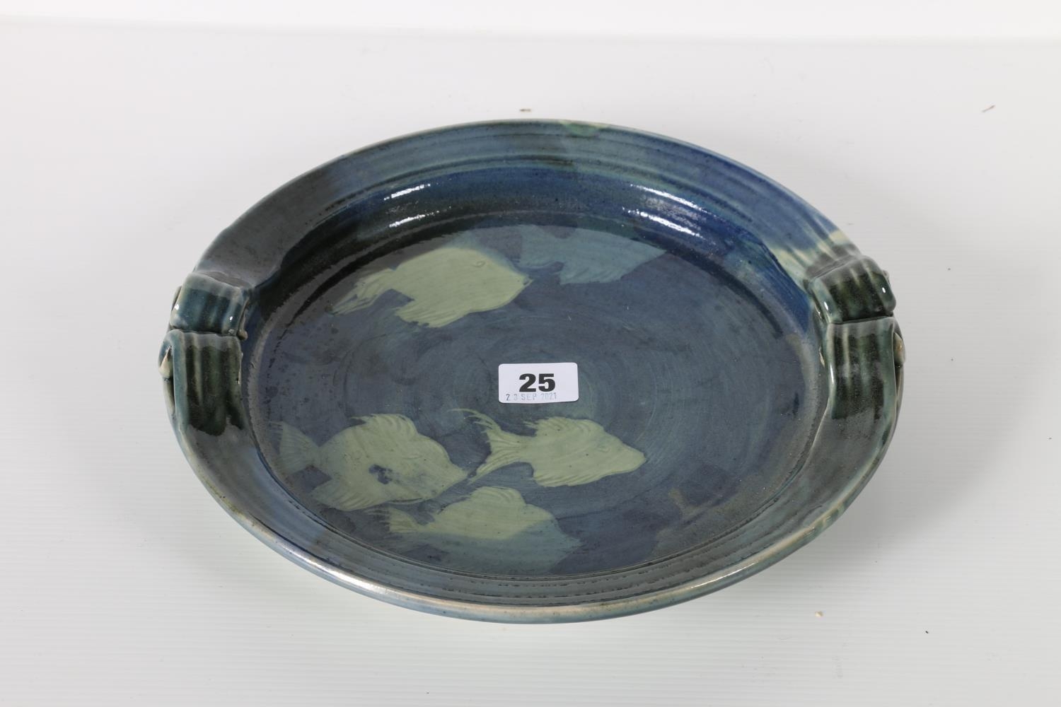 George Ormerod Studio Pottery twin-handled dish decorated with fish, 28cm diameter.