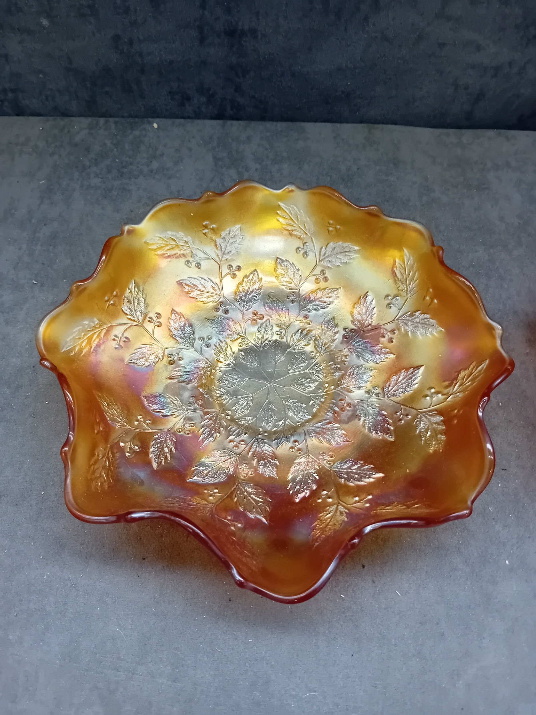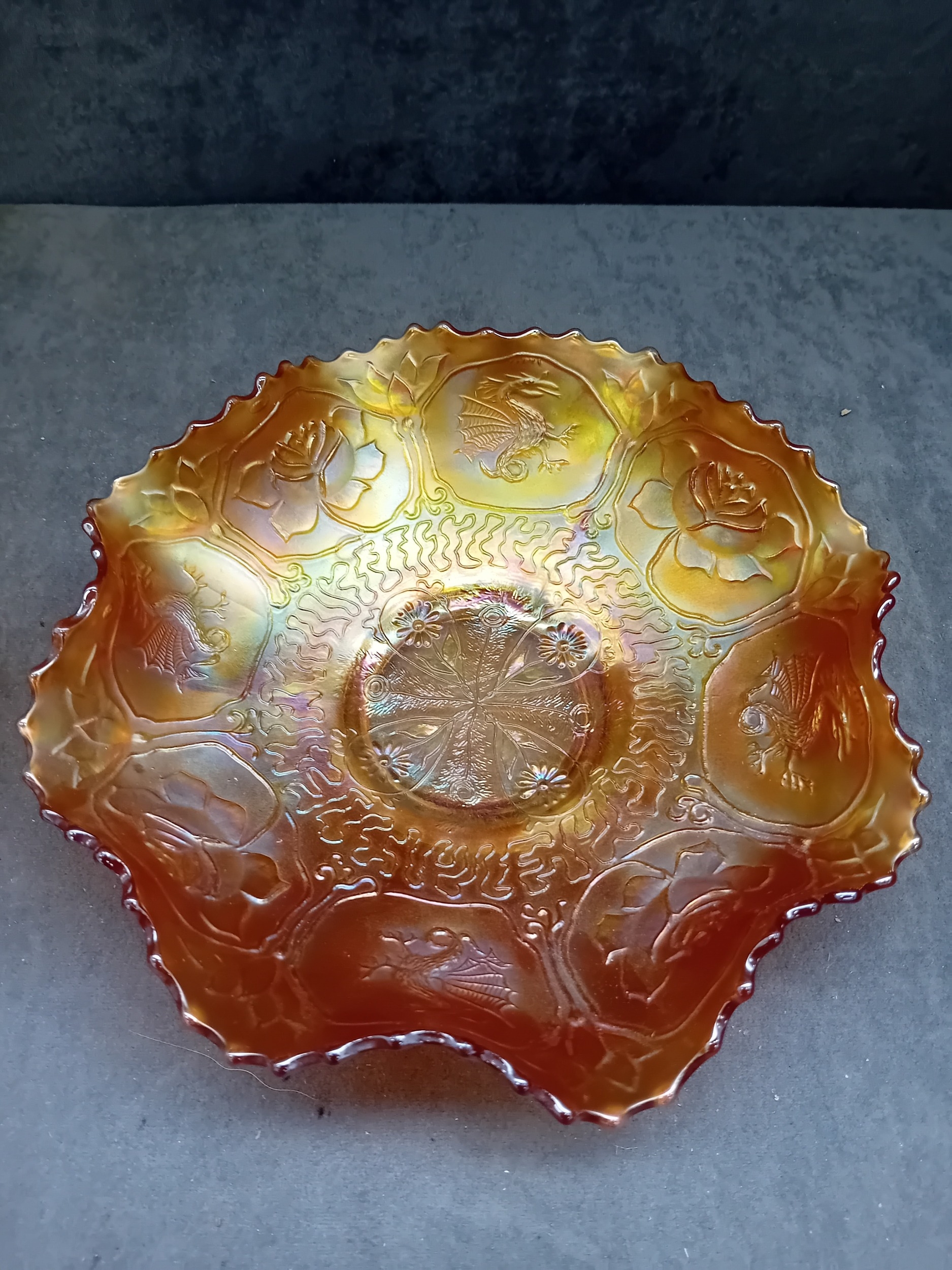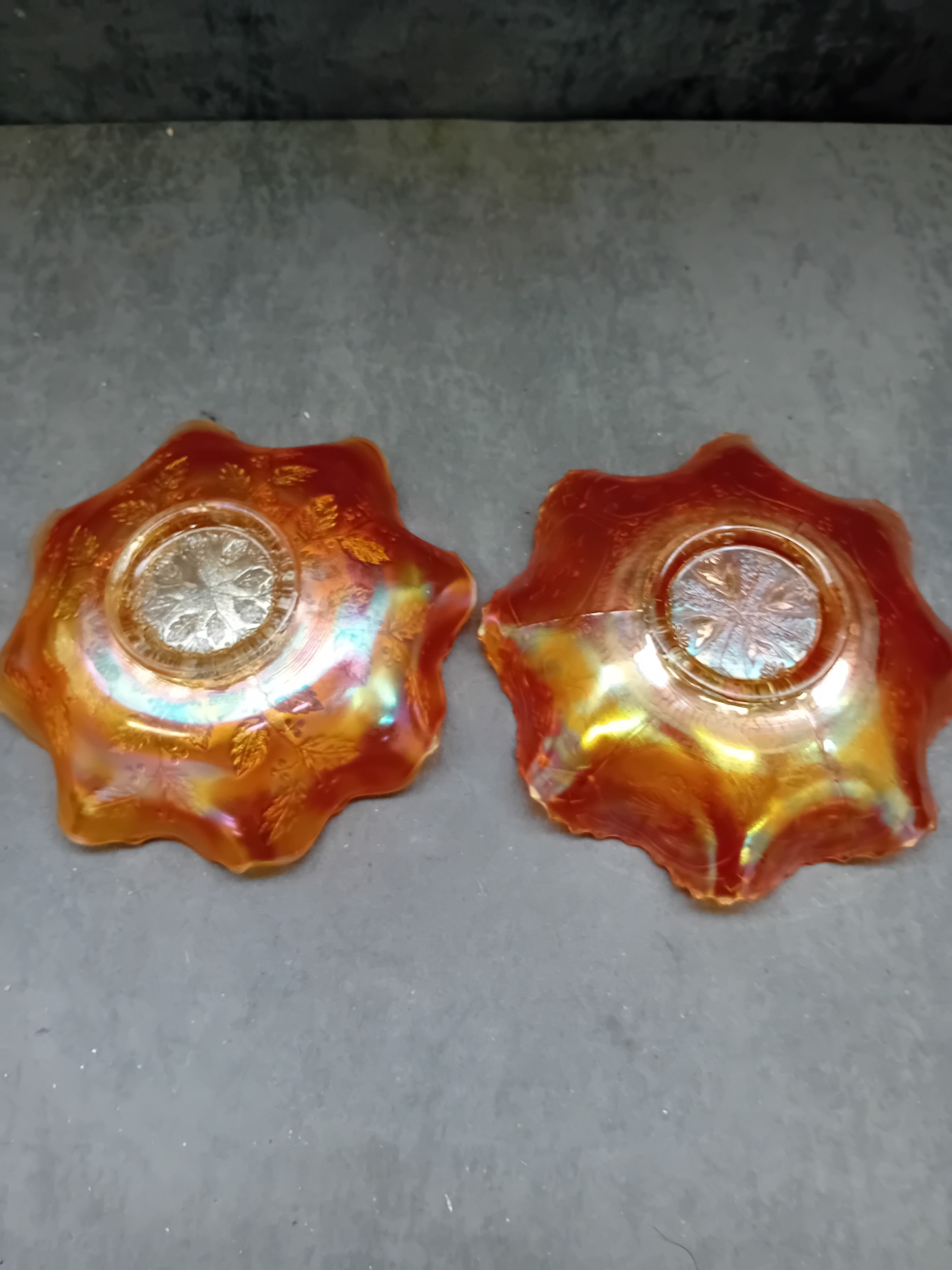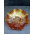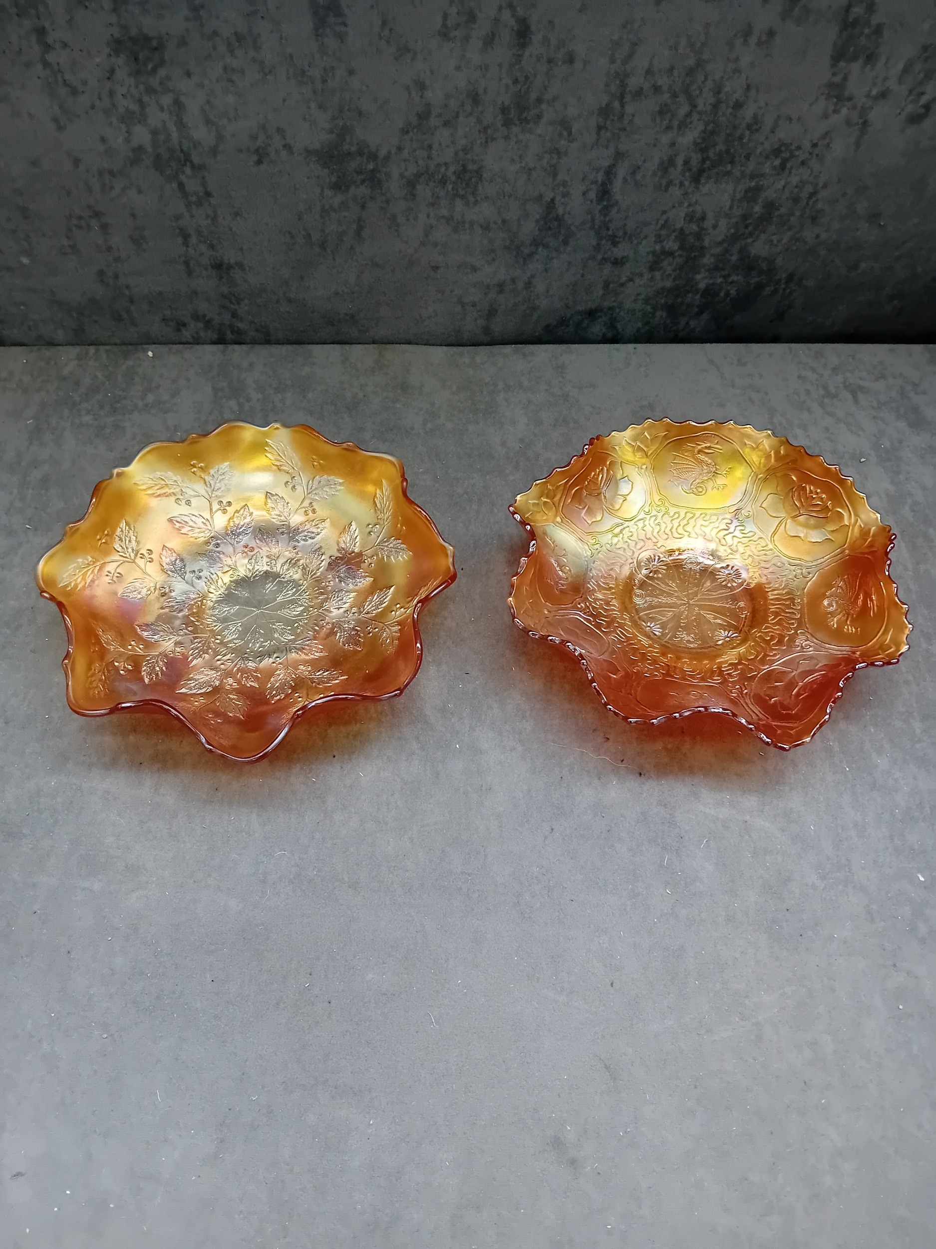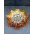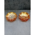 A pair of Fenton Marigold Carnival Glass bowls, comprising one in the Dragon & Lotus pattern and one in the Lotus and Poinsettia pattern. Each shallow bowl is characterized by its vibrant orange-amber base color with a distinct rainbow iridescence, shifting to hues of gold, purple, and green. Both feature a ruffled or crimped edge. The Dragon & Lotus bowl displays large flowers, swirling patterns, and bird or insect motifs around a central geometric design. The Lotus and Poinsettia bowl exhibits an embossed pattern of radiating leaves and berries around a central starburst medallion. The style suggests an early 20th-century decorative aesthetic. No visible manufacturer's marks or text are present.