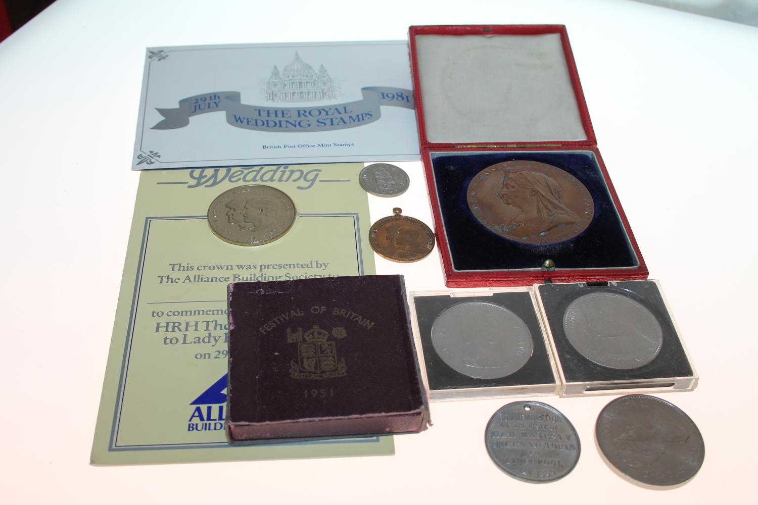 Victorian bronzed commemorative Diamond Jubilee medallion, 58mm, coins, etc.