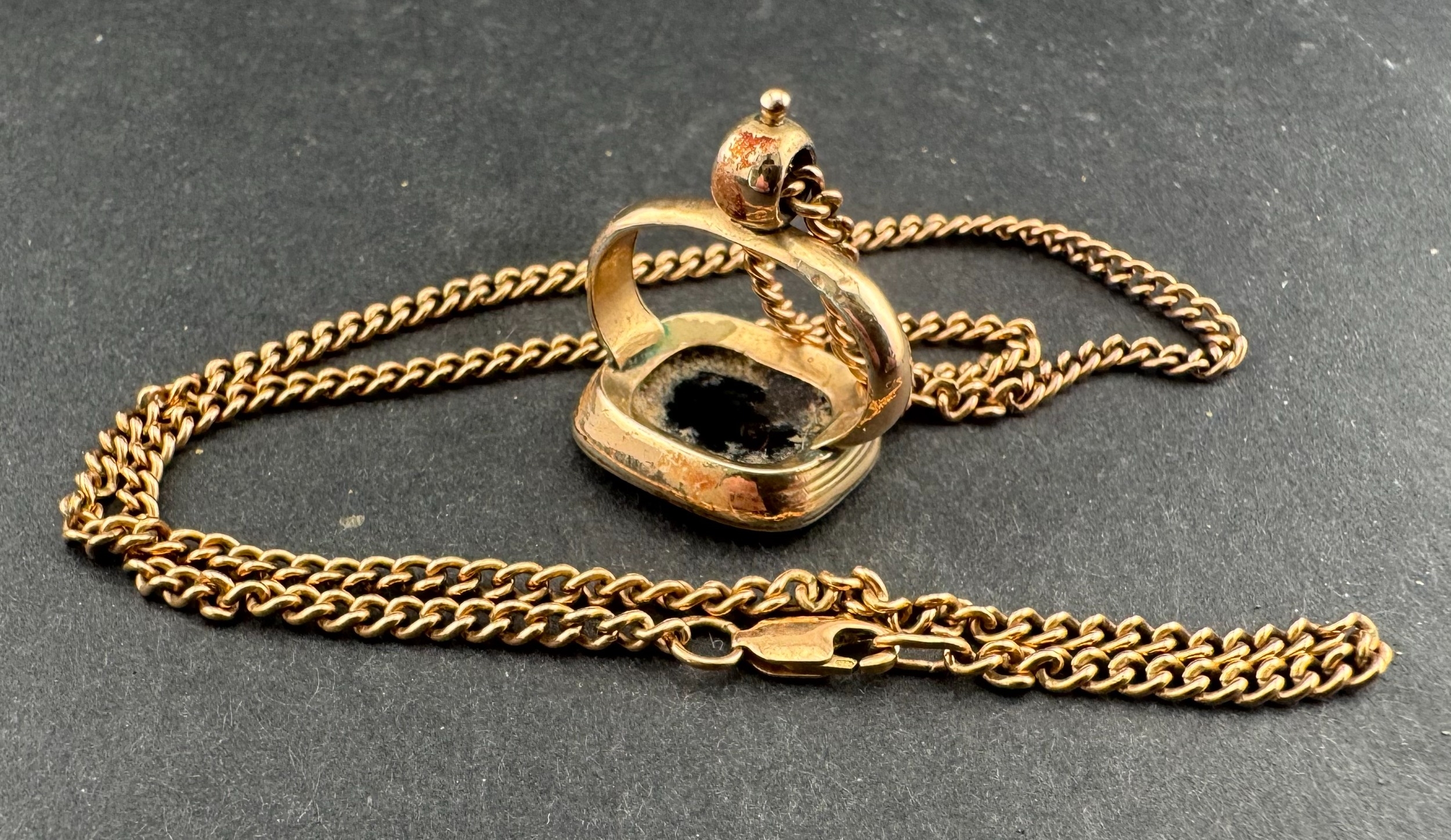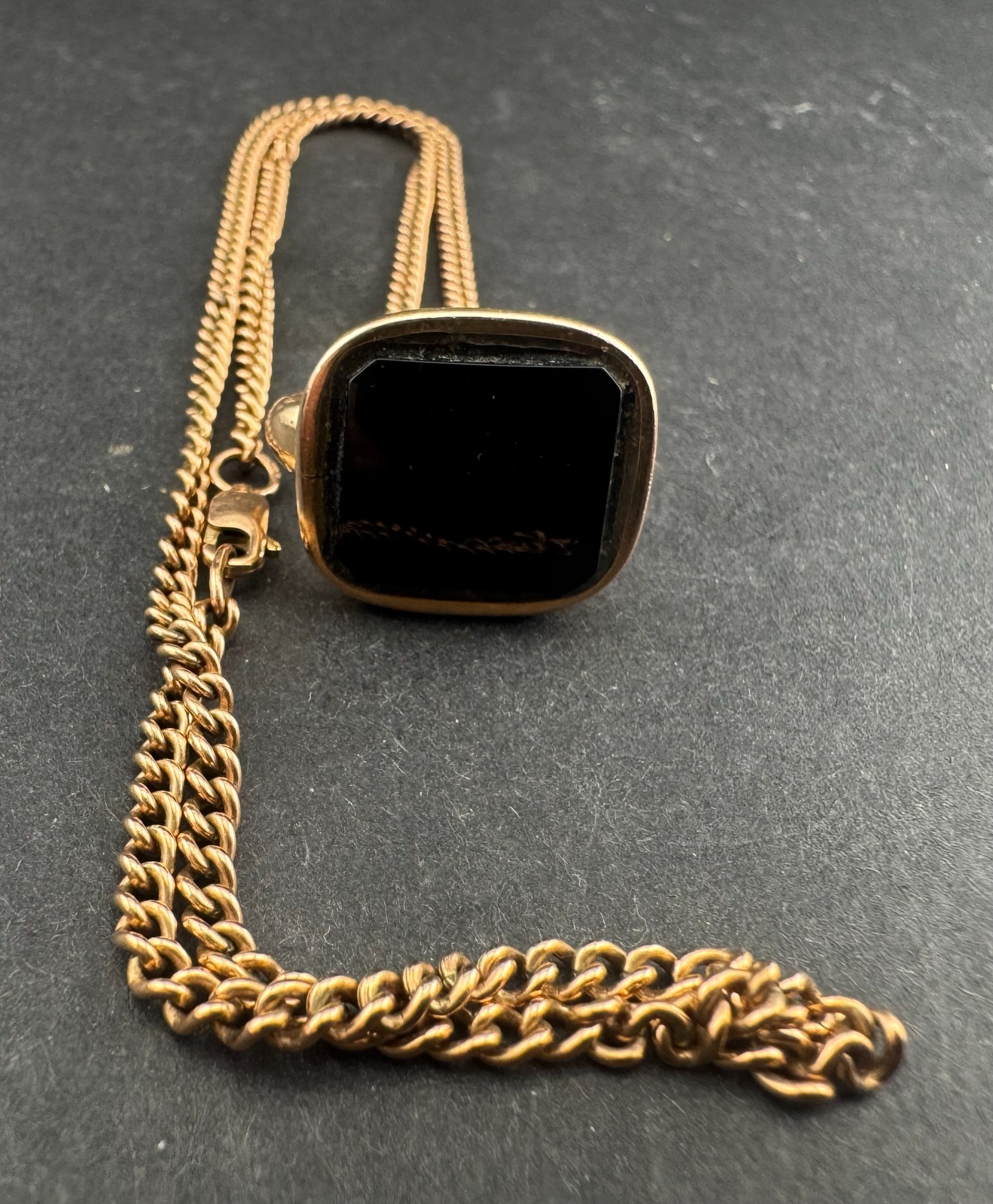 Jewellery: a gold cased fob seal with unengraved onyx table, 6.6g, togther with a 47cm 9ct gold curb link chain, 11.1g.
