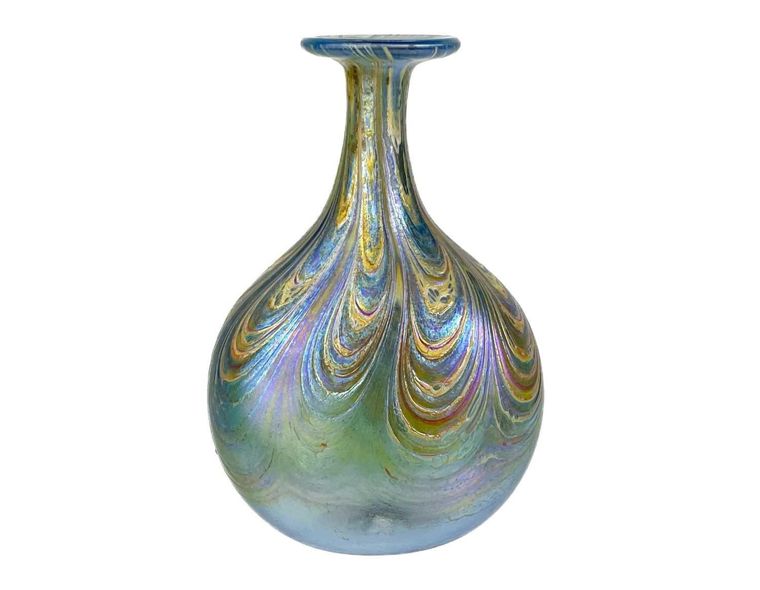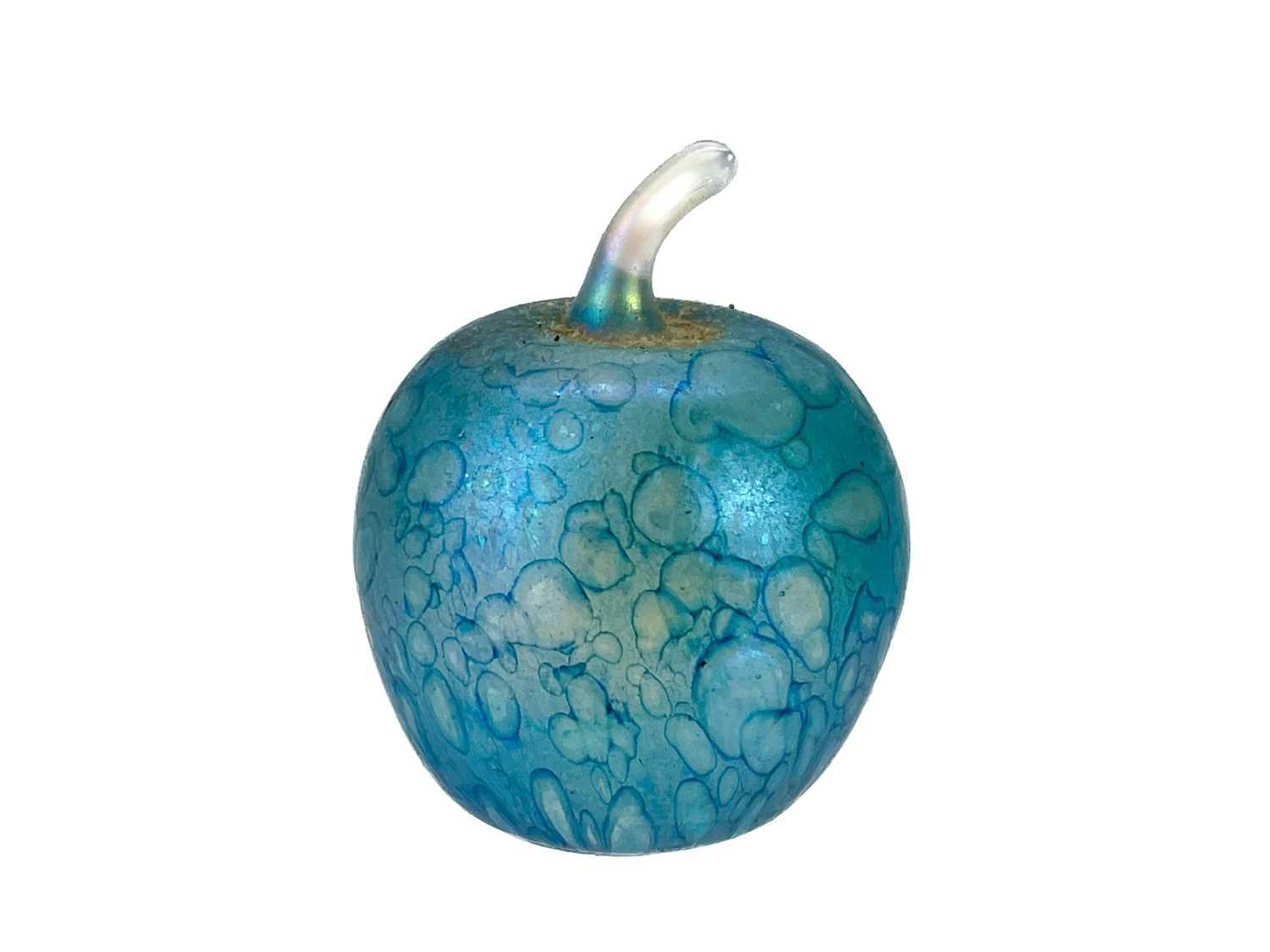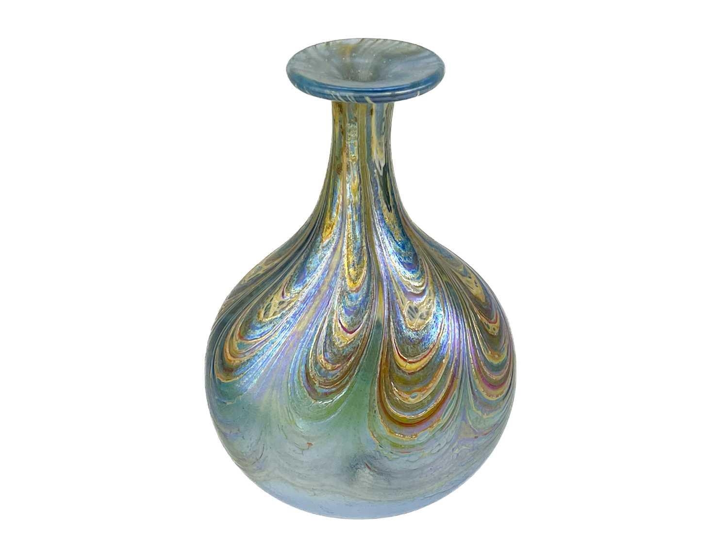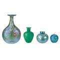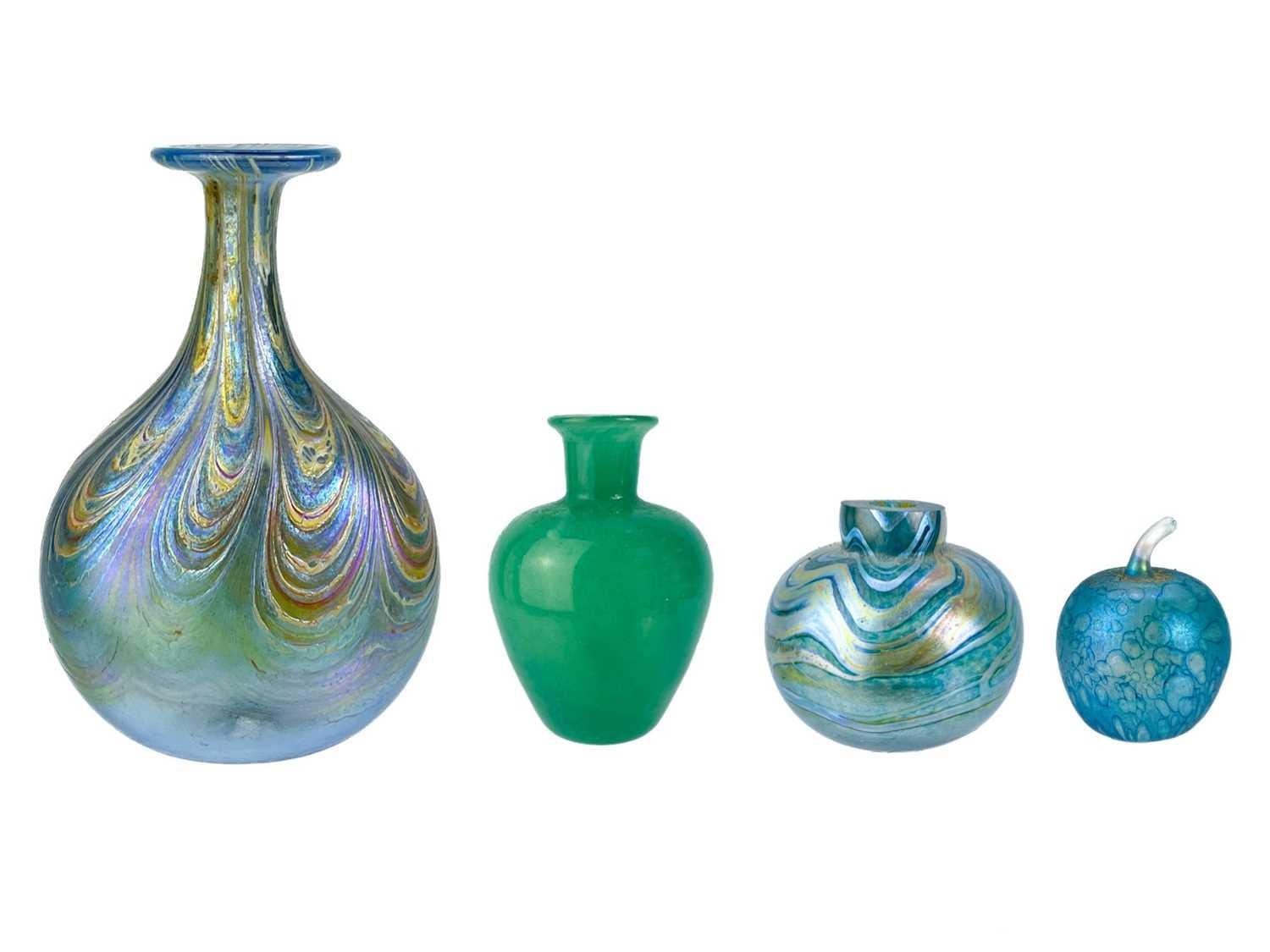 A small Norman Stuart Clarke art glass iridescent vase. Date 1985. Together with a larger art glass vase, a small green vase and a glass apple (4).
