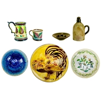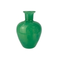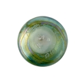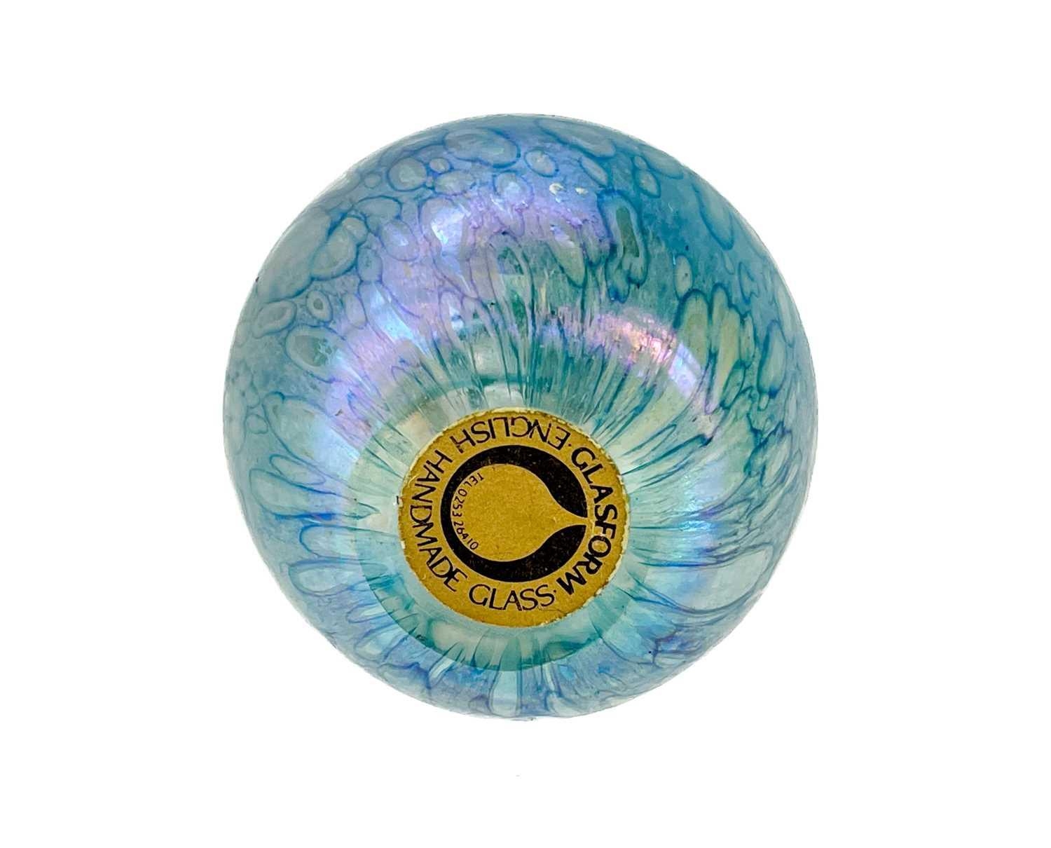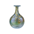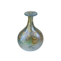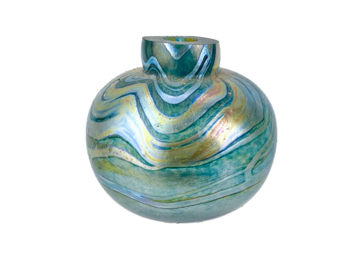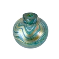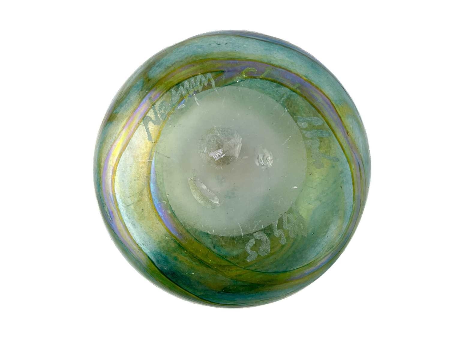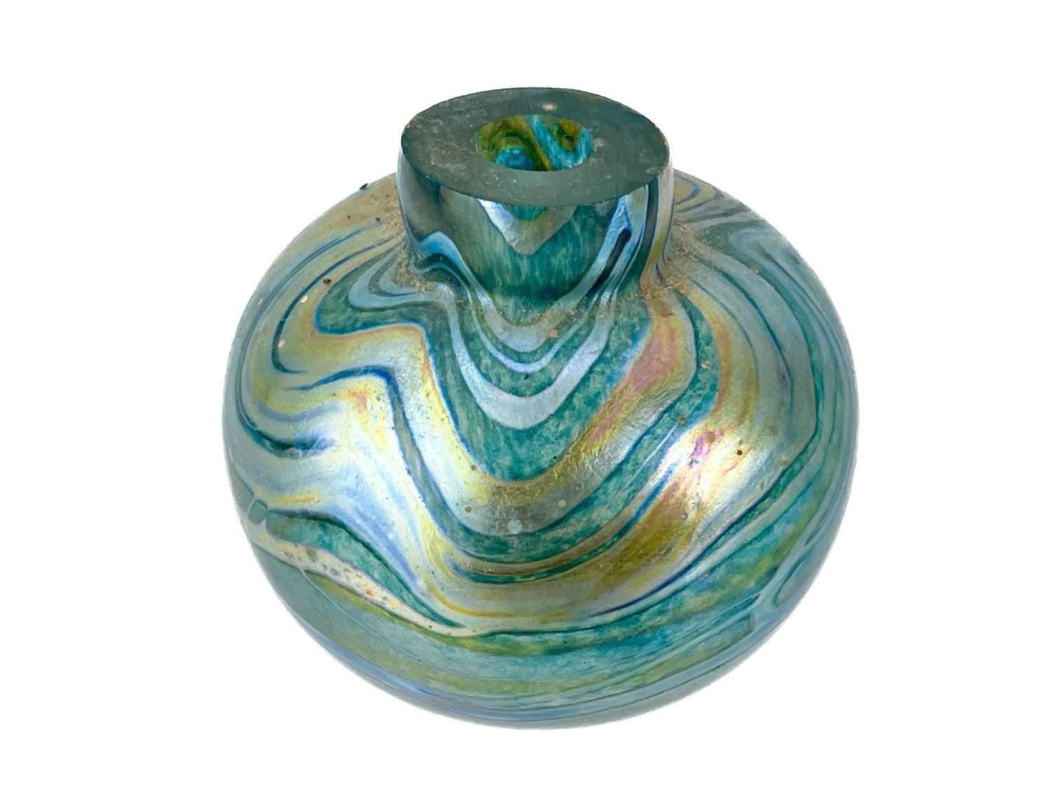A small Norman Stuart Clarke art glass iridescent vase. Date 1985. Together with a larger art glass vase, a small green vase and a glass apple (4).