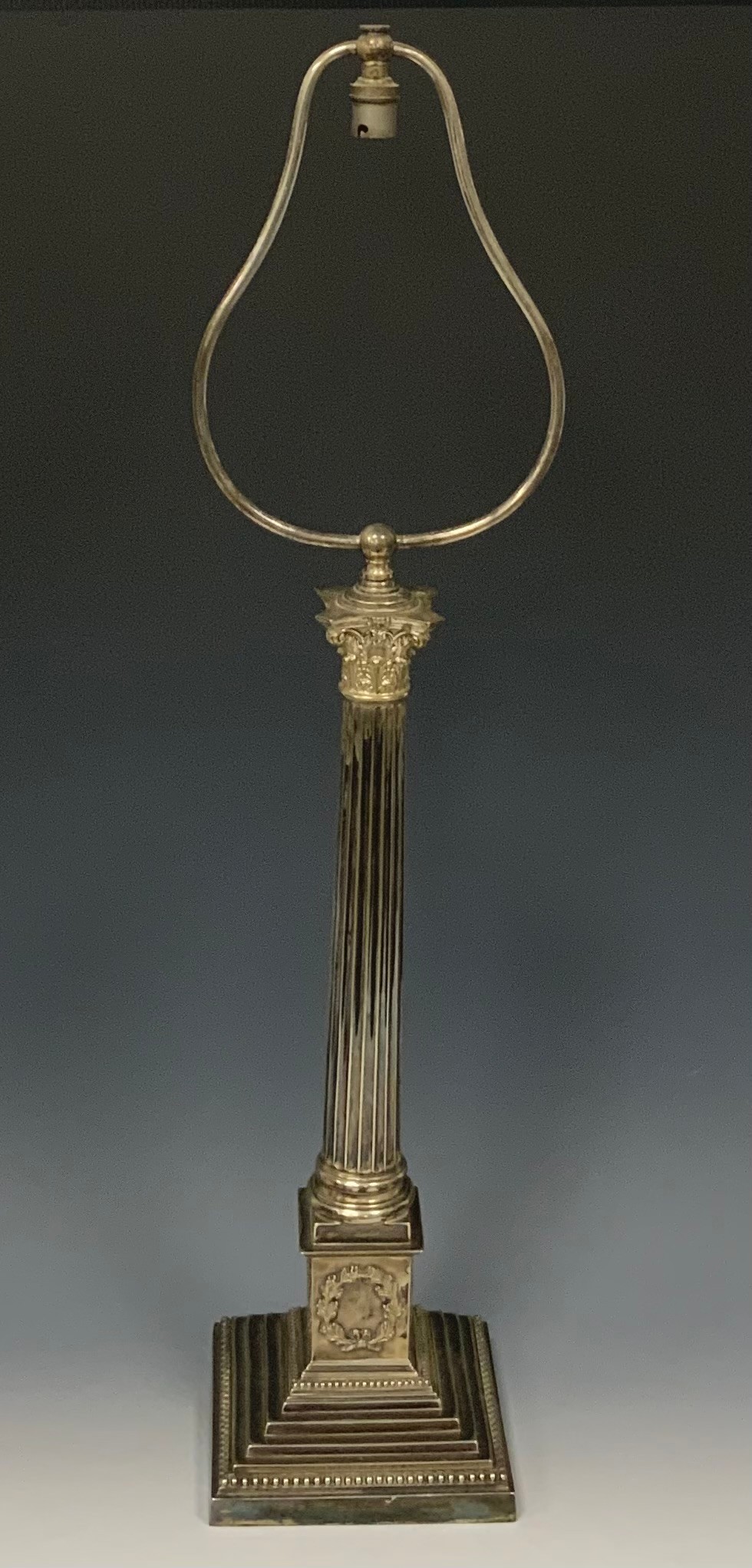 An early 20th century E.P.N.S Corinthian column table lamp, stepped square base applied with laurel wreaths, beaded borders, 83cm high overall