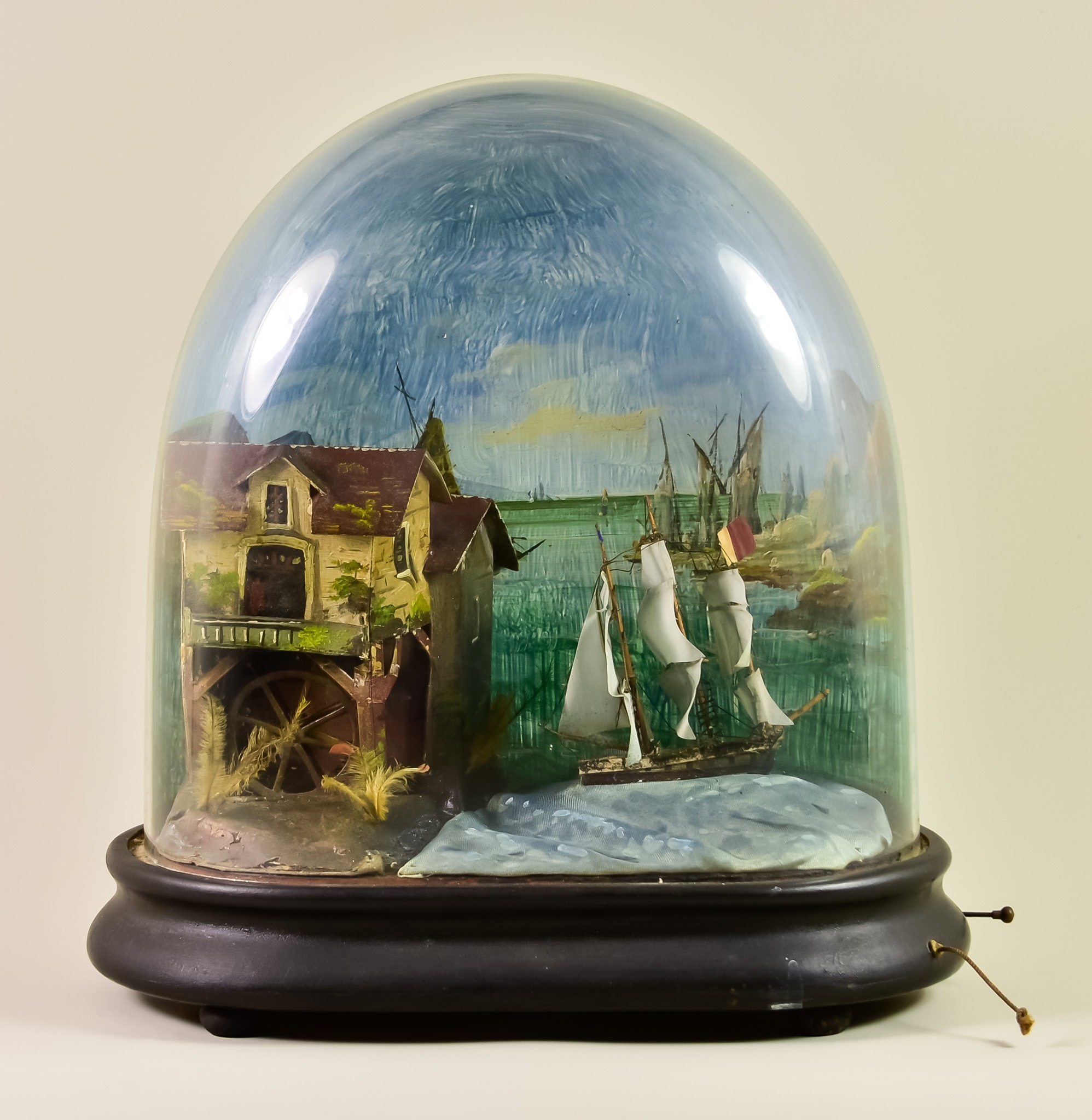 A Musical Ship Automaton, 19th Century, with three masted ship in coved harbour, with building to left with water wheel, painted craggy coastline to background, on ebonised base and under glass dome, 13.5ins high