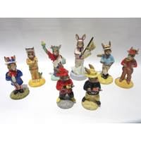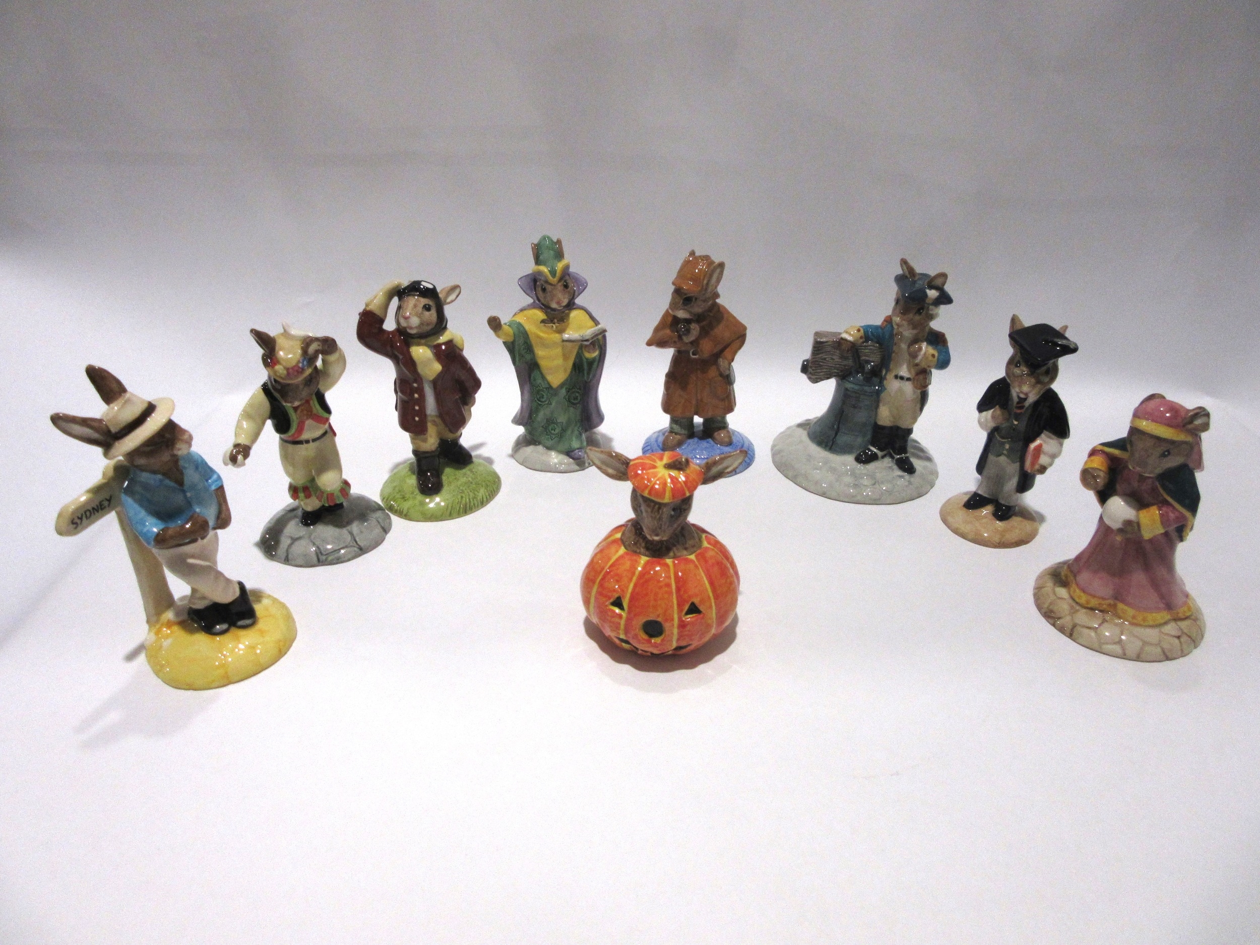 Nine Royal Doulton Bunnykins figures - "Liberty Bell Bunnykins", "Sydney Bunnykins", "Mystic Bunnykins", "Fortune Teller Bunnykins", "Detective Bunnykins", "Airman Bunnykins", "Schoolmaster Bunnykins", "Morris Dancer Bunnykins" and "Halloween Bunnykins"