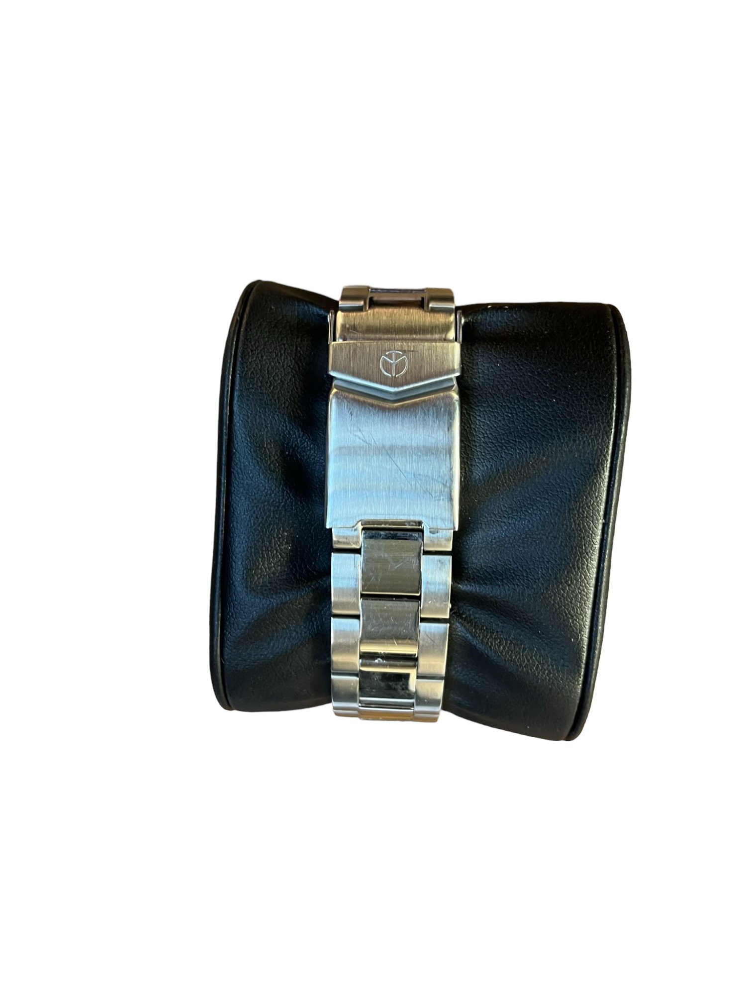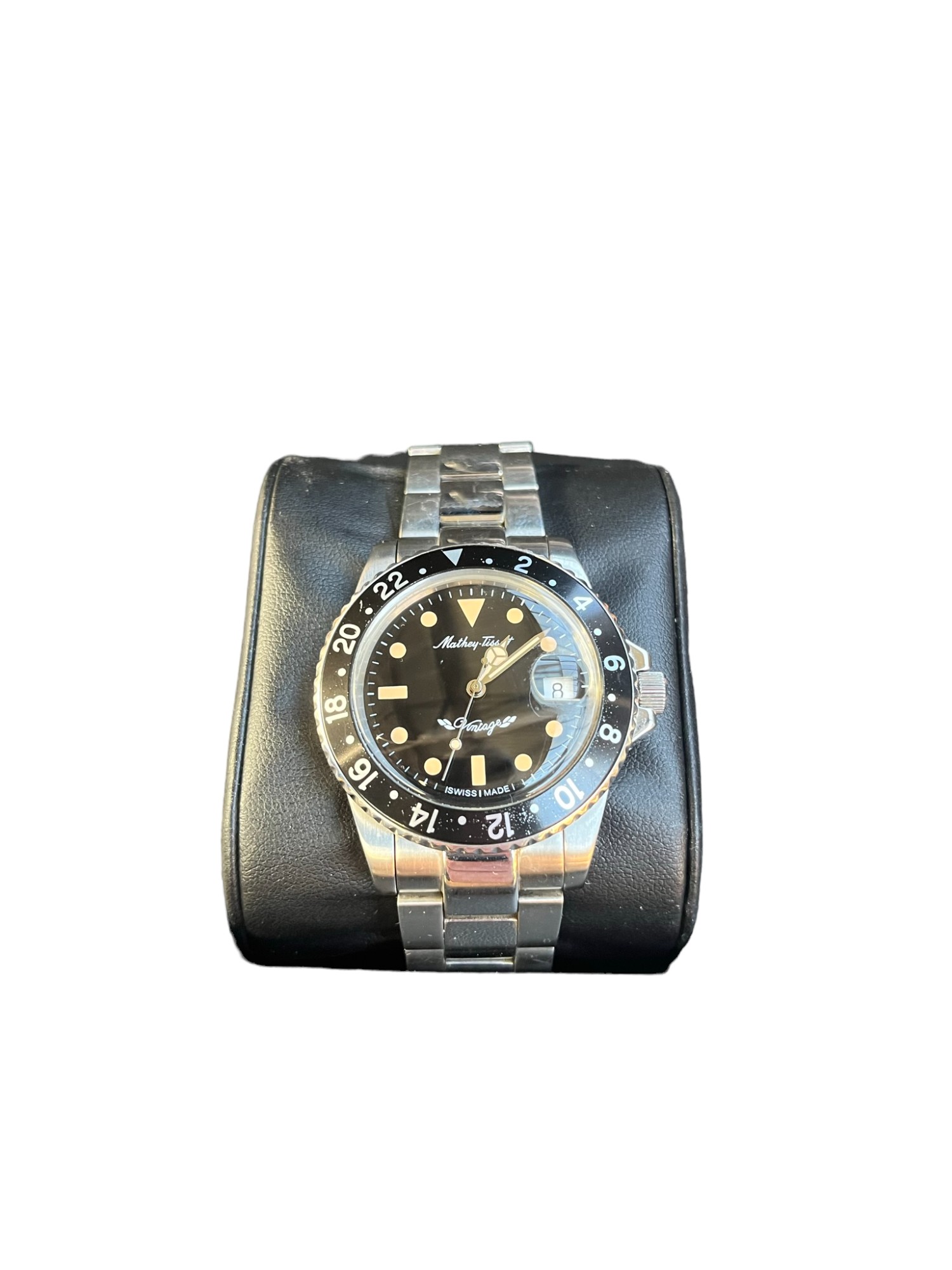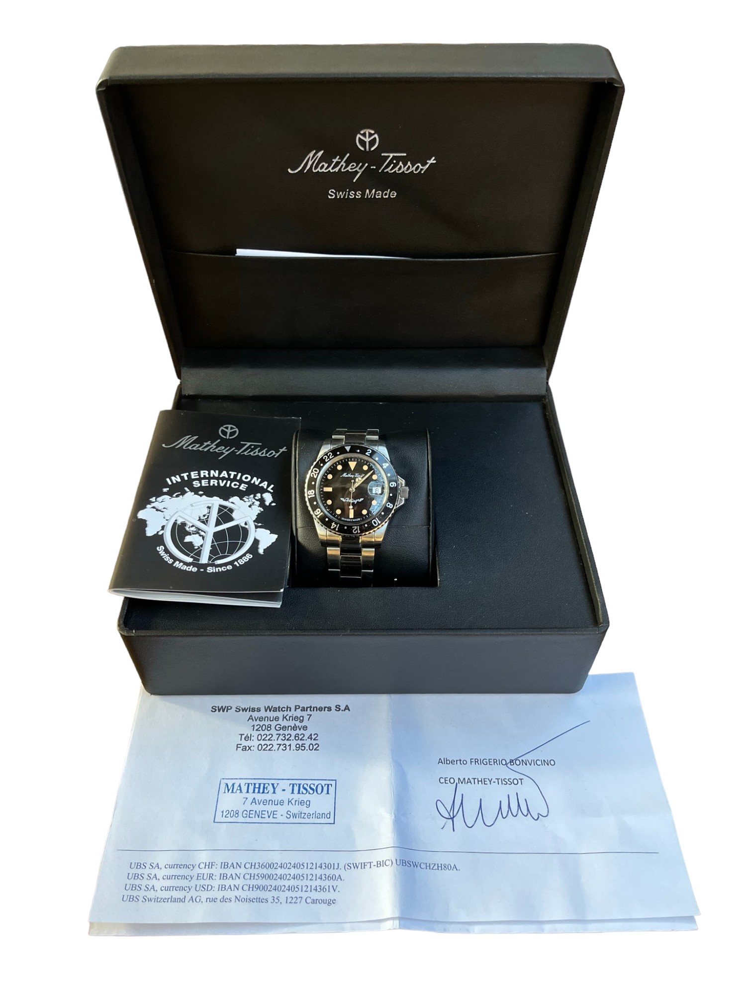 A Mathey-Tissot gentleman's stainless steel wristwatch, c.2017, automatic 28-jewelled lever movement, black dial, luminous batons, dots, triangle and Mercedes hands and magnified date aperture within a unidirectional black and silver 24 hour bezel, case No H900ATN, on original stainless steel bracelet, approximately 38mm diameter, box and papers plus extra links for bracelet