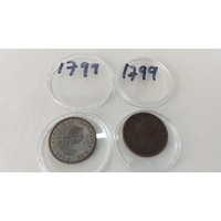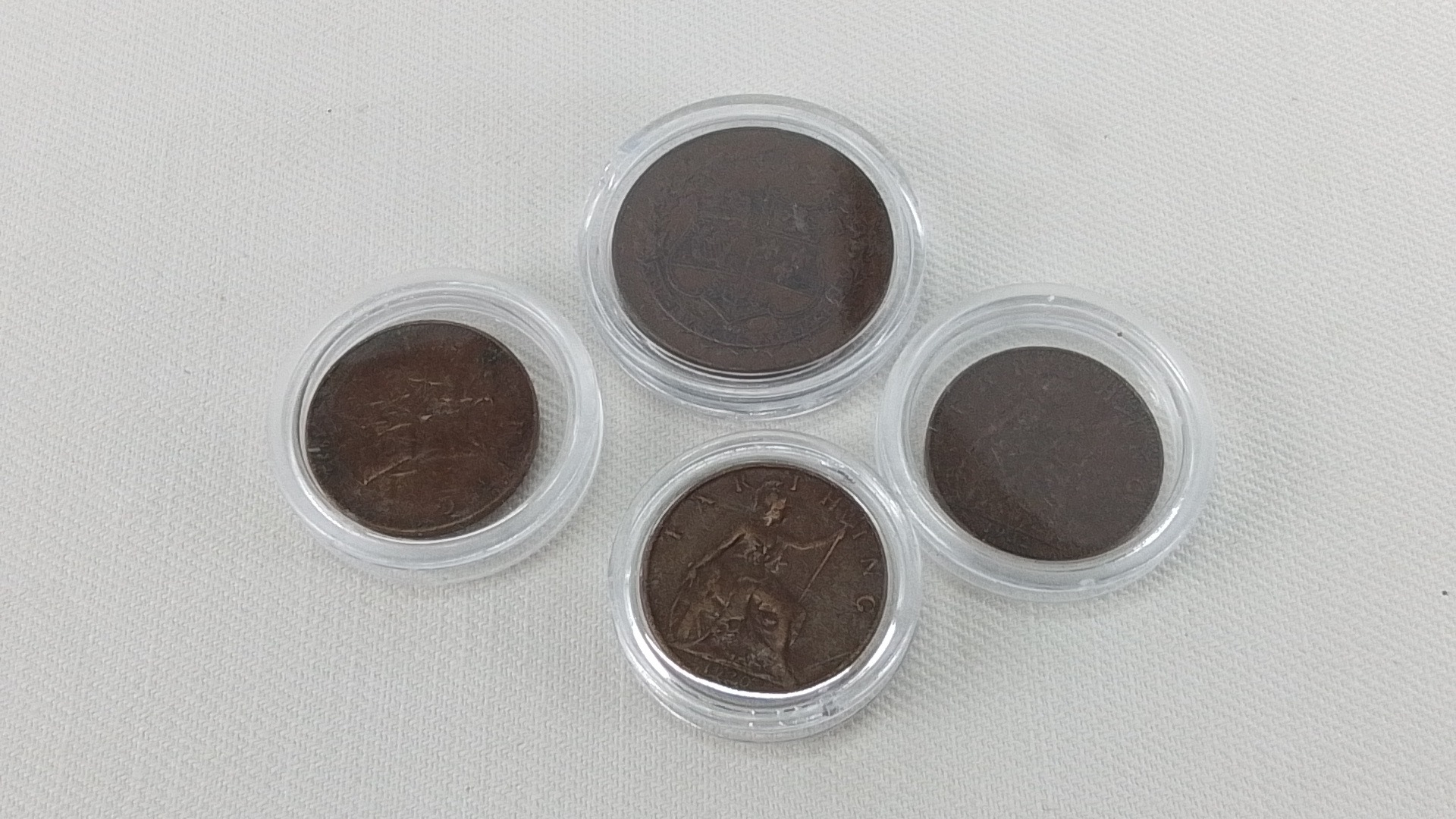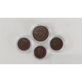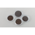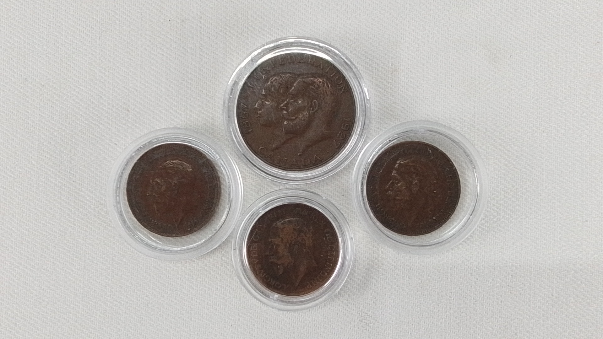 4 British bronze pennies, each in a clear coin capsule, including a Canadian 1927 coin and three farthings dated 1920, 1930, 1932.