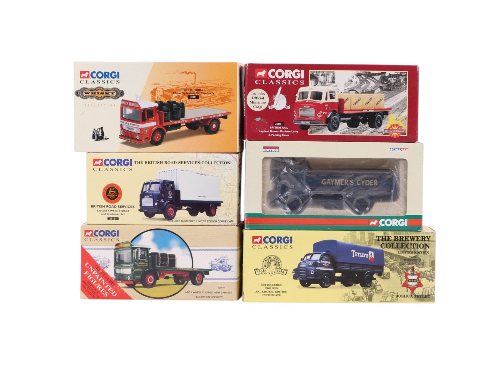Assorted Corgi Classic diecast commercial vehicles, British Road Services Leyland four wheeled flat bed, 25101, AEC 4 wheel flat bed with barrels ( Federation Brewery ), 97370, Bedford S canvas side set ( Joshua Tetley ), 19702, British Rail Leyland beaver platform lorry and packing cases, 25001, Austin four wheeled dray and creates ( Gaymers Cider ), CC13310 and Albina Clydesdale platform lorry ( Whitehorse ), 21001, all boxed (6).