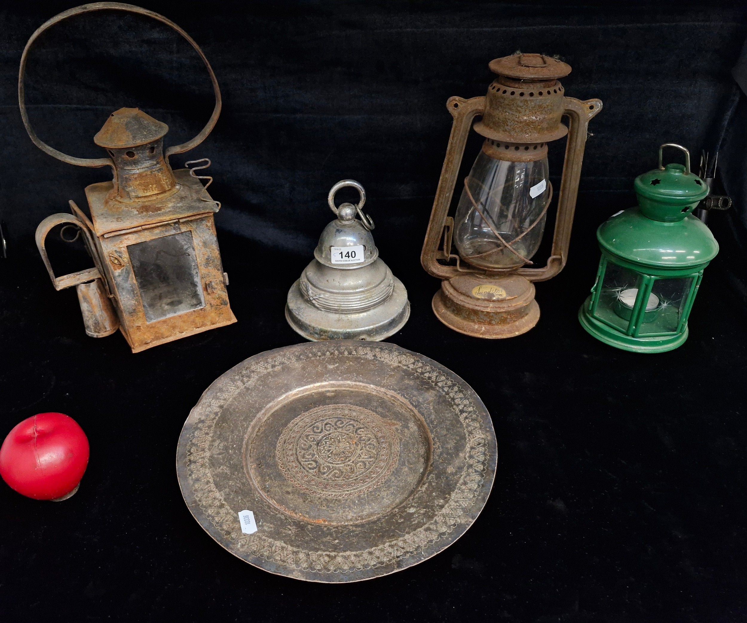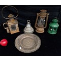 A mixed lot of five items including an antique engraved silverplate platter stamped 'Intercontinental Hotels Ireland' to base, a vintage Sandstar hurricane oil lantern and a vintage railway lantern.