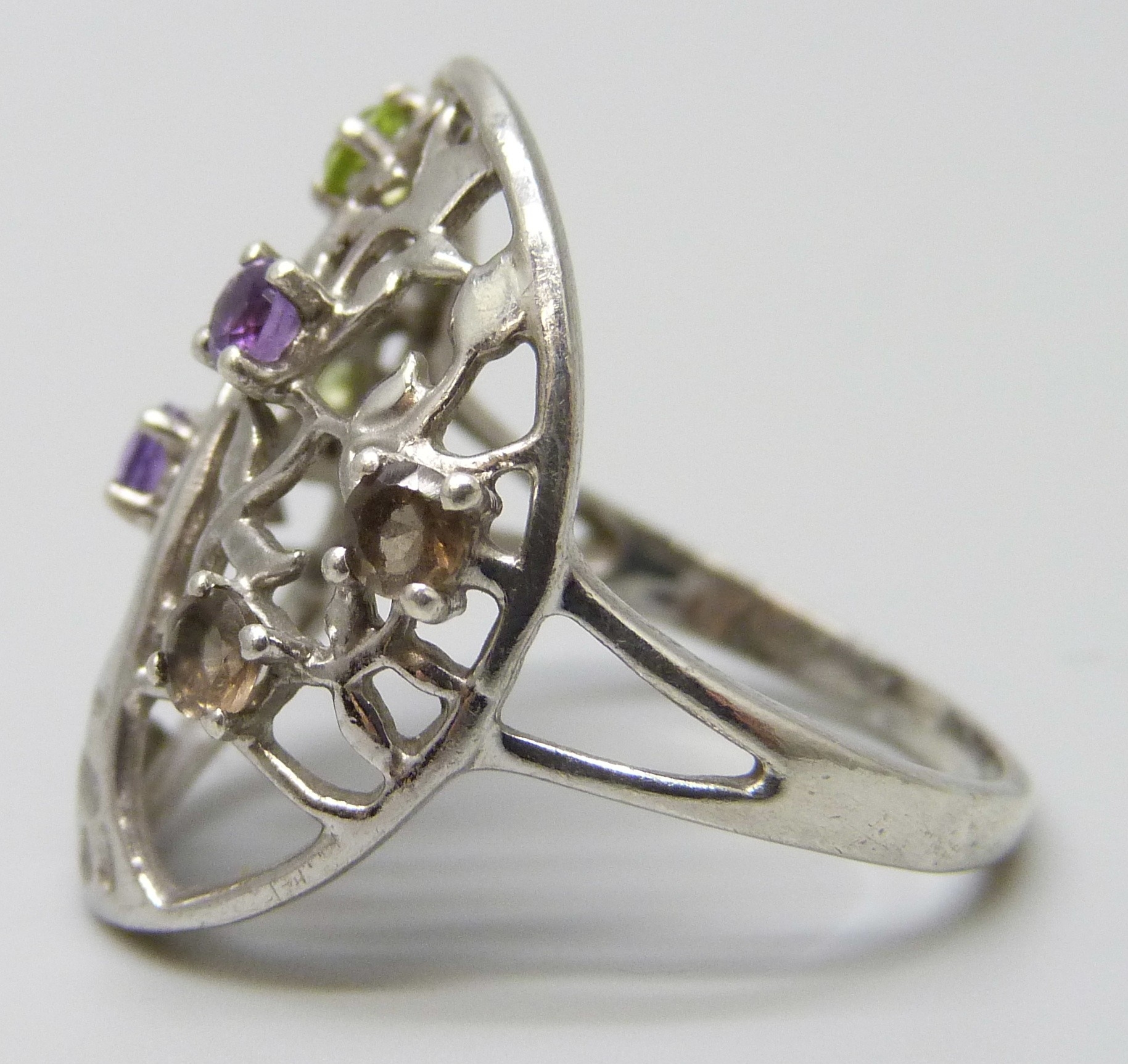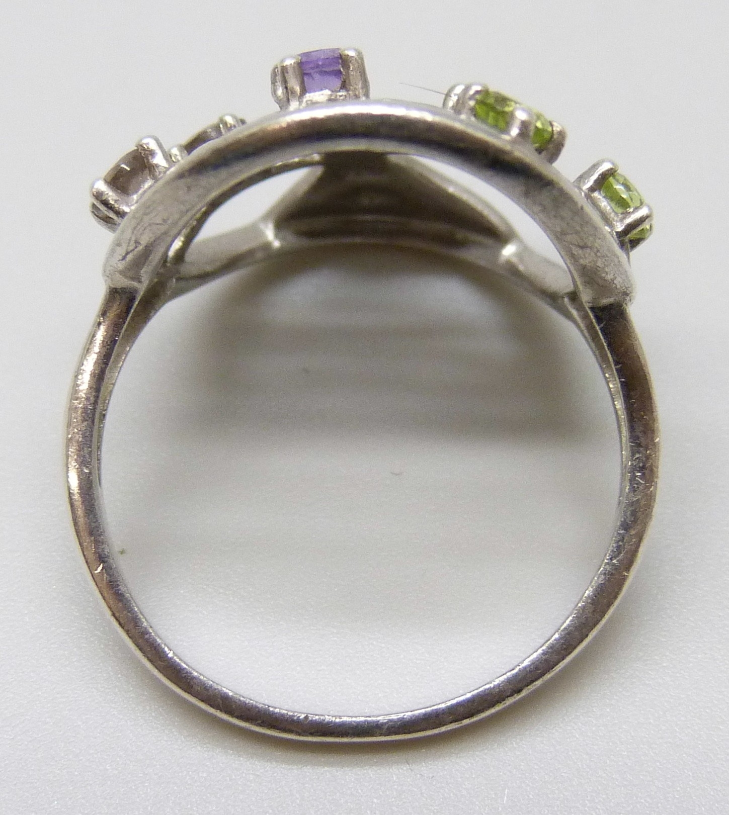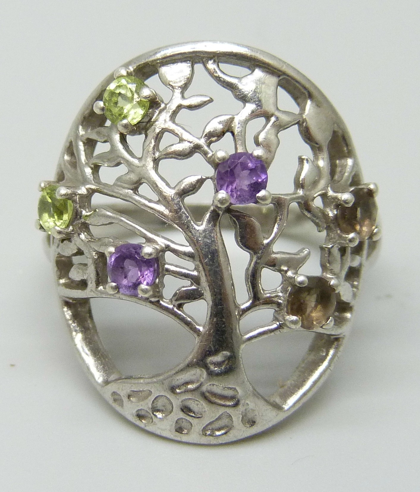 A silver Tree of Life ring set with peridot, amethyst and smoky quartz, S