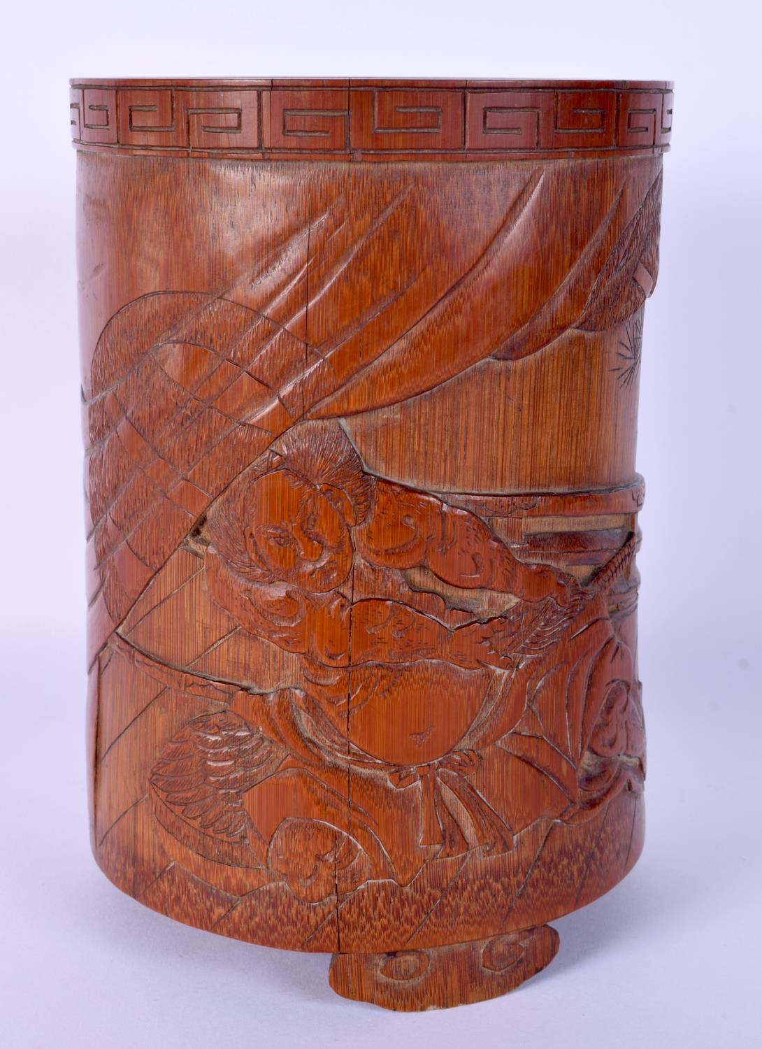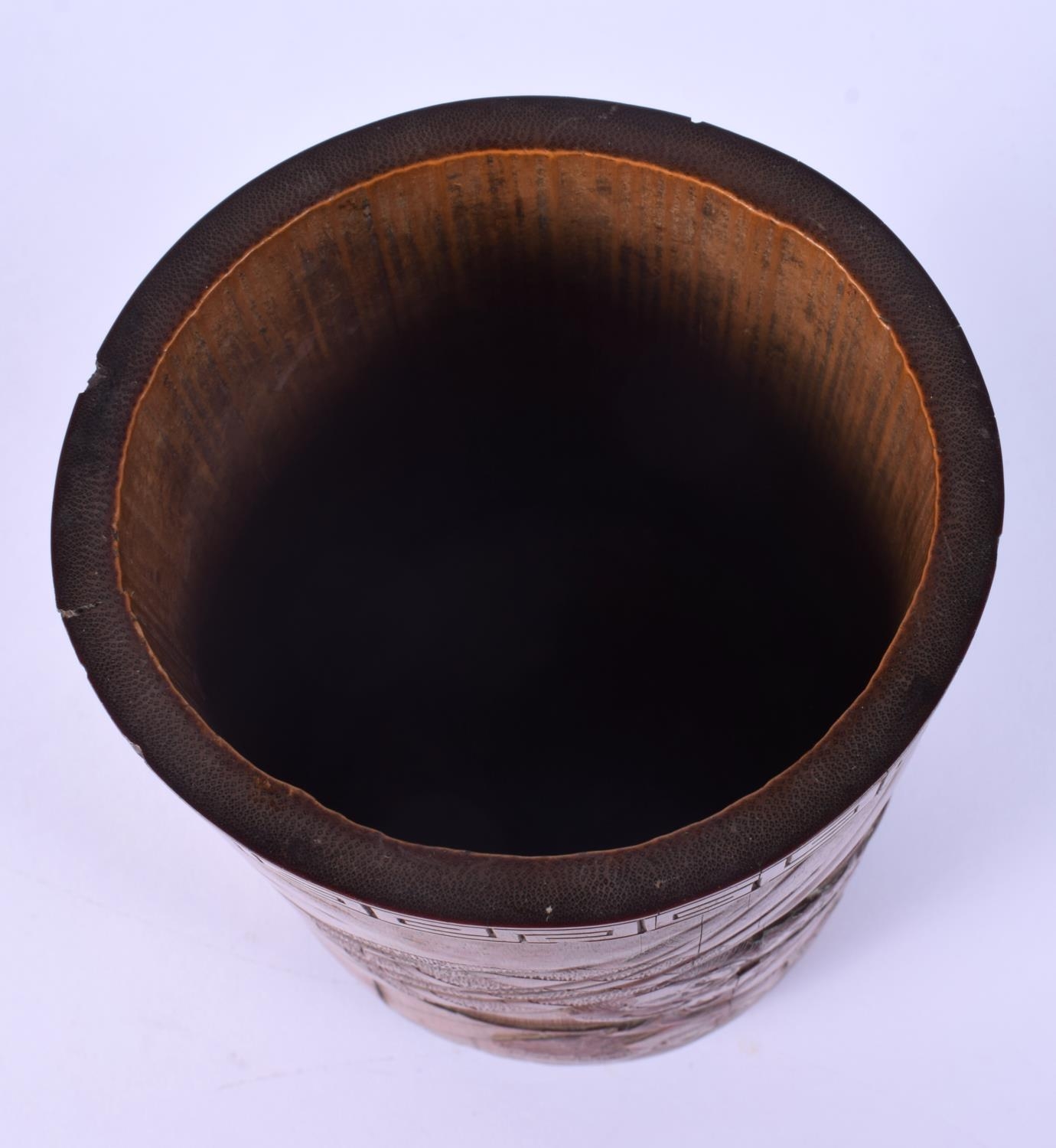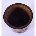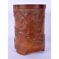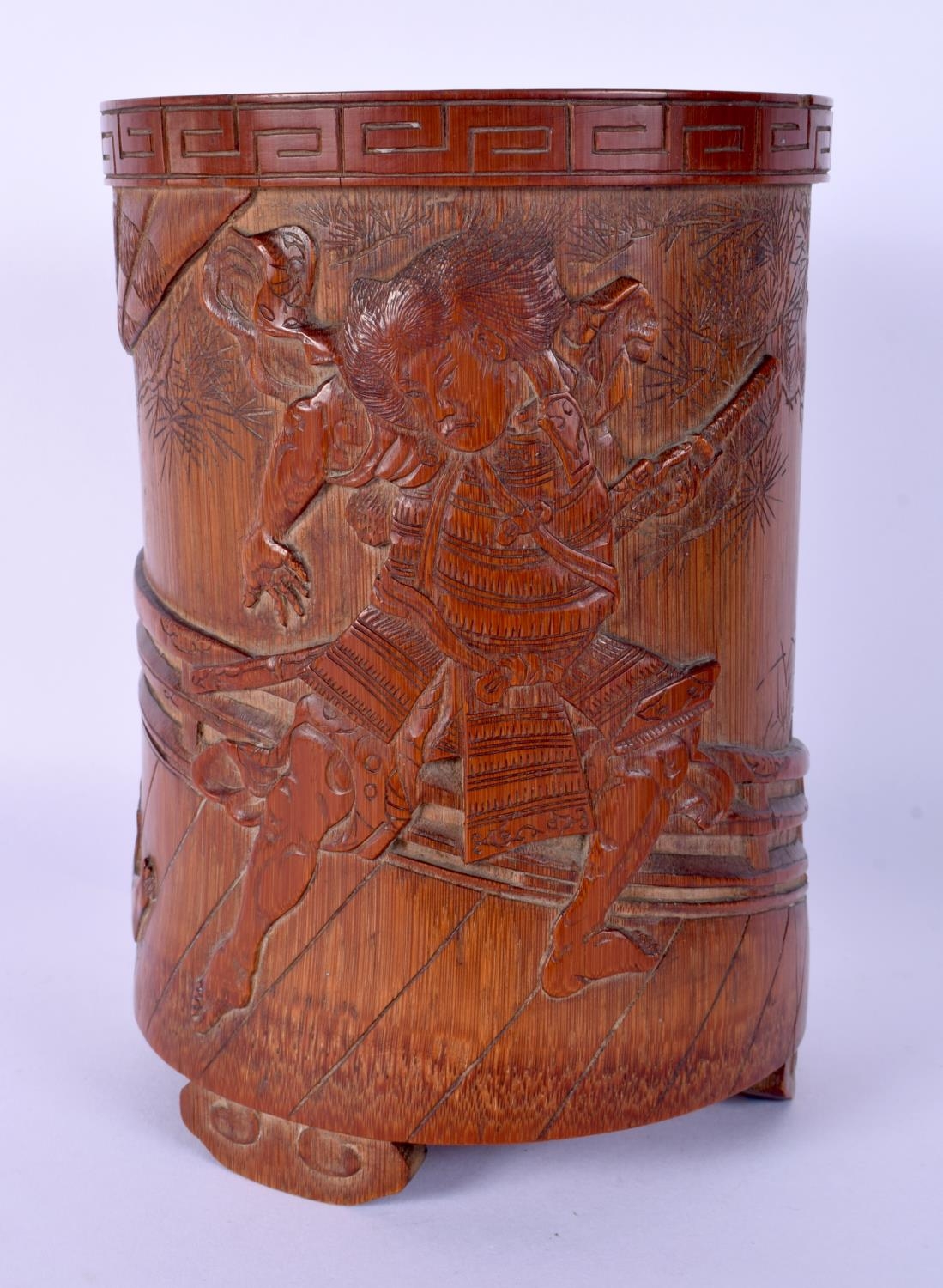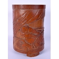 A FINE 19TH CENTURY JAPANESE MEIJI PERIOD CARVED BAMBOO BRUSH POT decorated with samurai fighting. 17 cm x 10 cm.