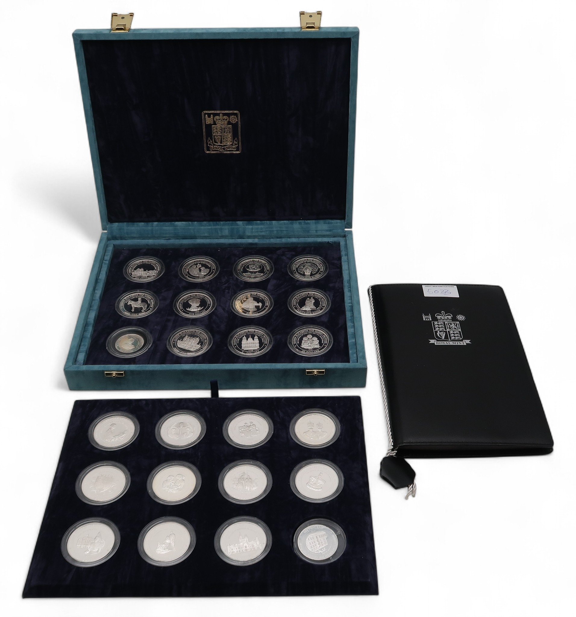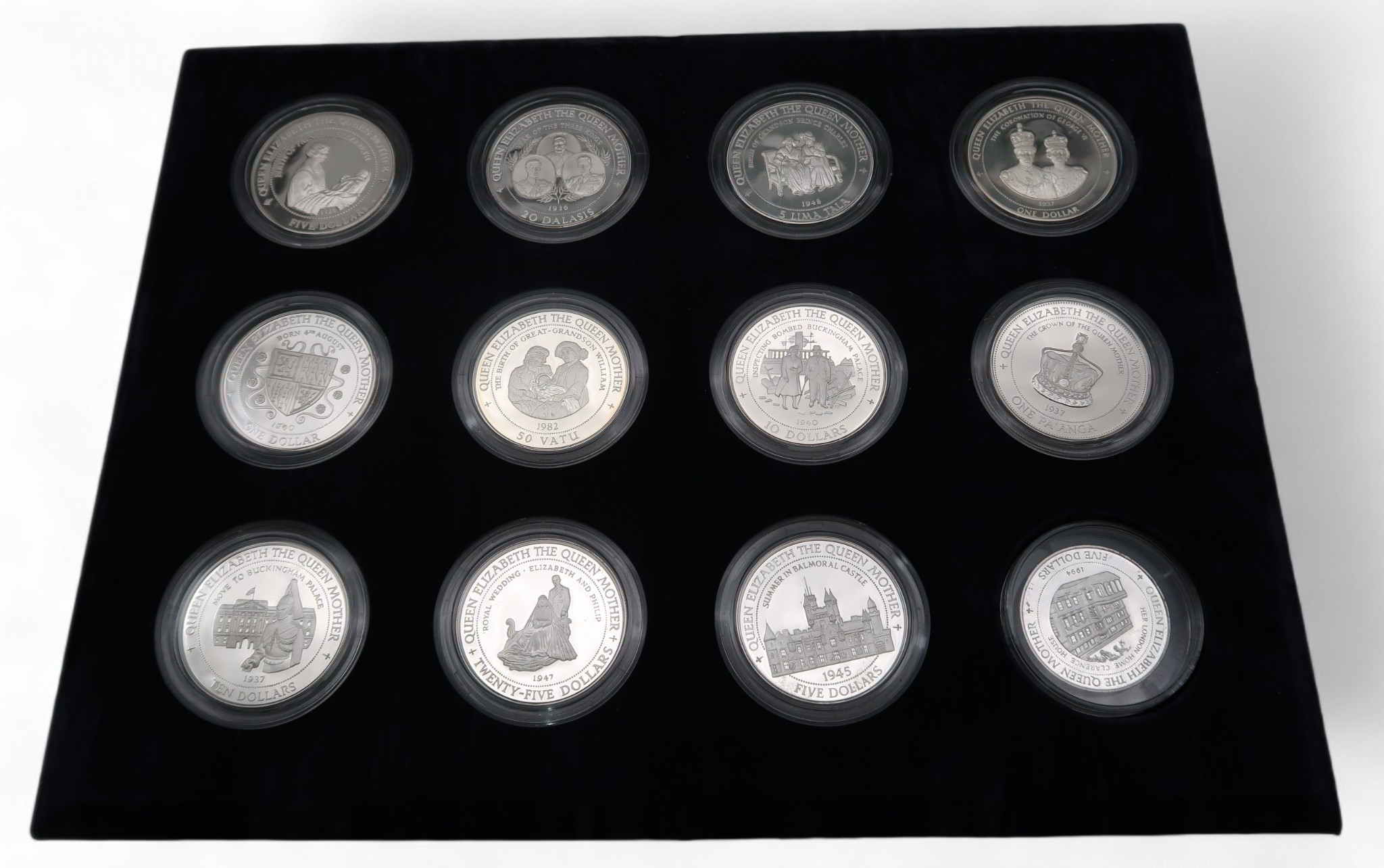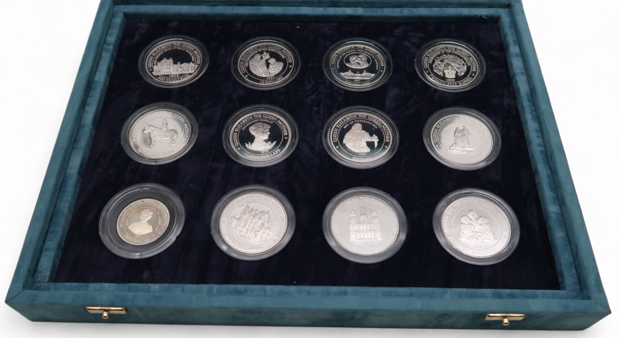 Queen Elizabeth The Queen Mother a cased set of 24 silver coins all with certificates except 1994 Cook Islands, 1995 Cook Islands, 1994 Samoa and 1994 Barbados
