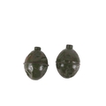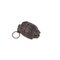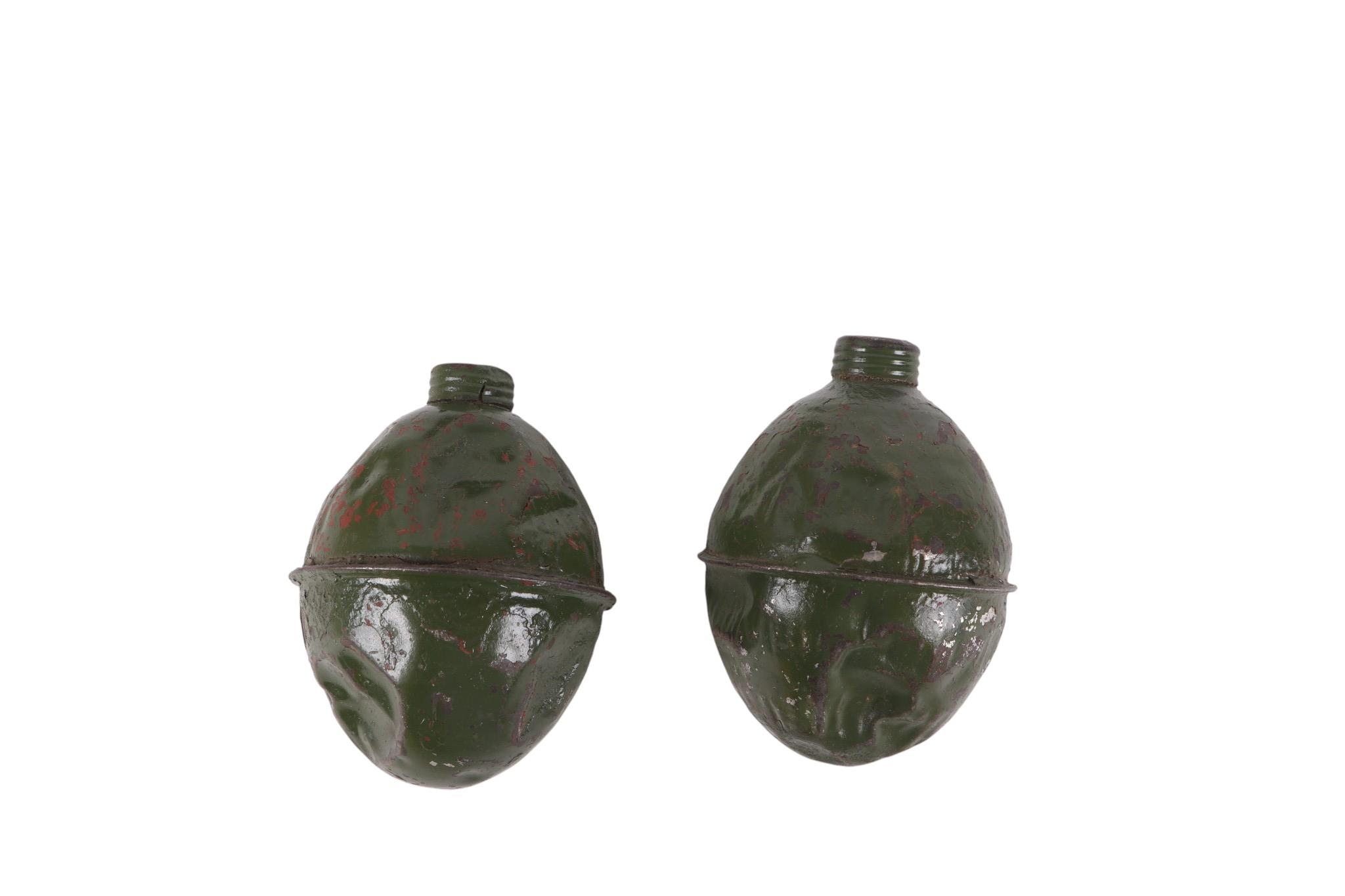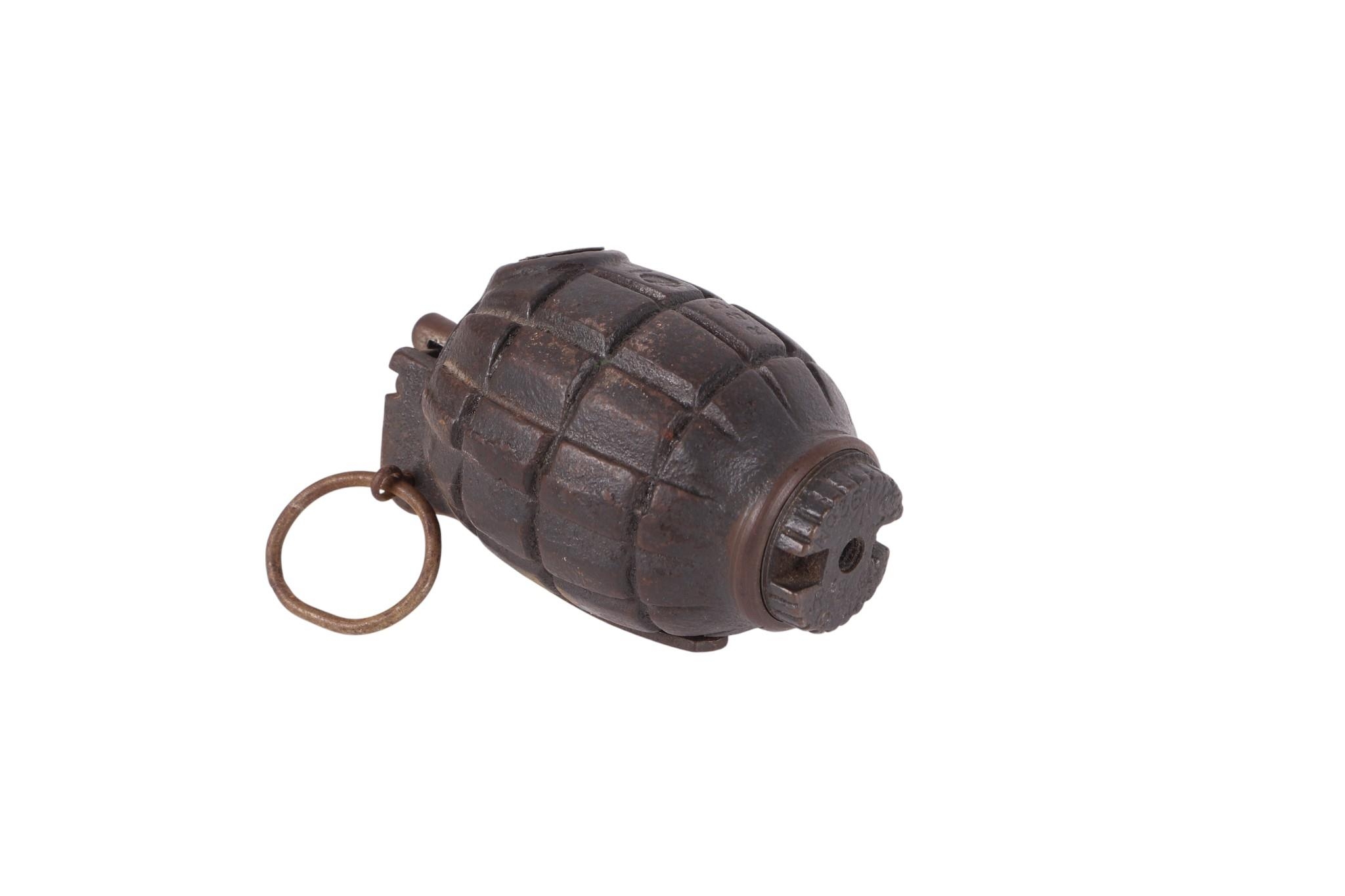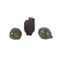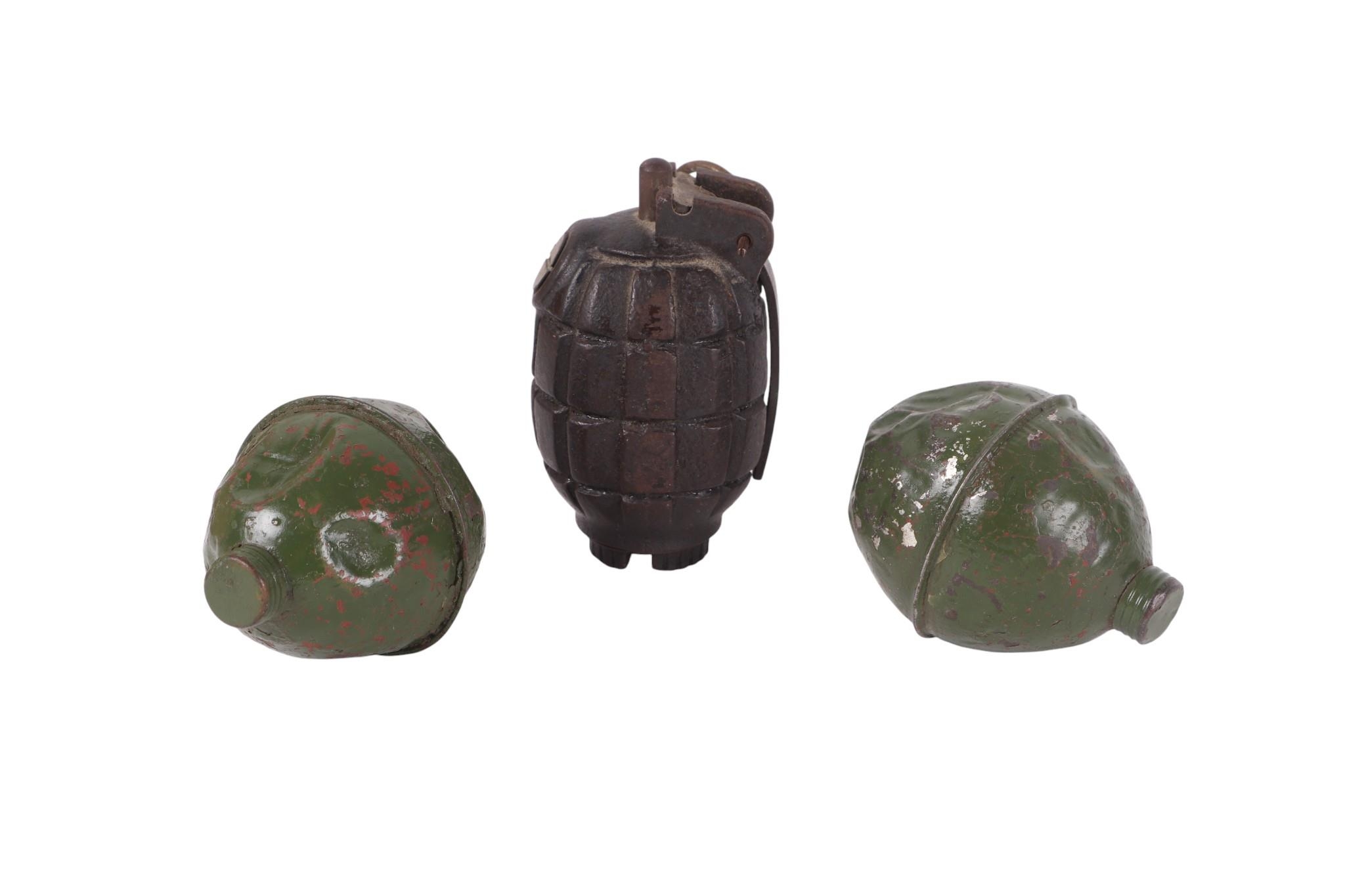 A complete inert WWII British No.36M Mills Grenade 10cms high, together with two post war inert dummy hand grenades painted green. Approximately 8cms high by 6cms diameter. (3)