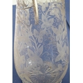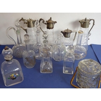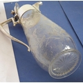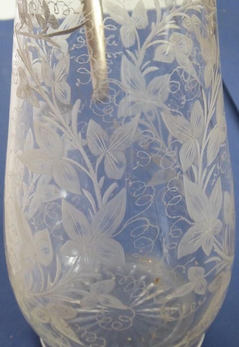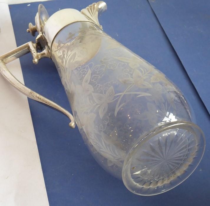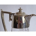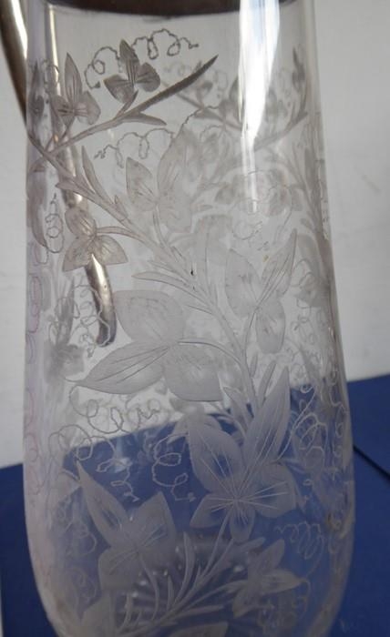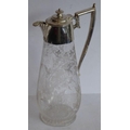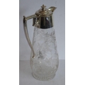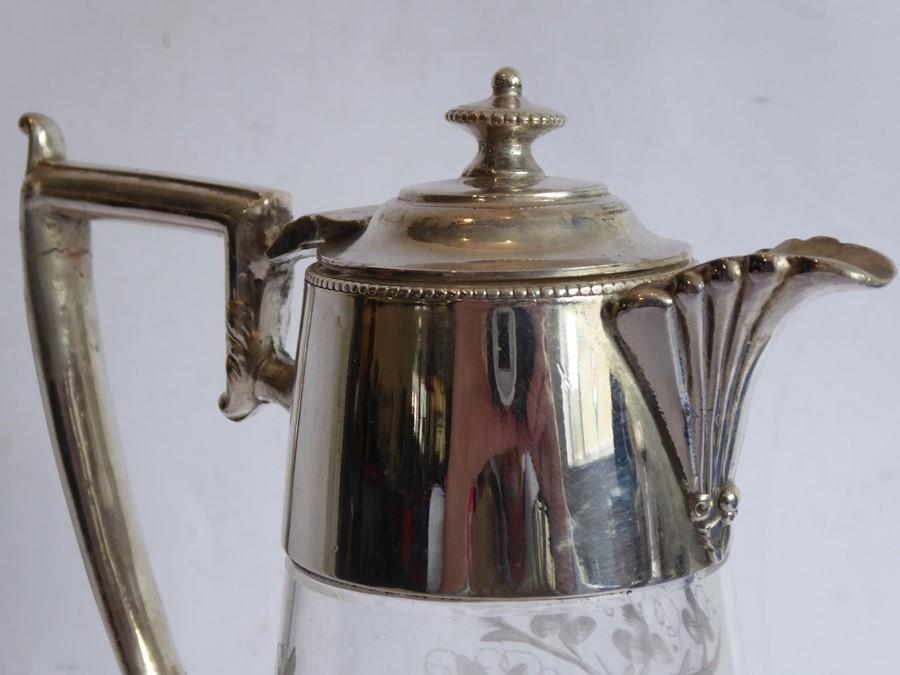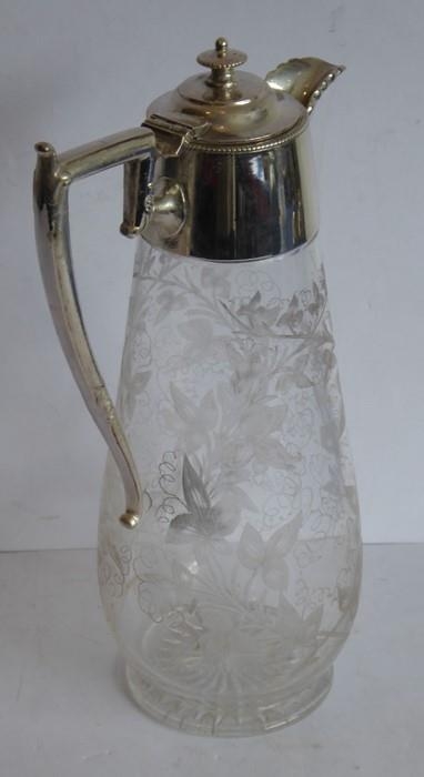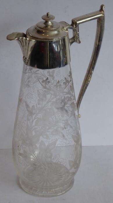 A late 19th century baluster-shaped glass claret jug with silver-plated mounts; the main body very finely engraved with scrolling tendrils and leaves etc., on circular foot with star-cut base (27cm high)