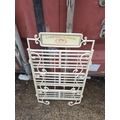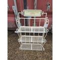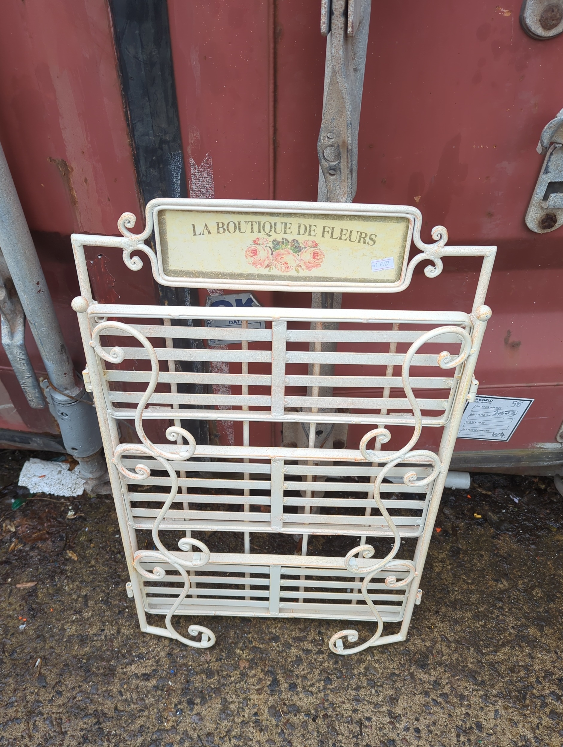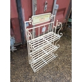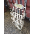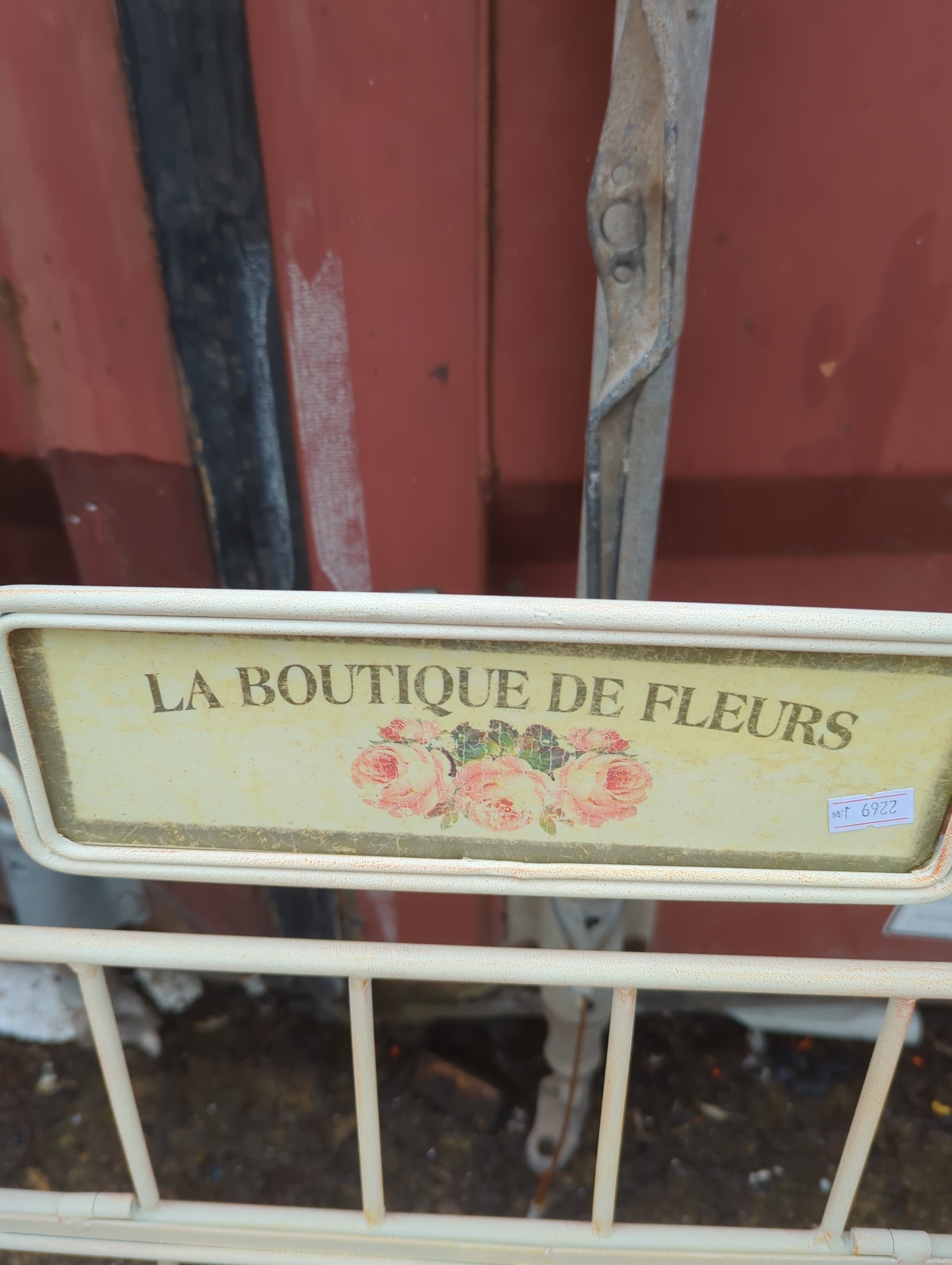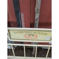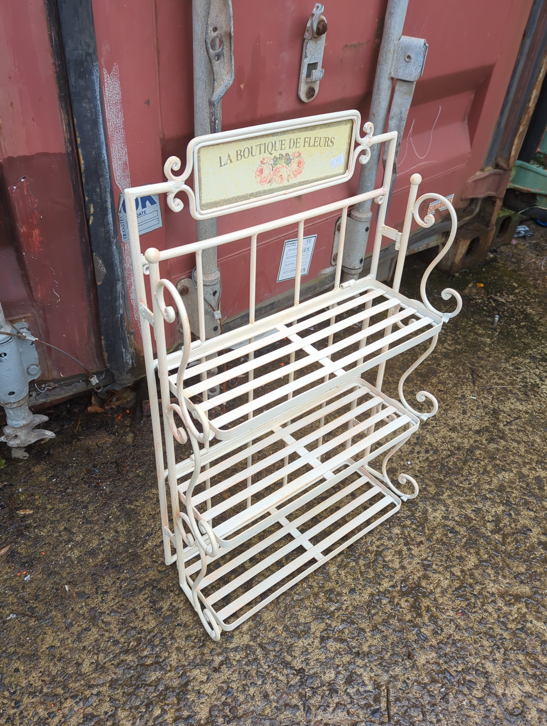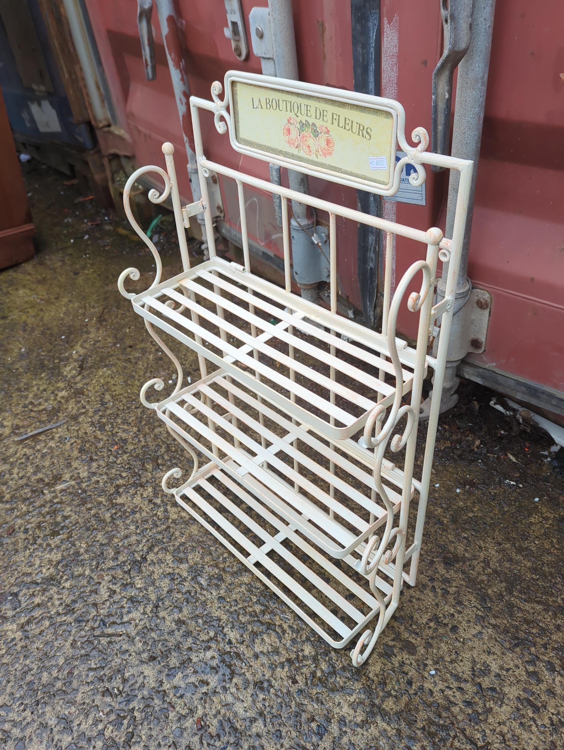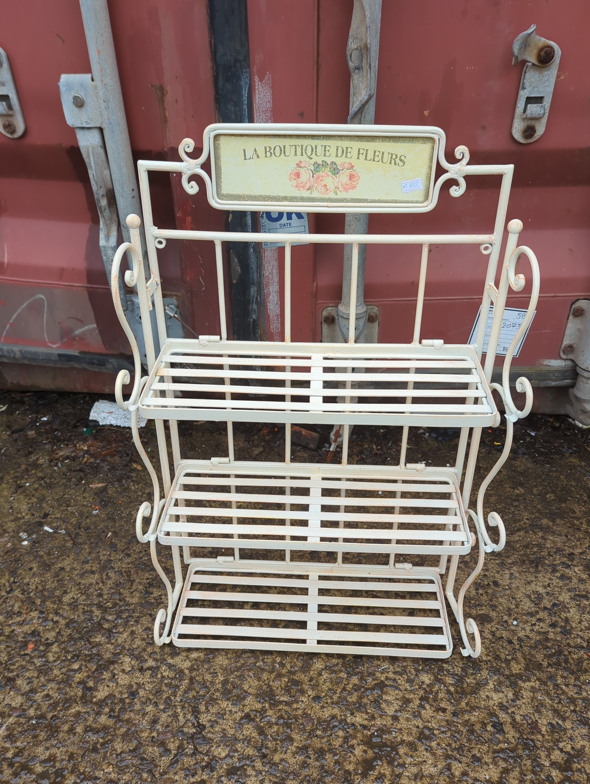 This decorative metal plant stand features a charming sign reading "La Boutique de Fleurs," adding a touch of French elegance to any outdoor space. The stand includes three shelves made of metal slats, supported by ornate scrollwork on the sides. Its cream colour provides a neutral backdrop, ideal for displaying a variety of potted plants or flowers.