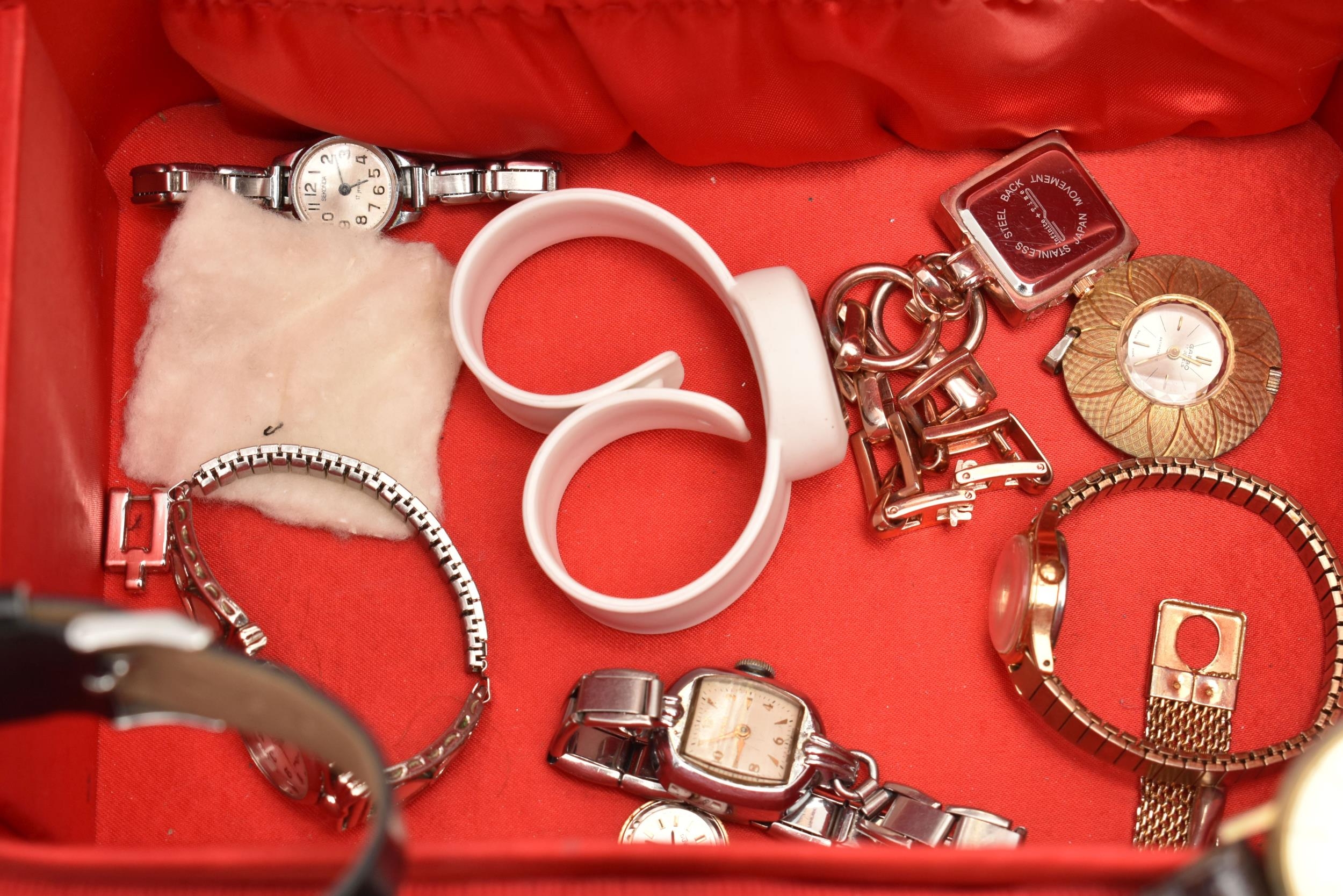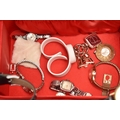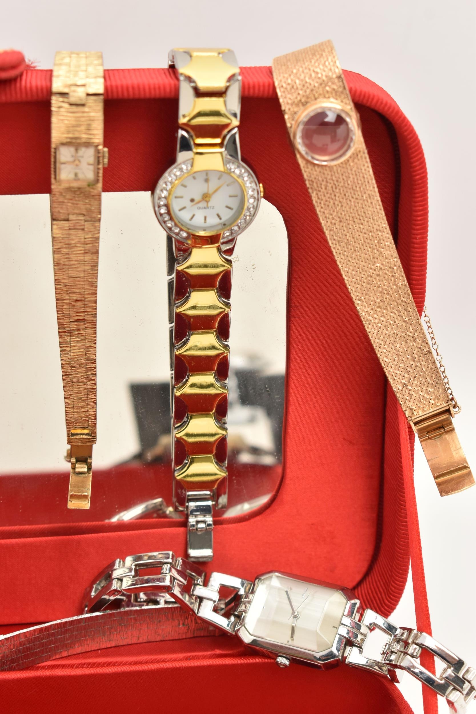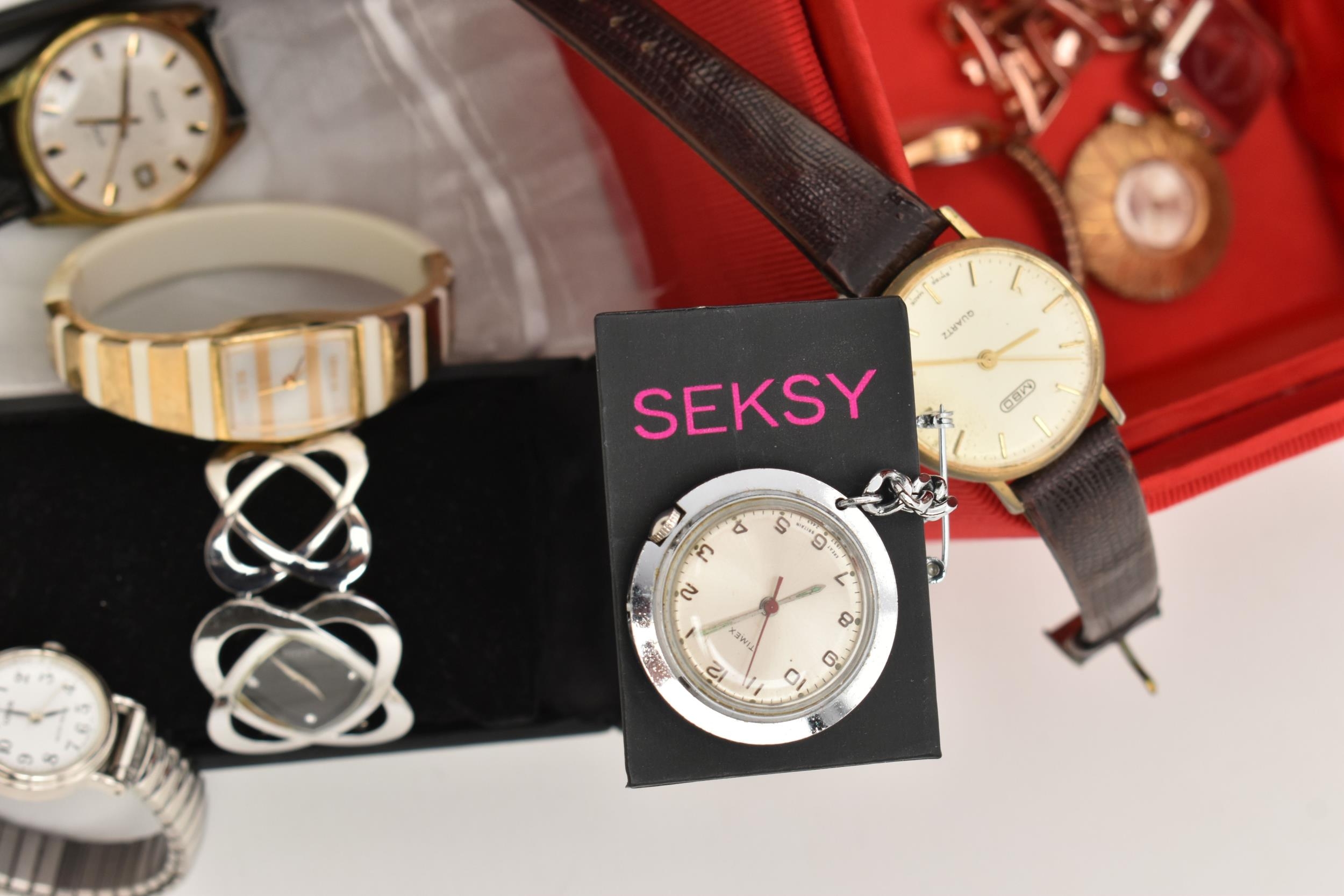 A SELECTION OF WATCHES, to include a cased Seksy watch, two lady's textured finish Accurist wristwatches, a cased Sekonda watch with pink face, Timex watches etc., with a red jewellery box