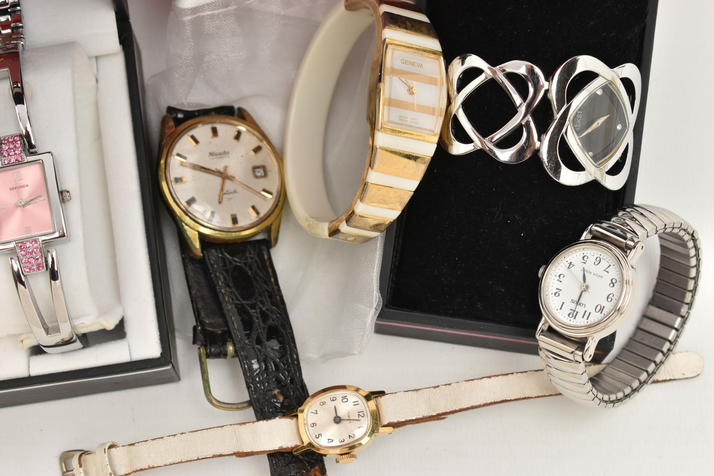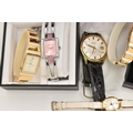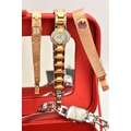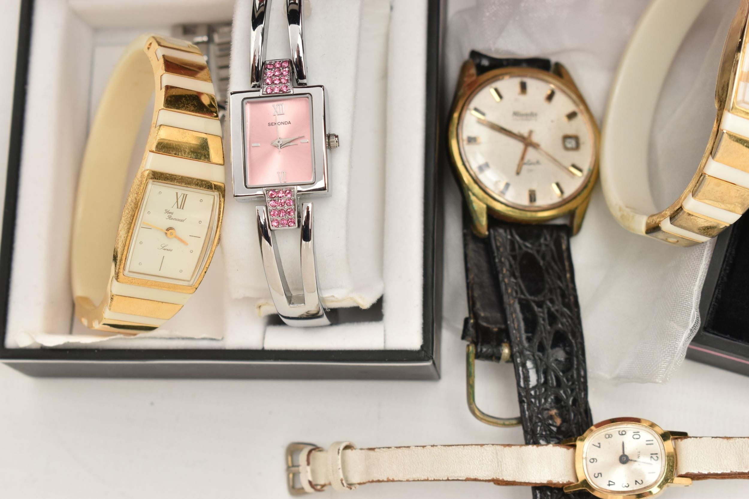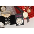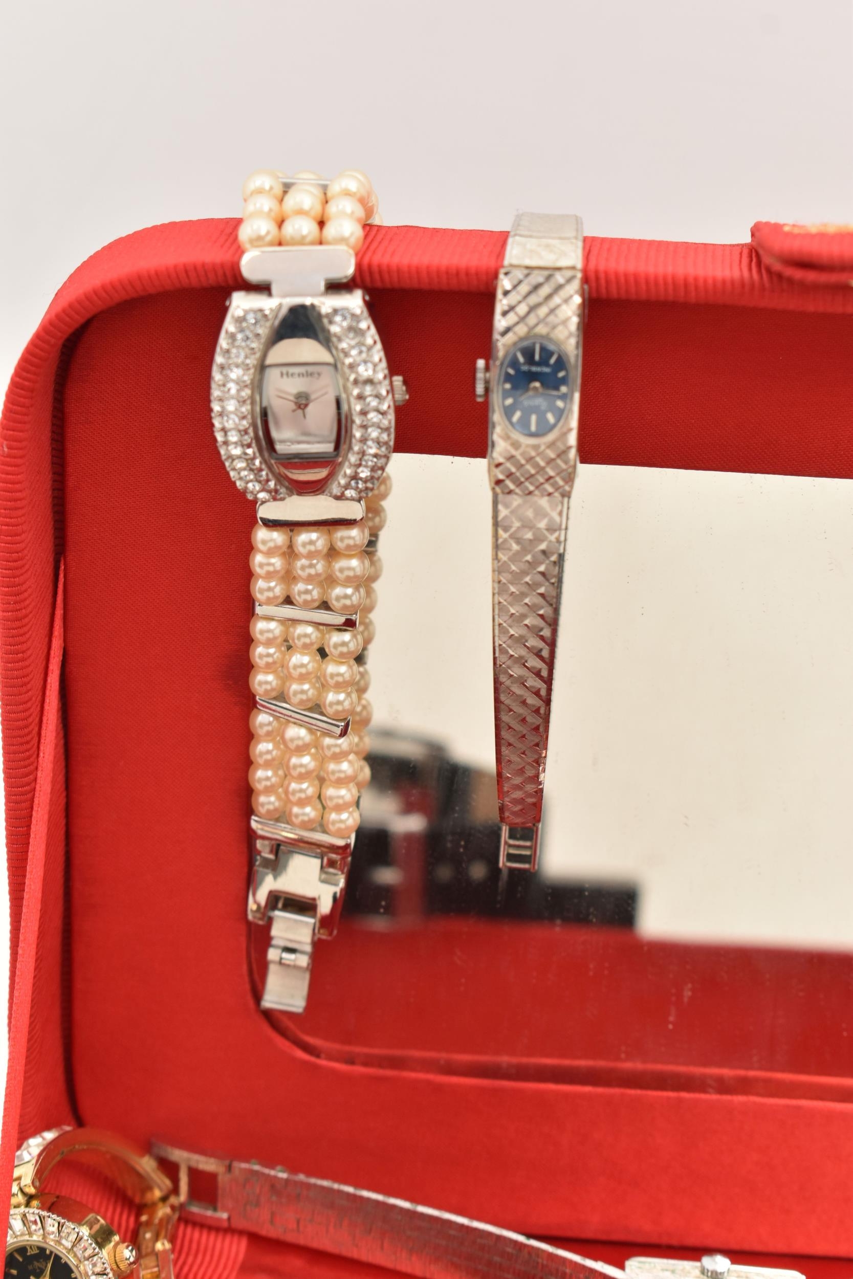 A SELECTION OF WATCHES, to include a cased Seksy watch, two lady's textured finish Accurist wristwatches, a cased Sekonda watch with pink face, Timex watches etc., with a red jewellery box