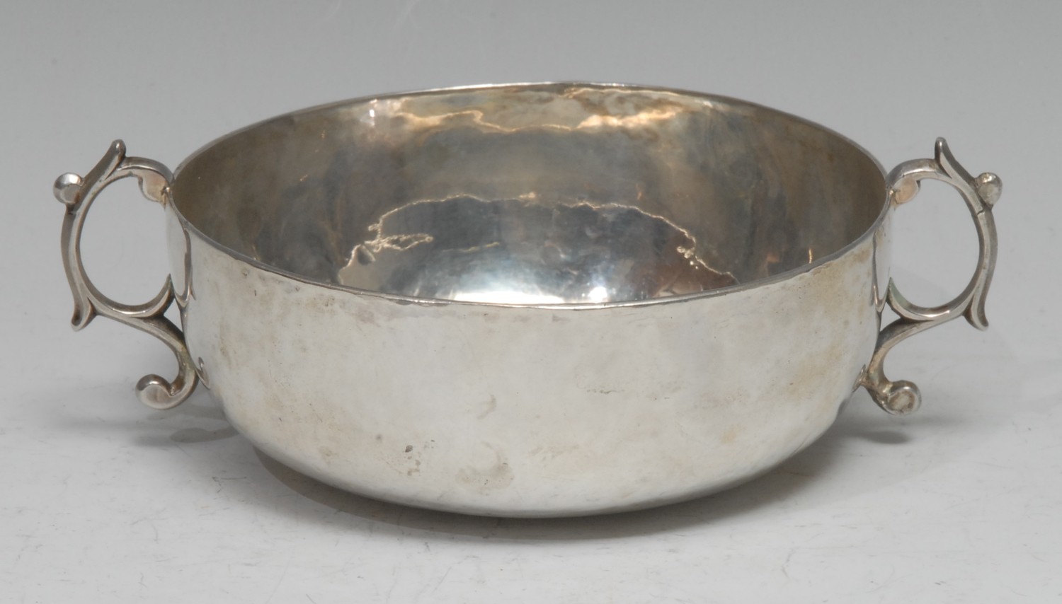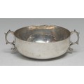An 18th century silver porringer, probably Continental, scroll handles, 16cm wide, apparently unmarked, 4.5oz
