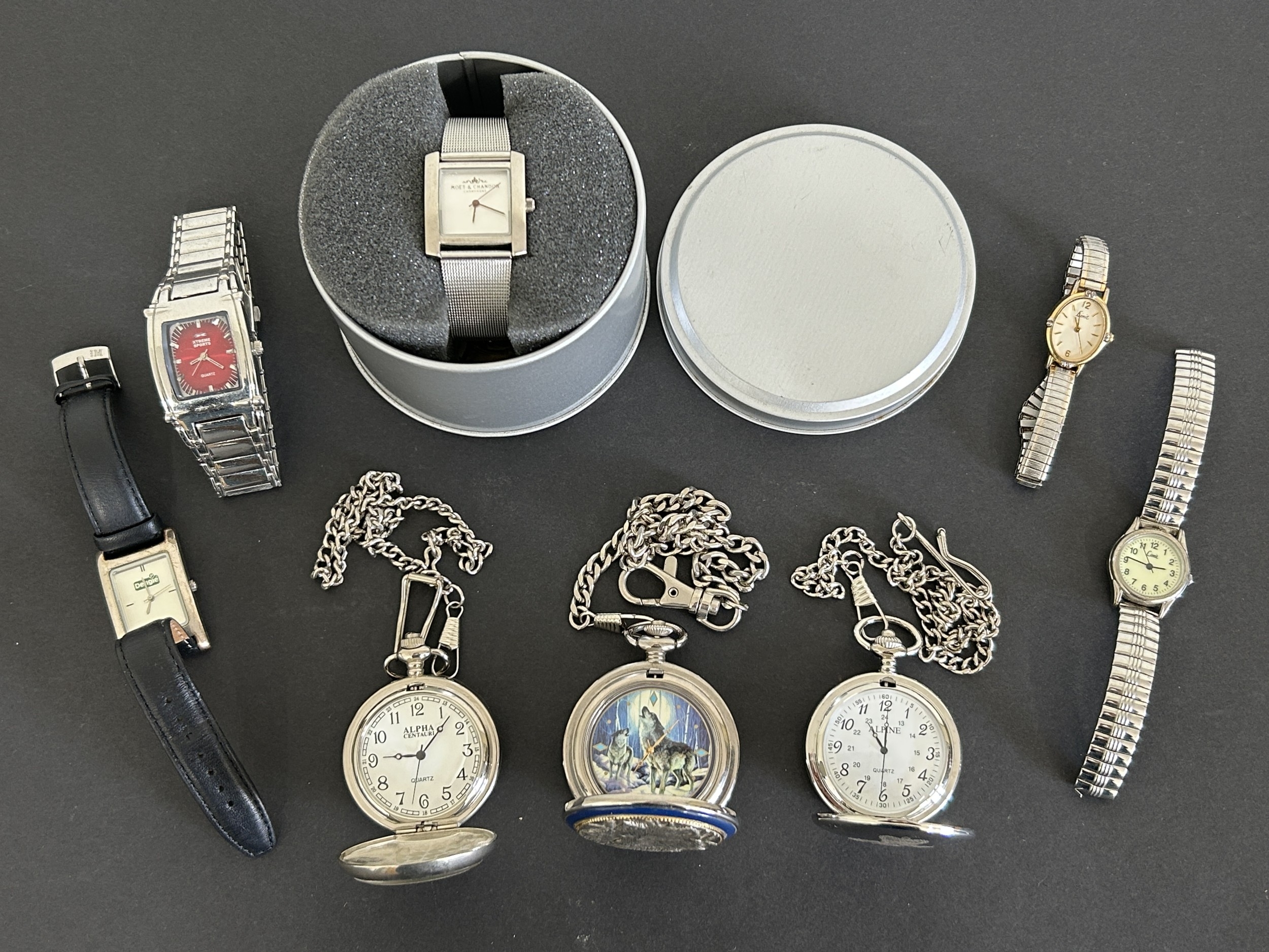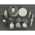 Three vintage style pocket watches on chains including a Franklin Mint example plus various wristwatches