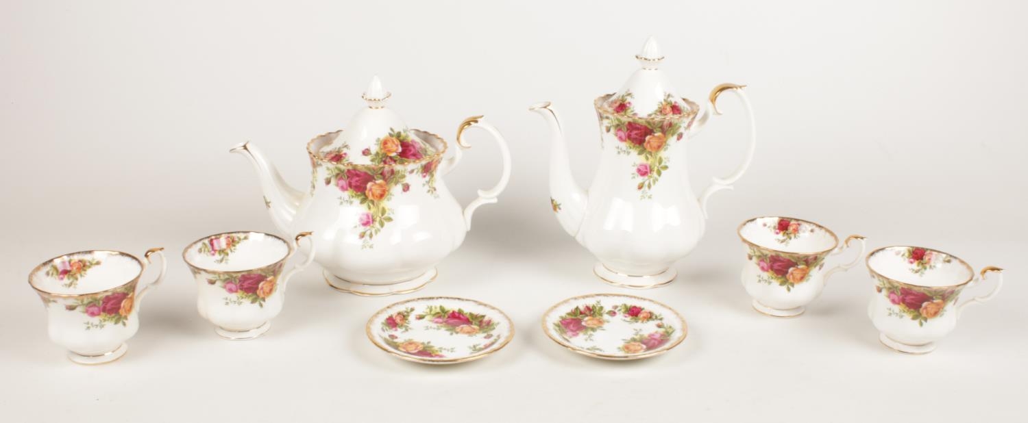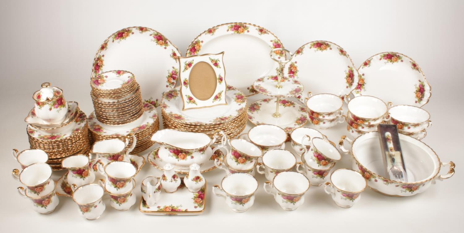 A large collection of Royal Albert 'Old Country Roses' tea/coffee/dinner set. Comprising of a two tier cake stand, a teapot, coffee pot, a tureen (no lid) serving platters, photo frame, condiment set, sugar & milk jug etc.