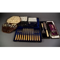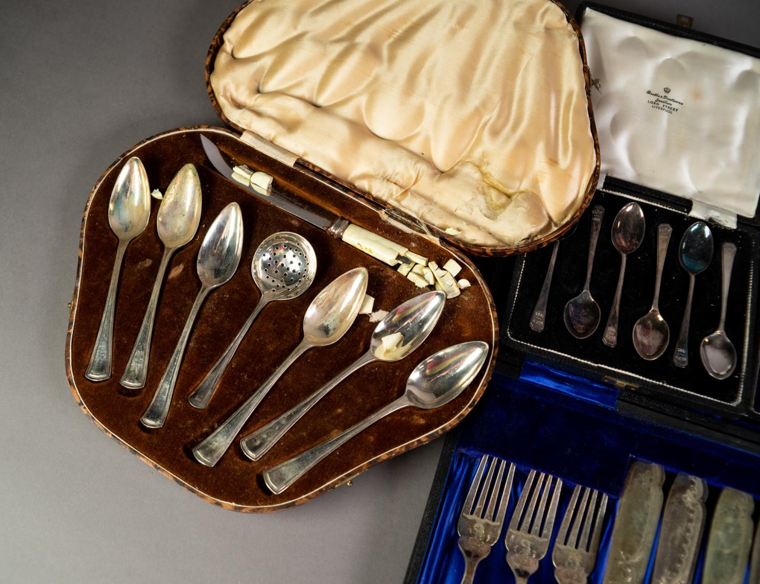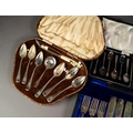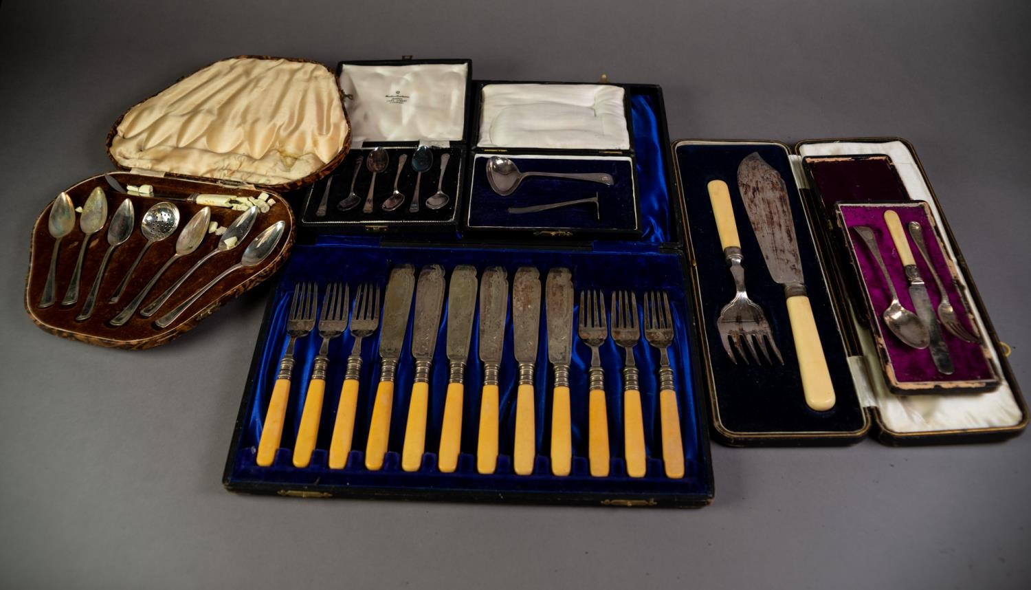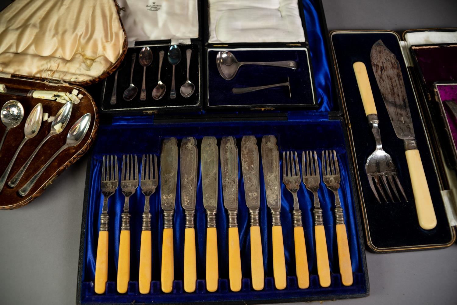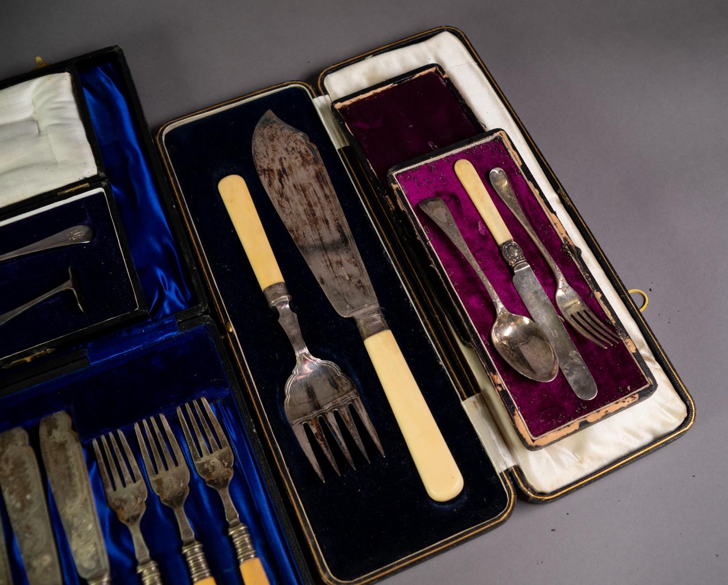 CASED SET OF SIX ELECTROPLATED FISH KNIVES AND FORKS; a cased pair of FISH SERVERS; a cased set of six tea/coffee spoons; a cased set of GRAPEFRUIT SPOONS; a cased infant's SPOON AND PUSHER and cased CHRISTENING SET