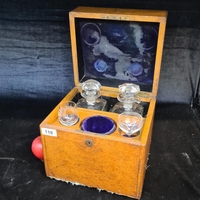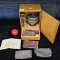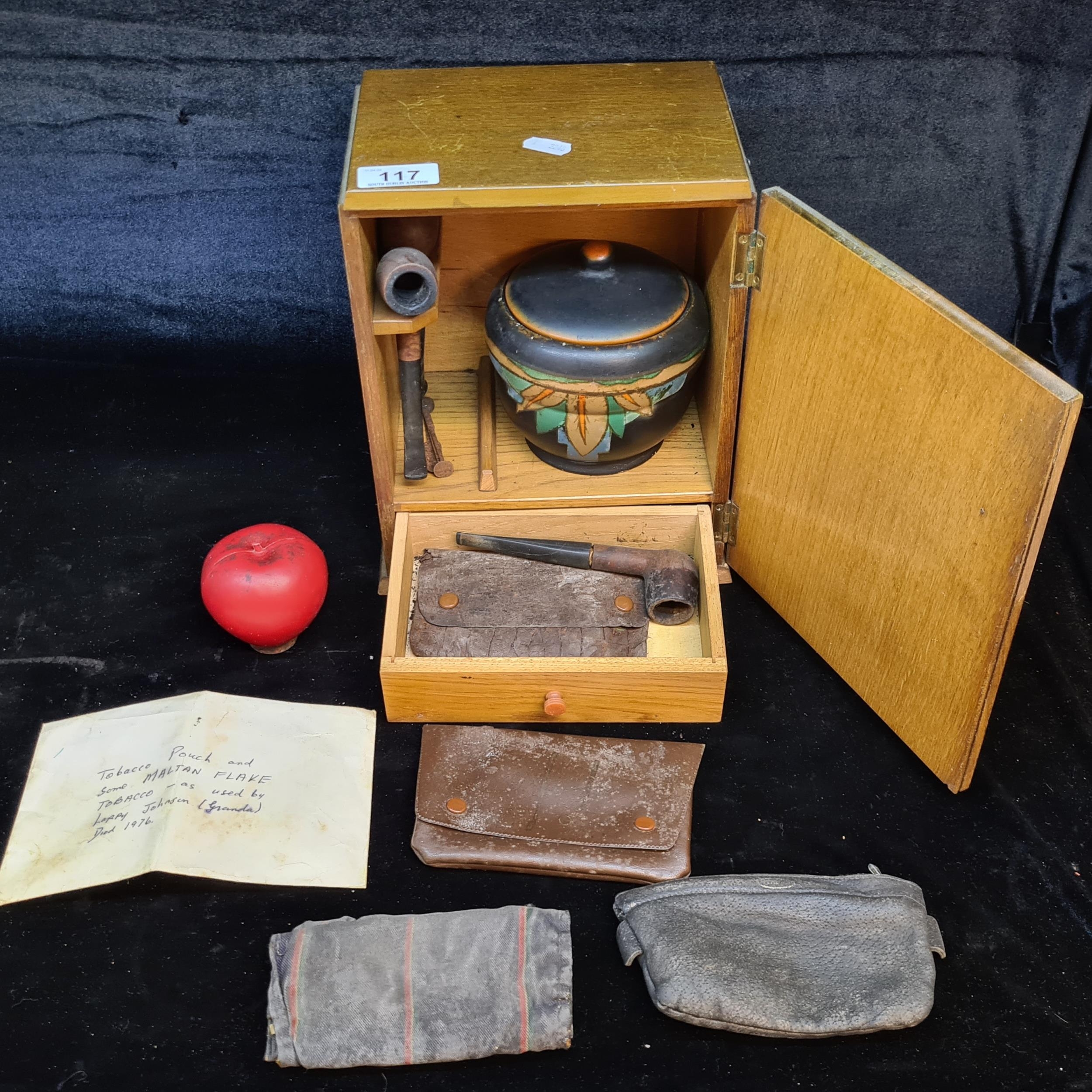 A vintage handsome smoking pipe cabinet containing three pipes, four pouches including leather examples, along with a Mid Century Mohvel English made ceramic lidded bowl and a tobacco tamper.
