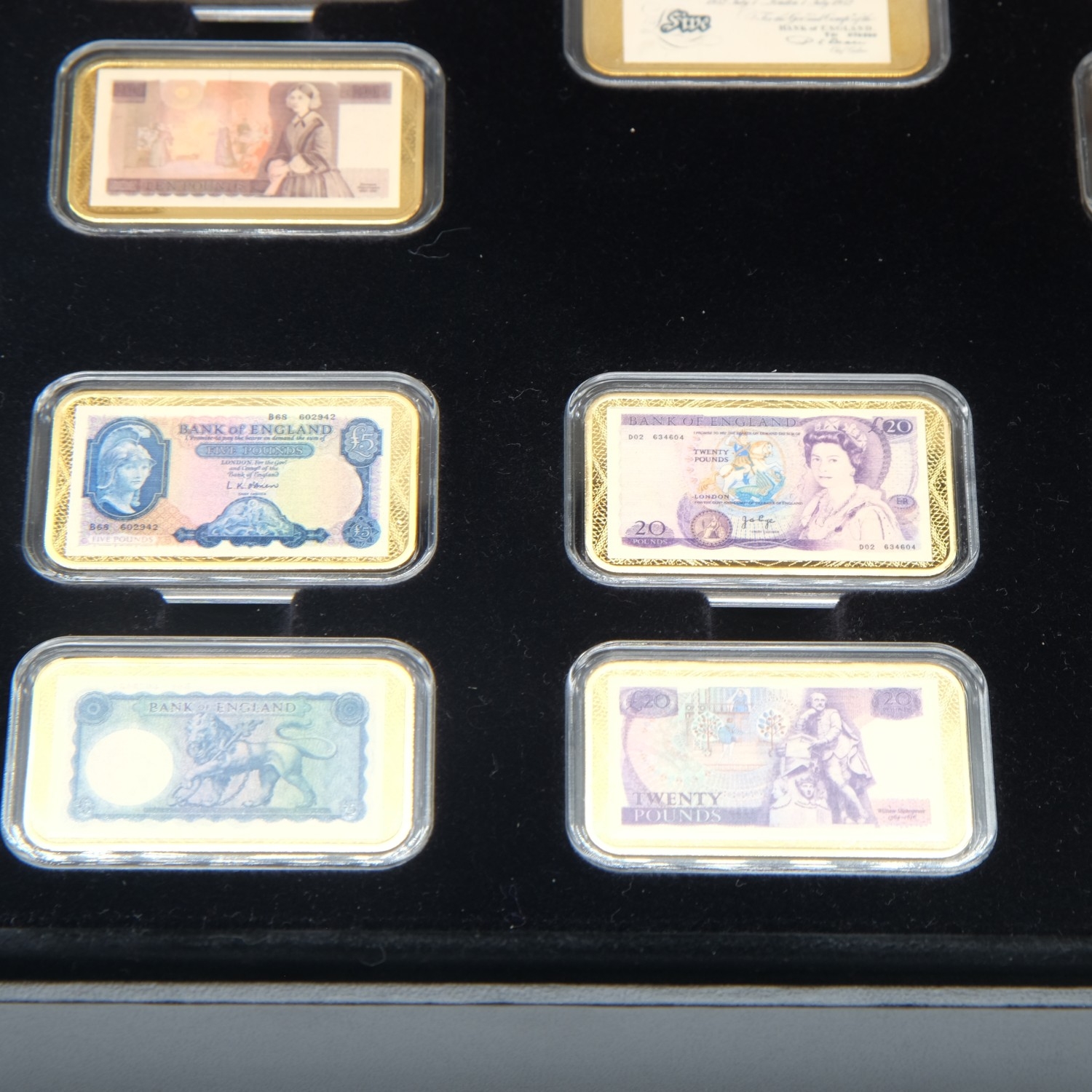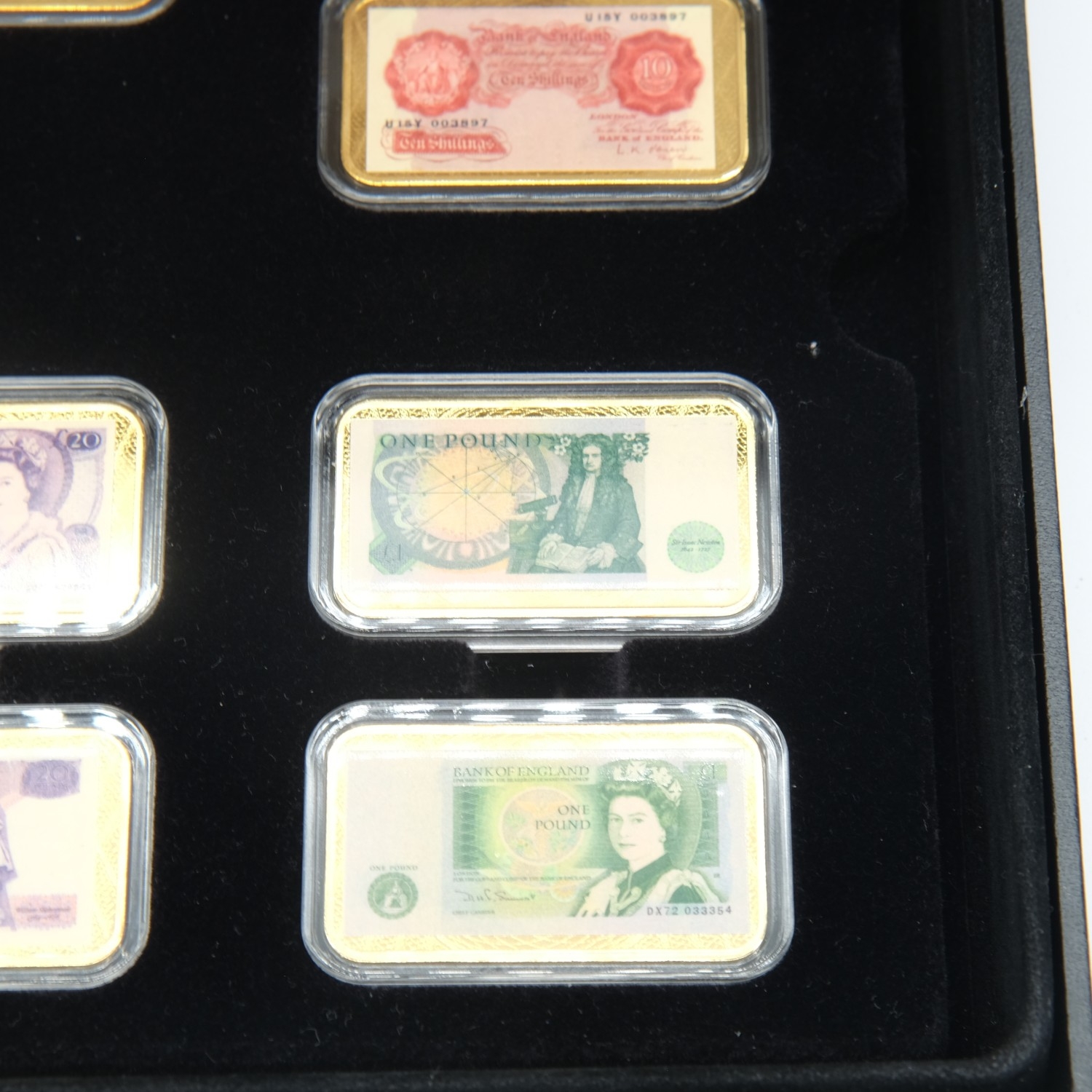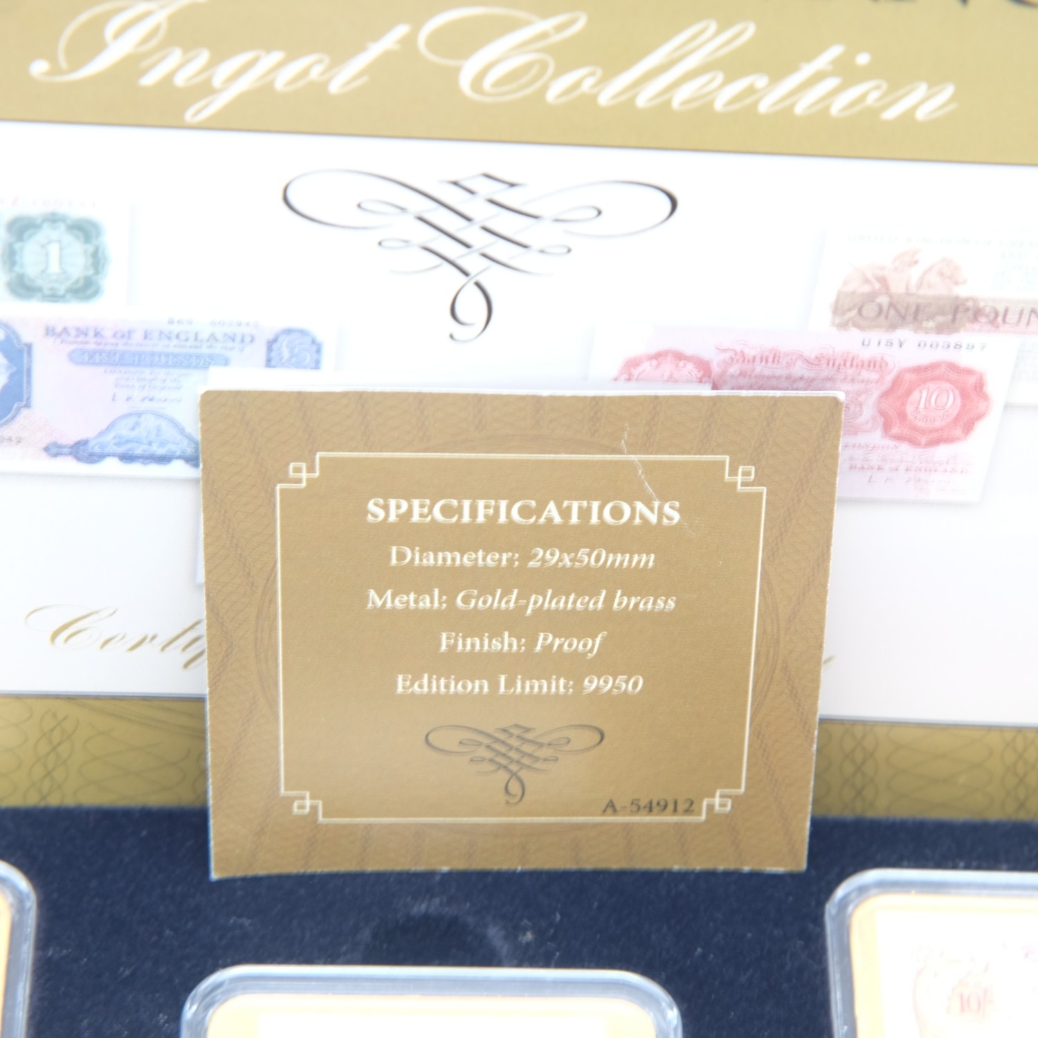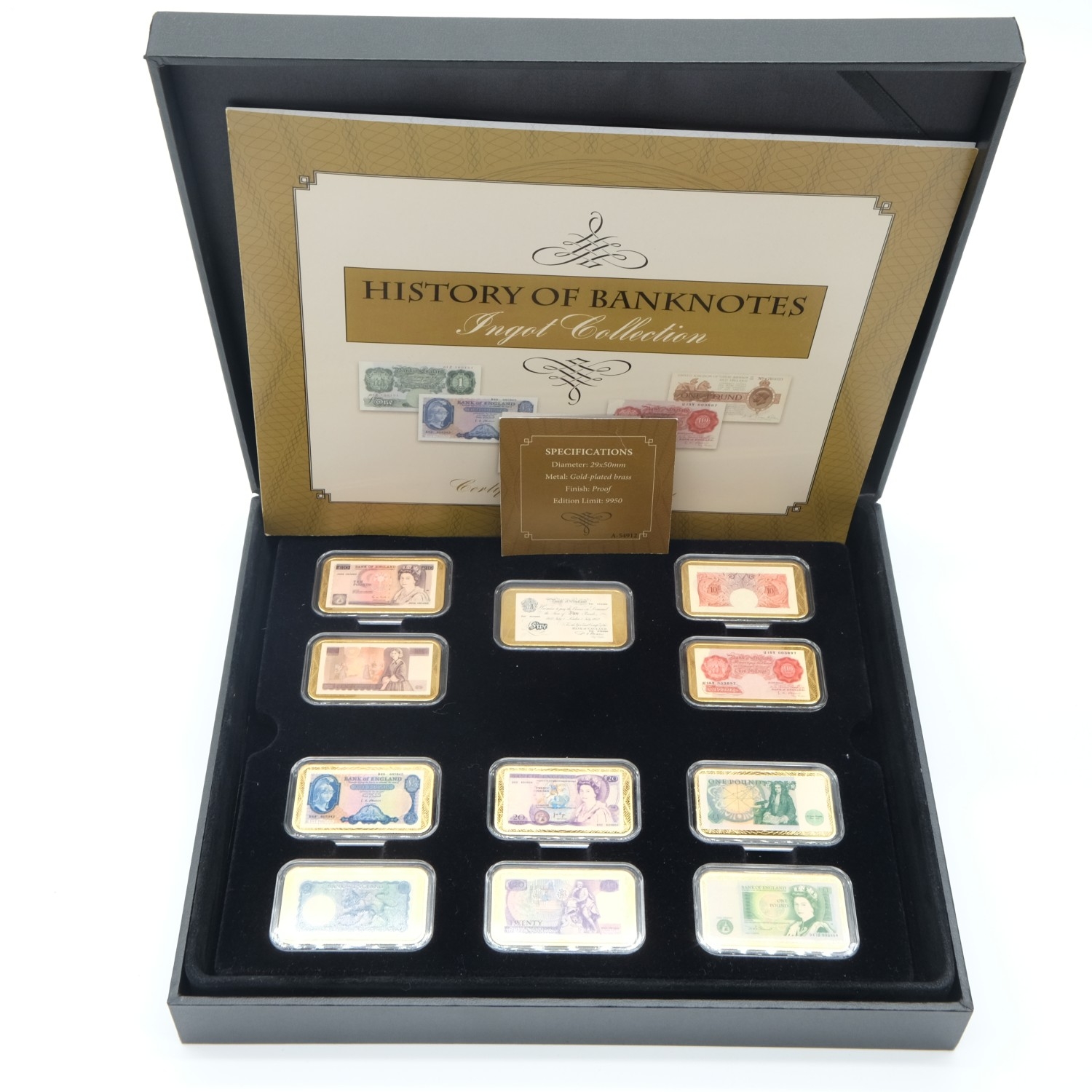 History of Banking Notes ingot collection in gold plated brass. UK P&P Group 2 (£24+VAT for the first lot and £5+VAT for subsequent lots)