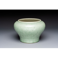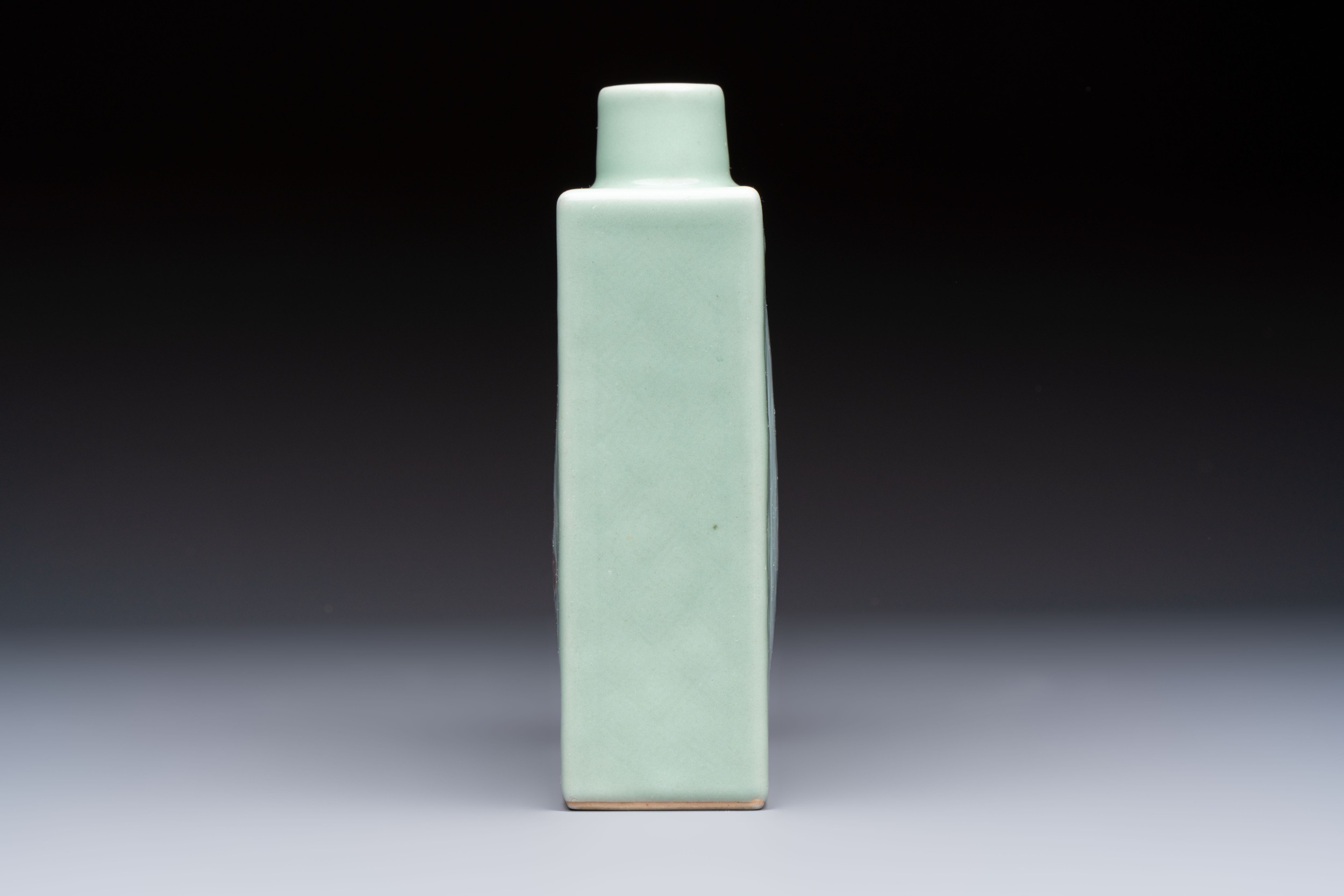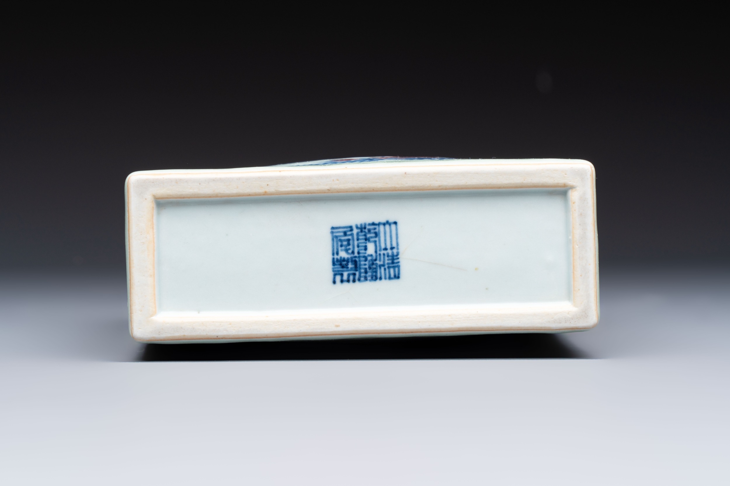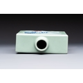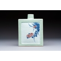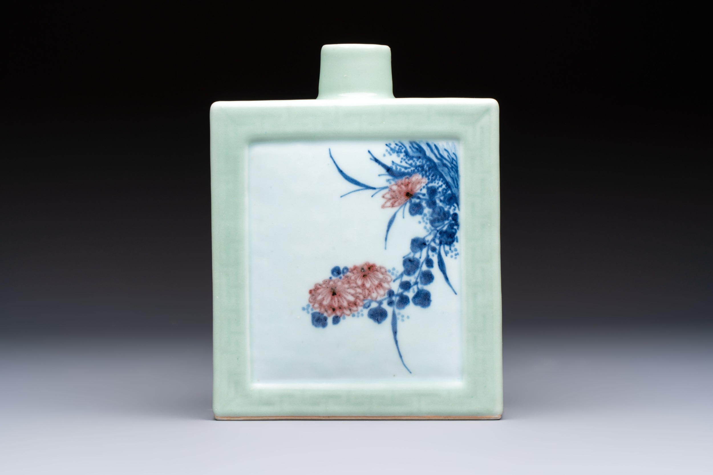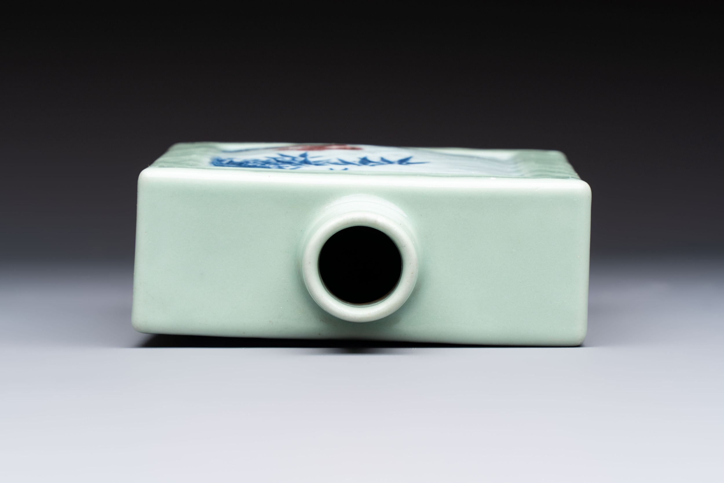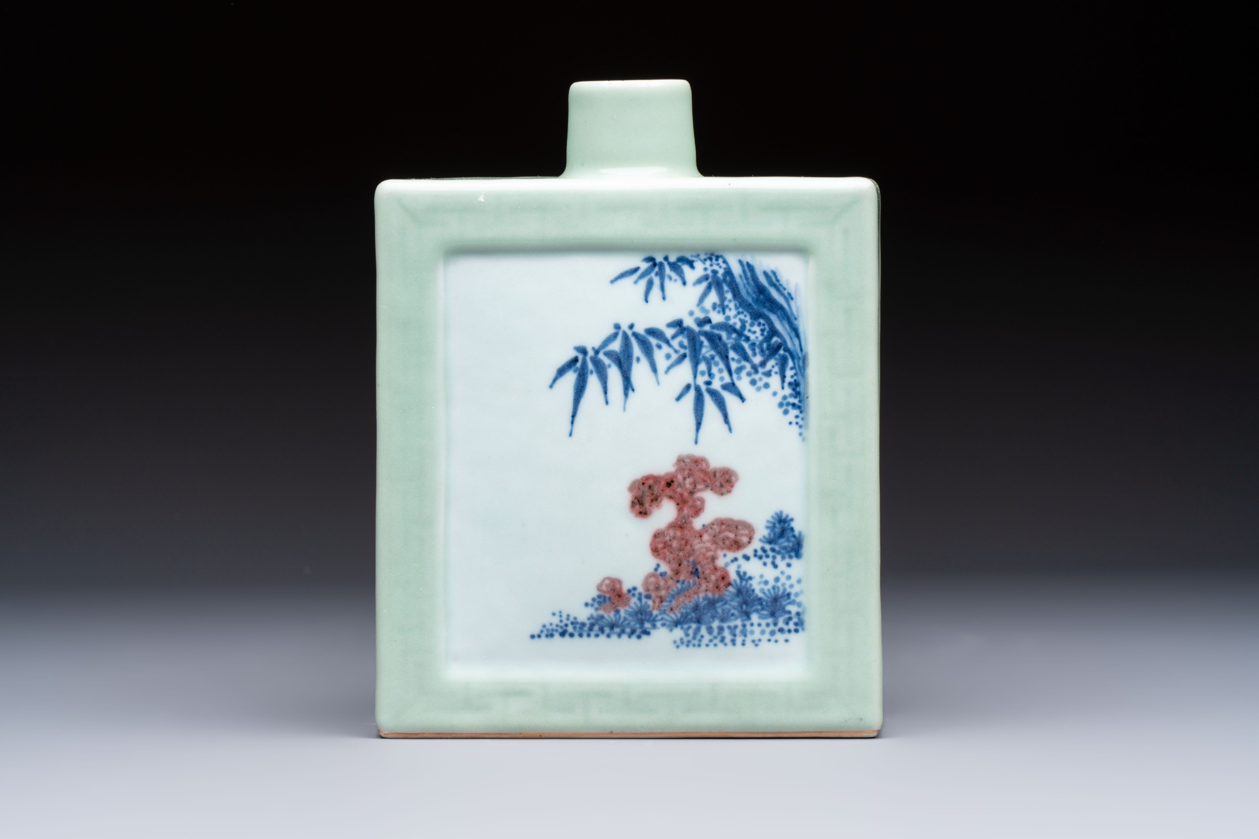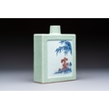 A Chinese blue, white and copper-red celadon-ground tea caddy with floral and bamboo design, Qianlong mark and of the period