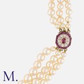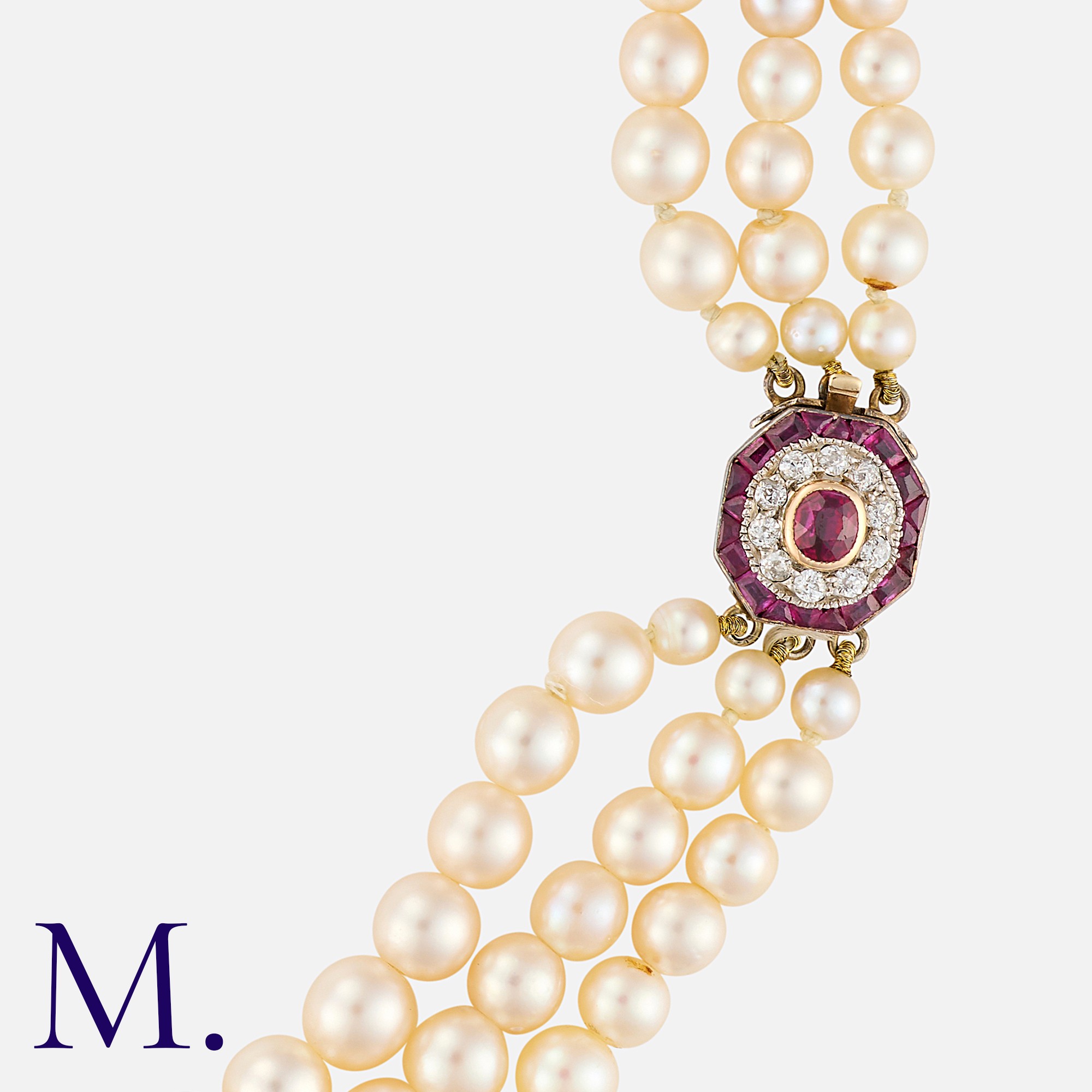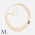 A Pearl Necklace in yellow and white gold, comprising three strings of drilled pearls ranging from approximately 3.3 - 8.6mm, terminating in a ruby and diamond target style clasp. Unmarked, tests indicate 14 carat gold.
