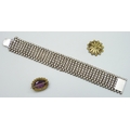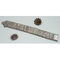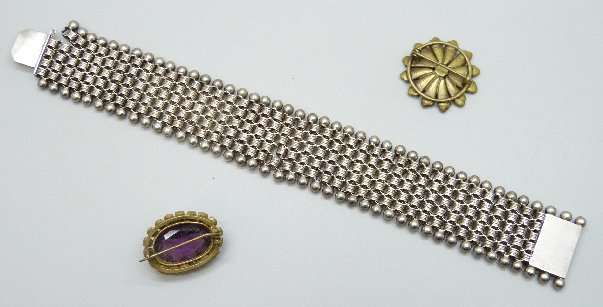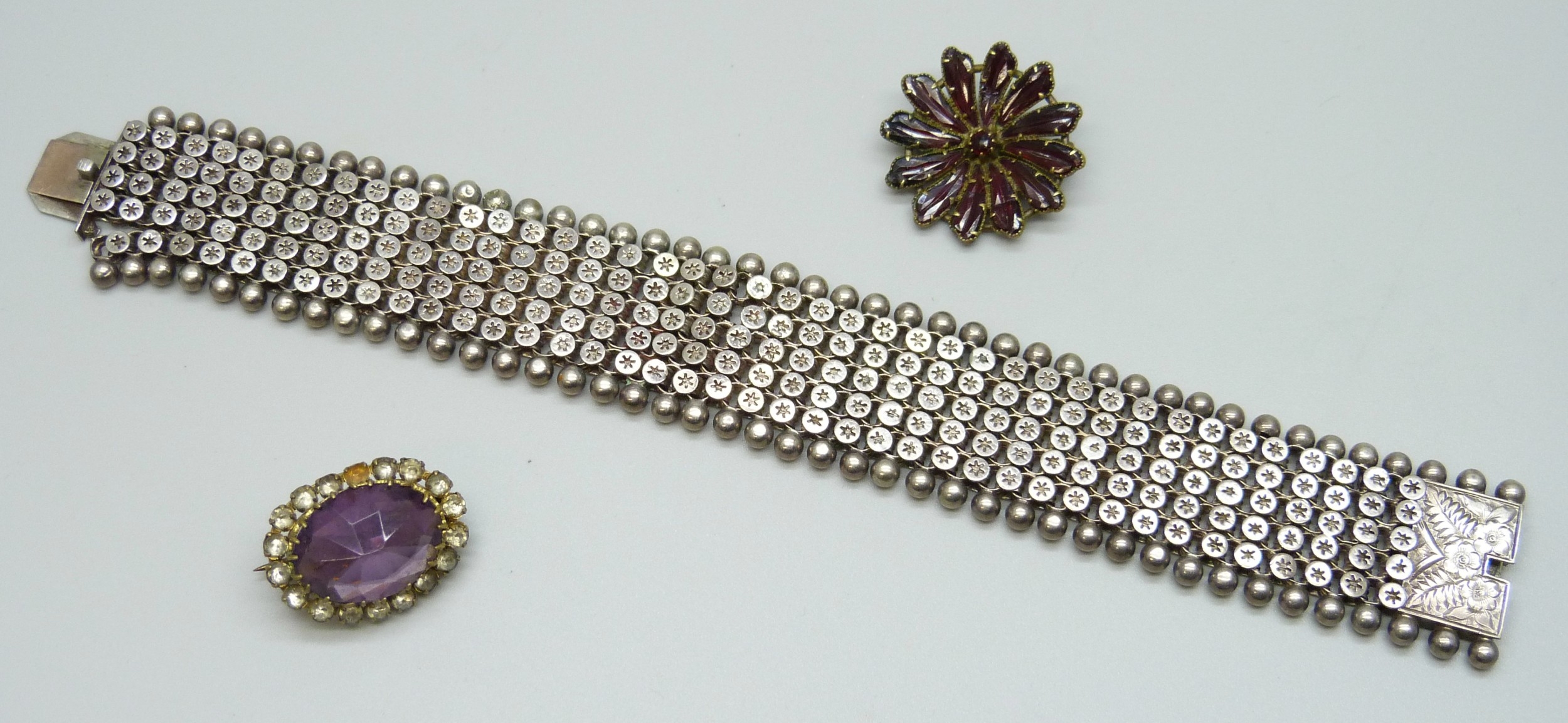 A Victorian white metal bracelet, a/f, 34g, 18.5cm, and two paste brooches