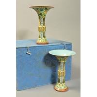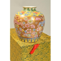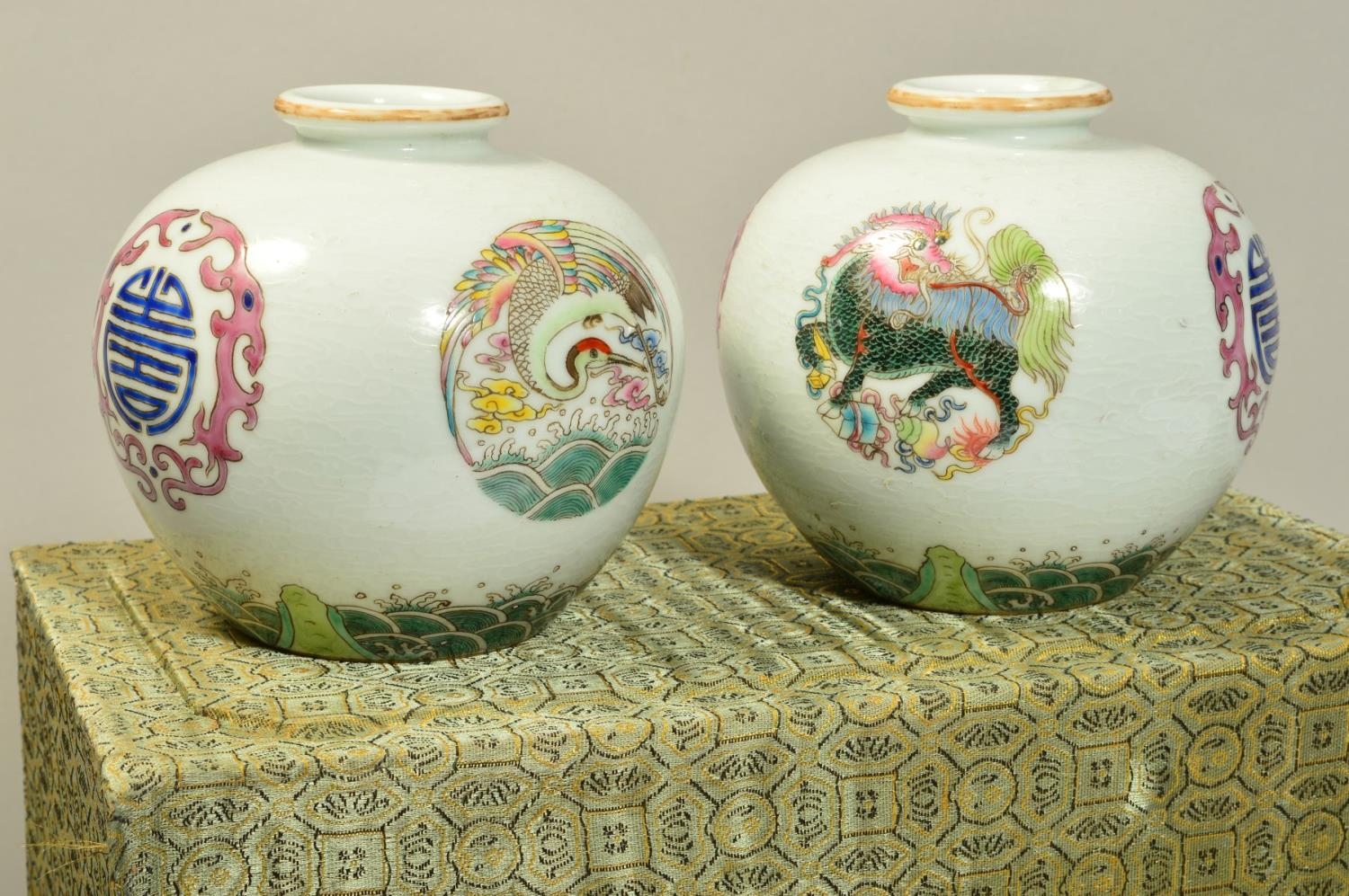 A BOXED PAIR OF SMALL BULBOUS CHINESE VASES, stork and mythical creature medallions, orange character marks to base, height 12cm