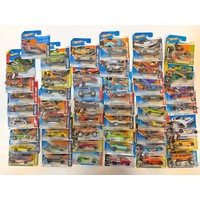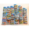 A group of 50 Hot Wheels carded diecast model vehicles comprising 1) Hot Wheels Jet Threat 3.0, 2) Hot Wheels Spider Rider, 3) Hot Wheels 69 Pontiac GTO Judge, 4) Hot Wheels Croc Rod, 5) Hot Wheels Fast Fish , plus others as shown. All appear excellent in original boxes.