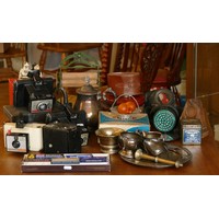 Two large Willow pattern meat platters, together with a Spode coffee pot, a pair of 20th Century metal Oriental vases (af).