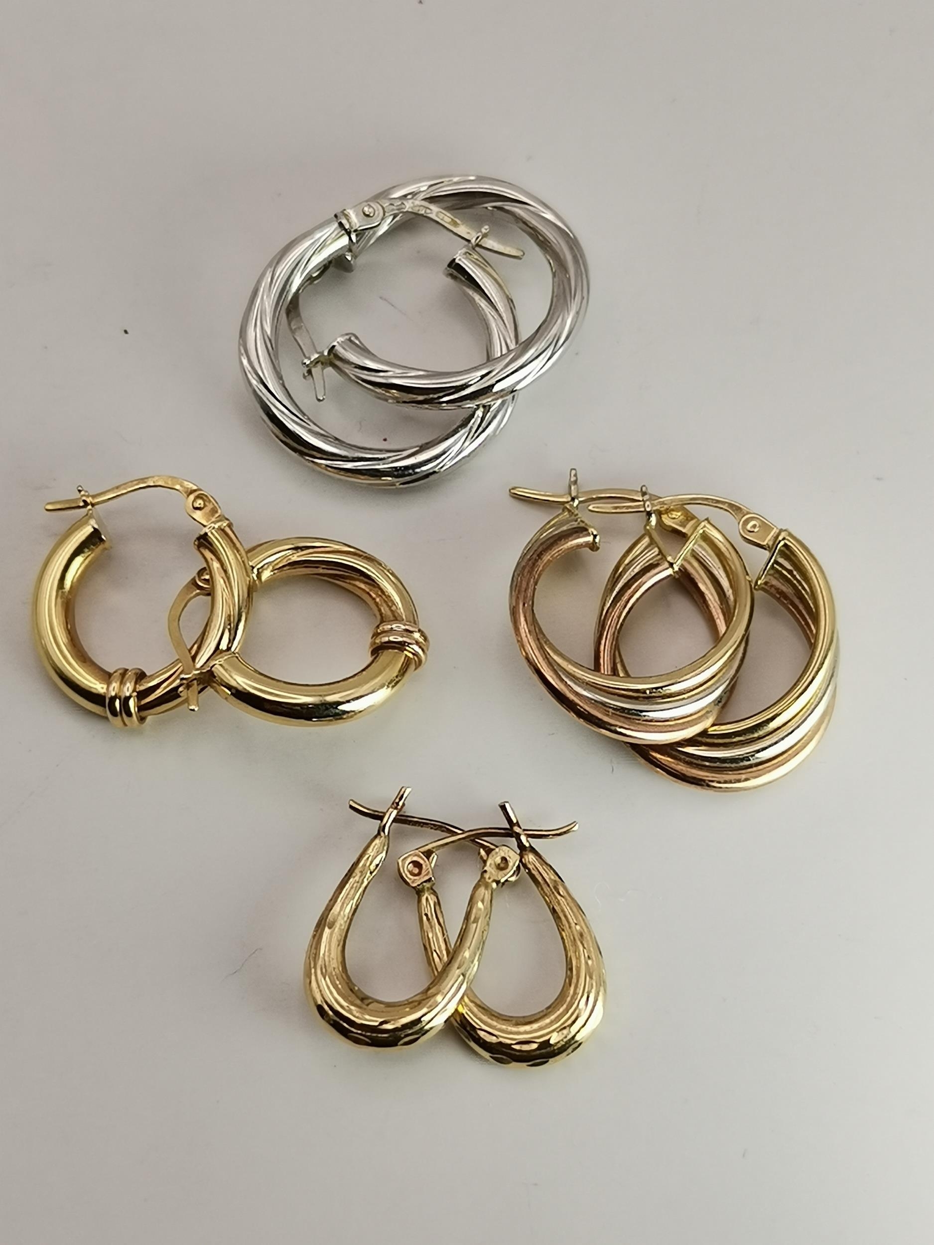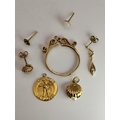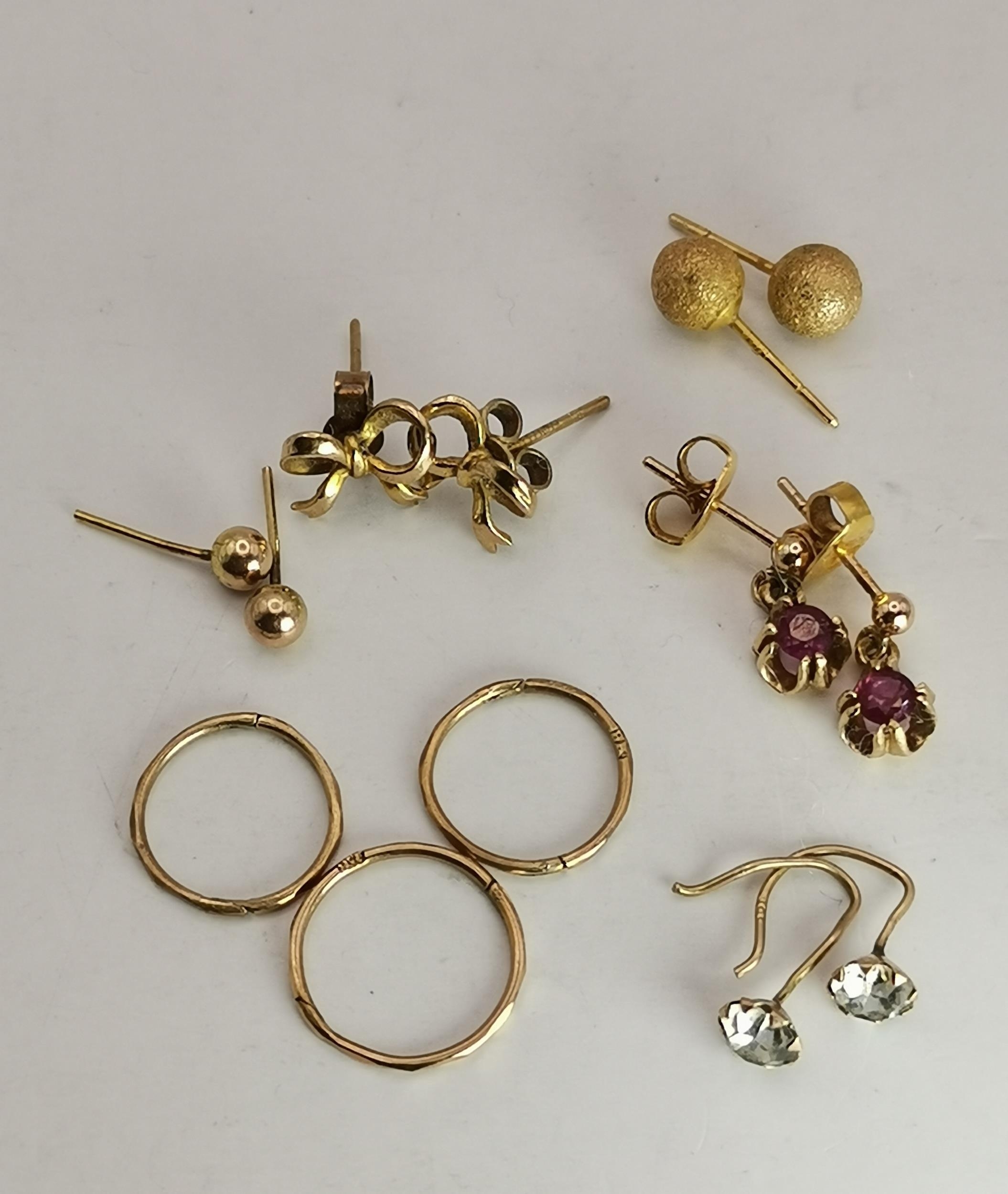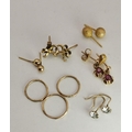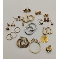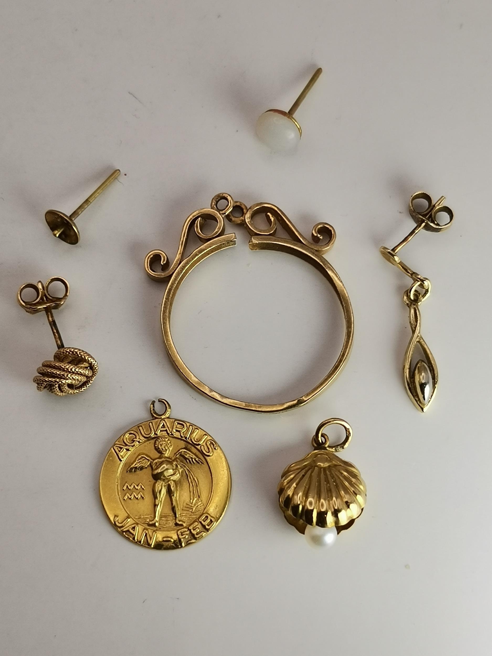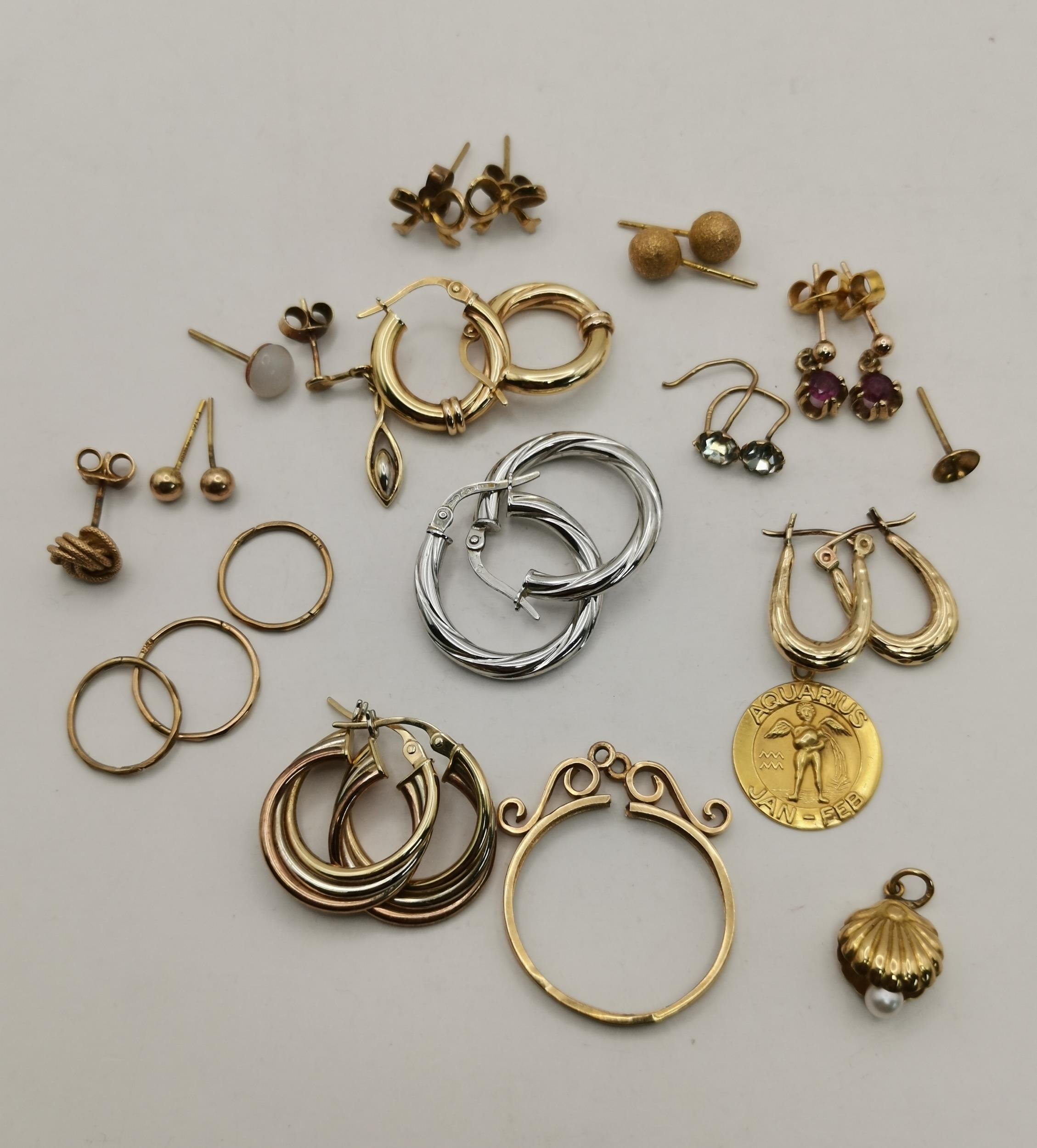 A quantity of assorted 9 carat gold and white gold jewellery, variously marked, including hoop and stud earrings (some gem-set), a bracelet charm, a necklace pendant as a scallop shell with pearl, a sovereign loose pendant mount, etc. (Qty) 15.3g gross