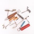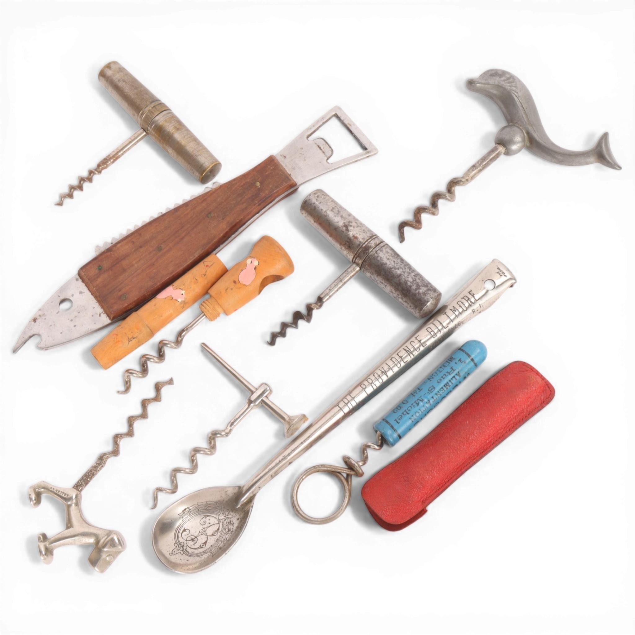 9 various corkscrews and bottle openers, including "The Providence Biltmore" mixing spoon/corkscrew, pocket corkscrews with additional tools, dolphin and dog handled corkscrew etc.