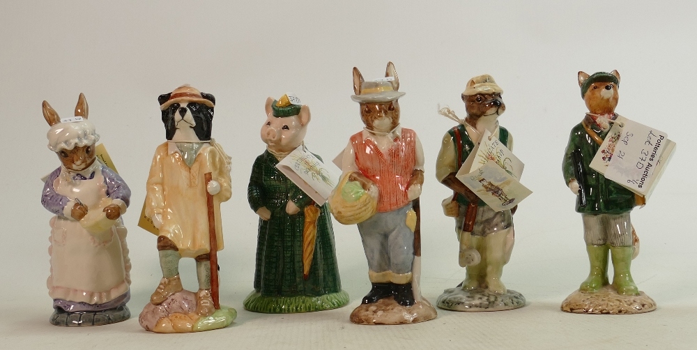 Beswick Country Folk Figures: To include Fisherman Otter ECF2, Mrs Rabbit Baking ECF7, Huntsman Fox ECF1, Gardener Rabbit ECF3, The Lady Pig ECF8 & Shepherd Sheepdog ECF5. (6)