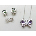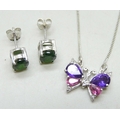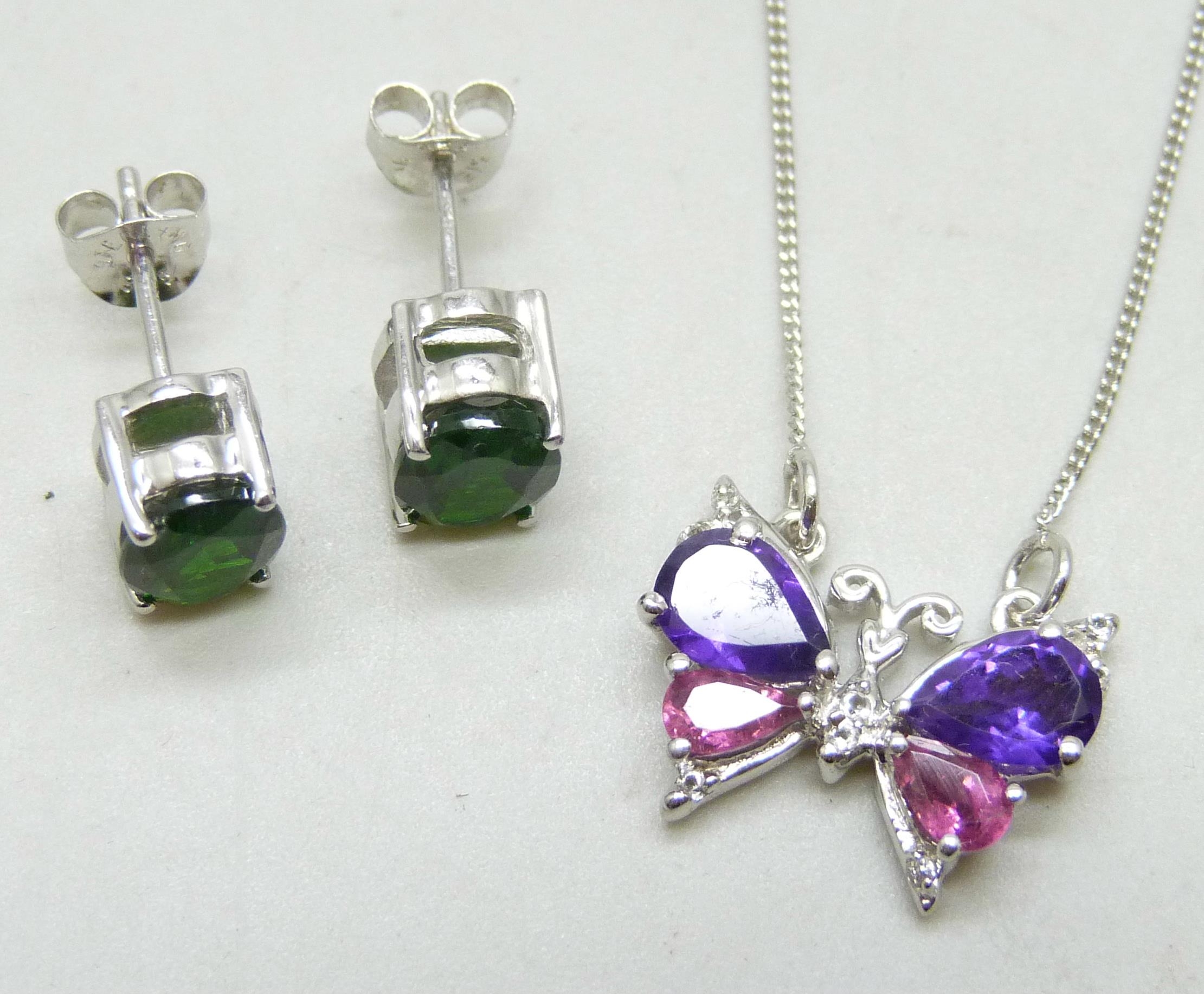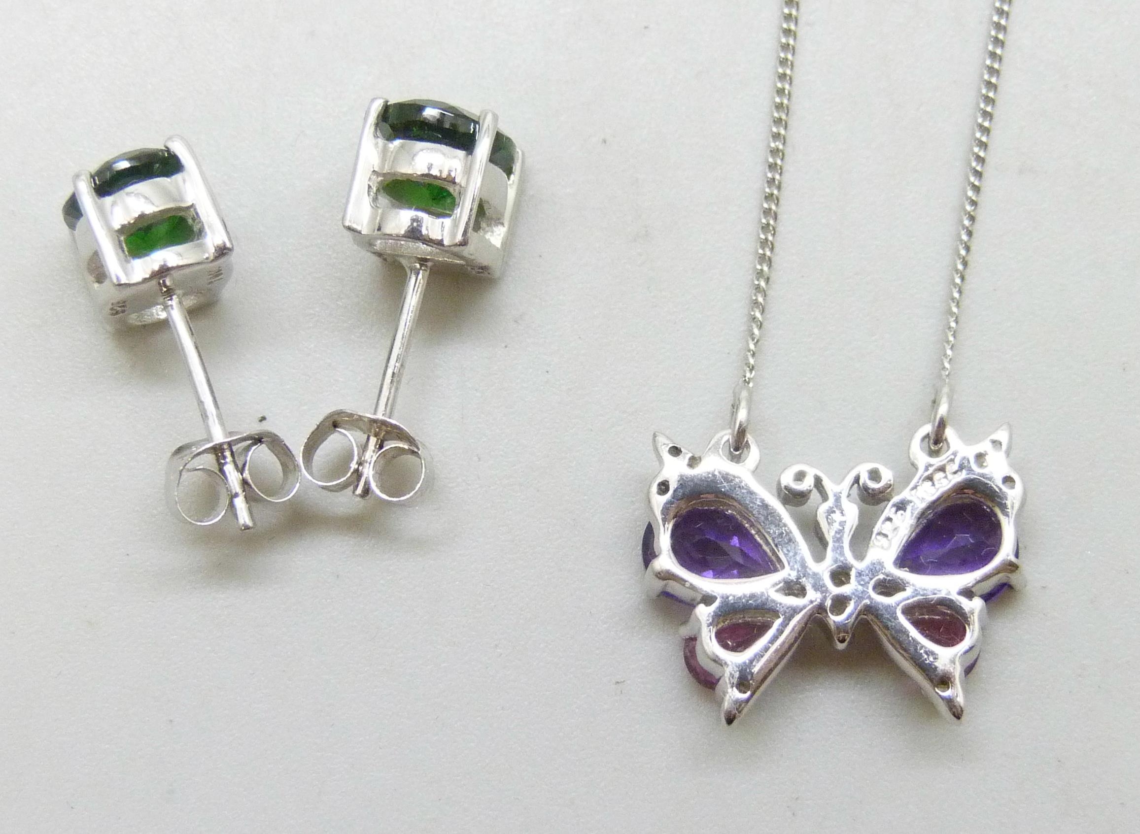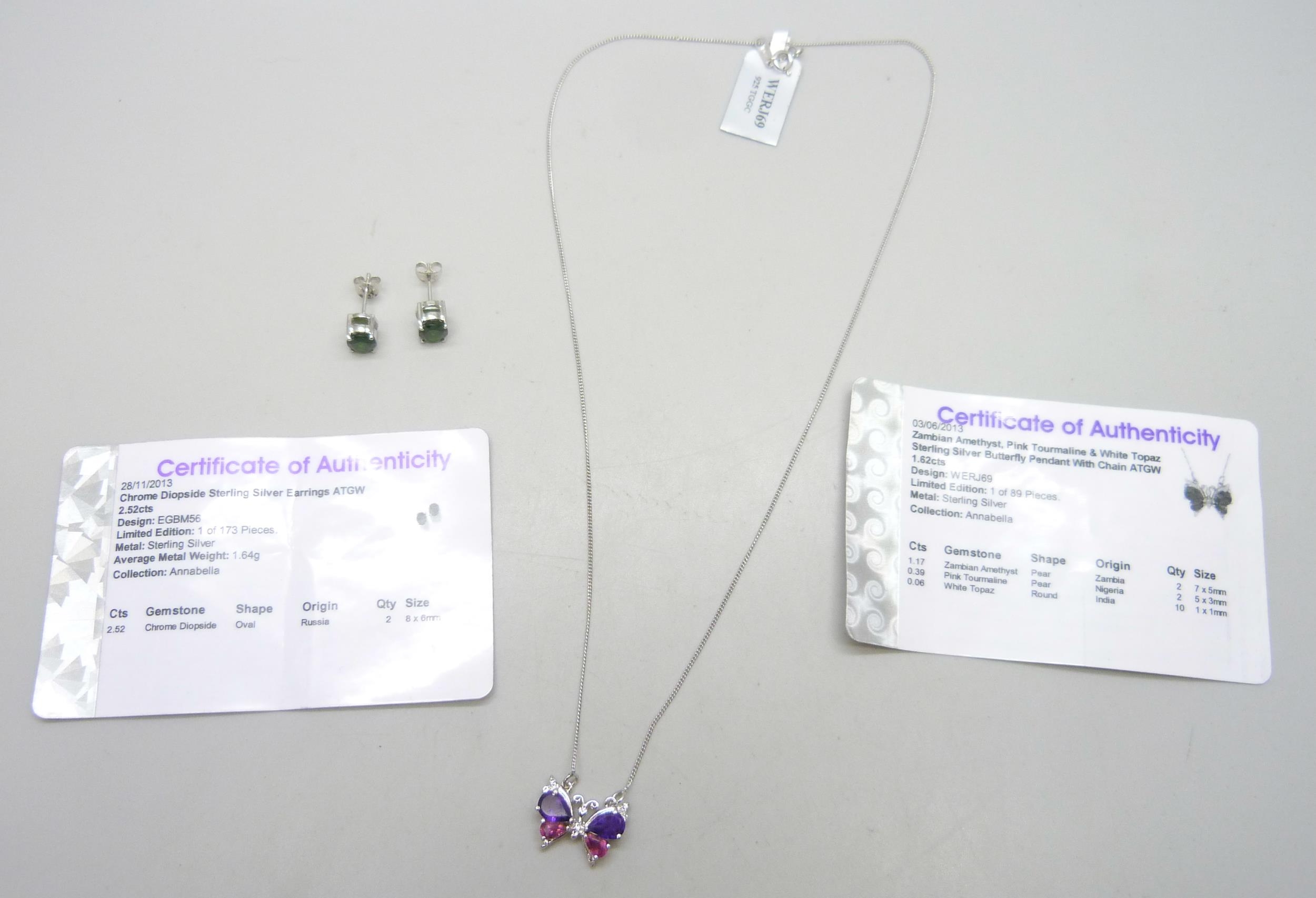A pair of Chrome Diopside earrings, with certificate and an amethyst necklace