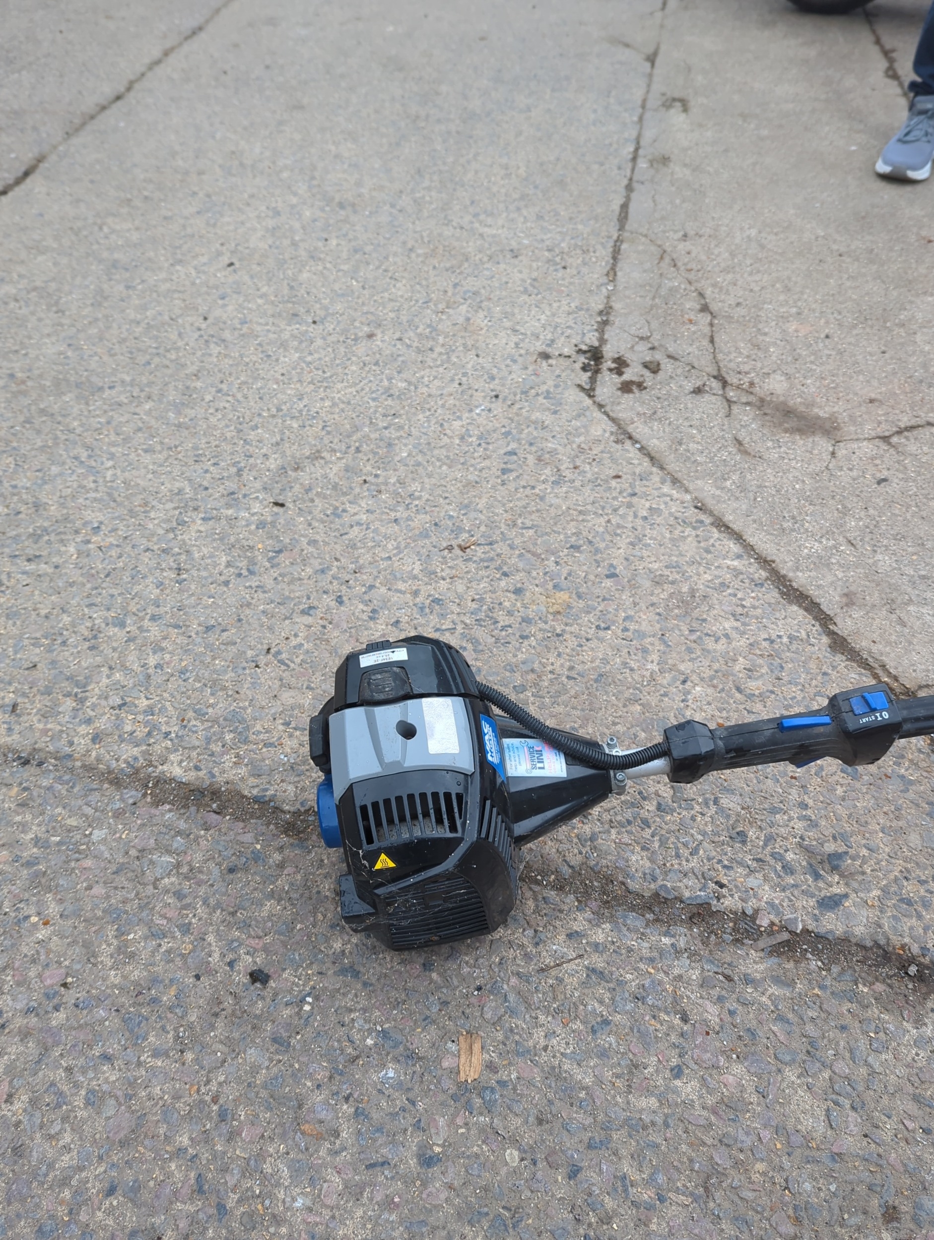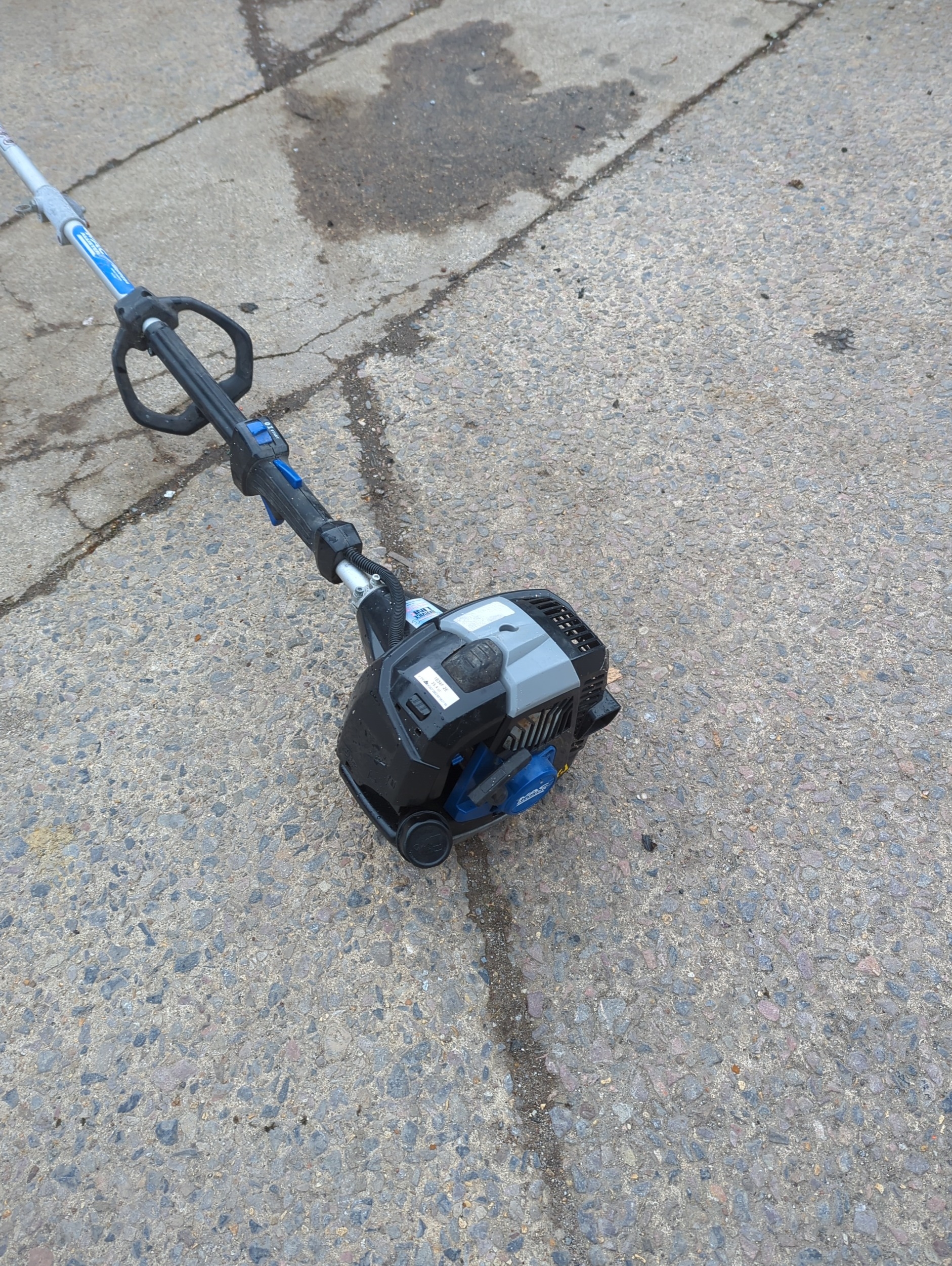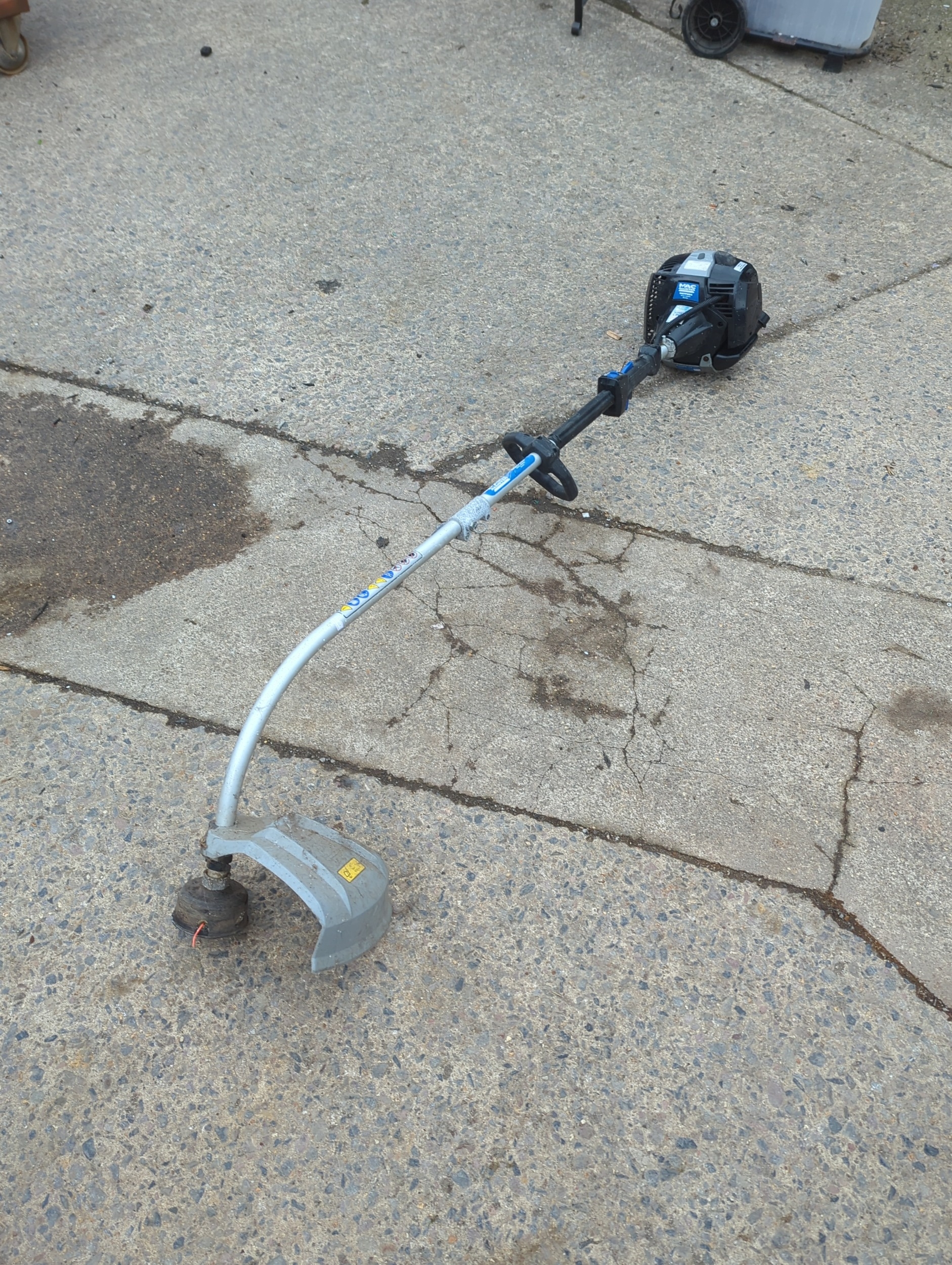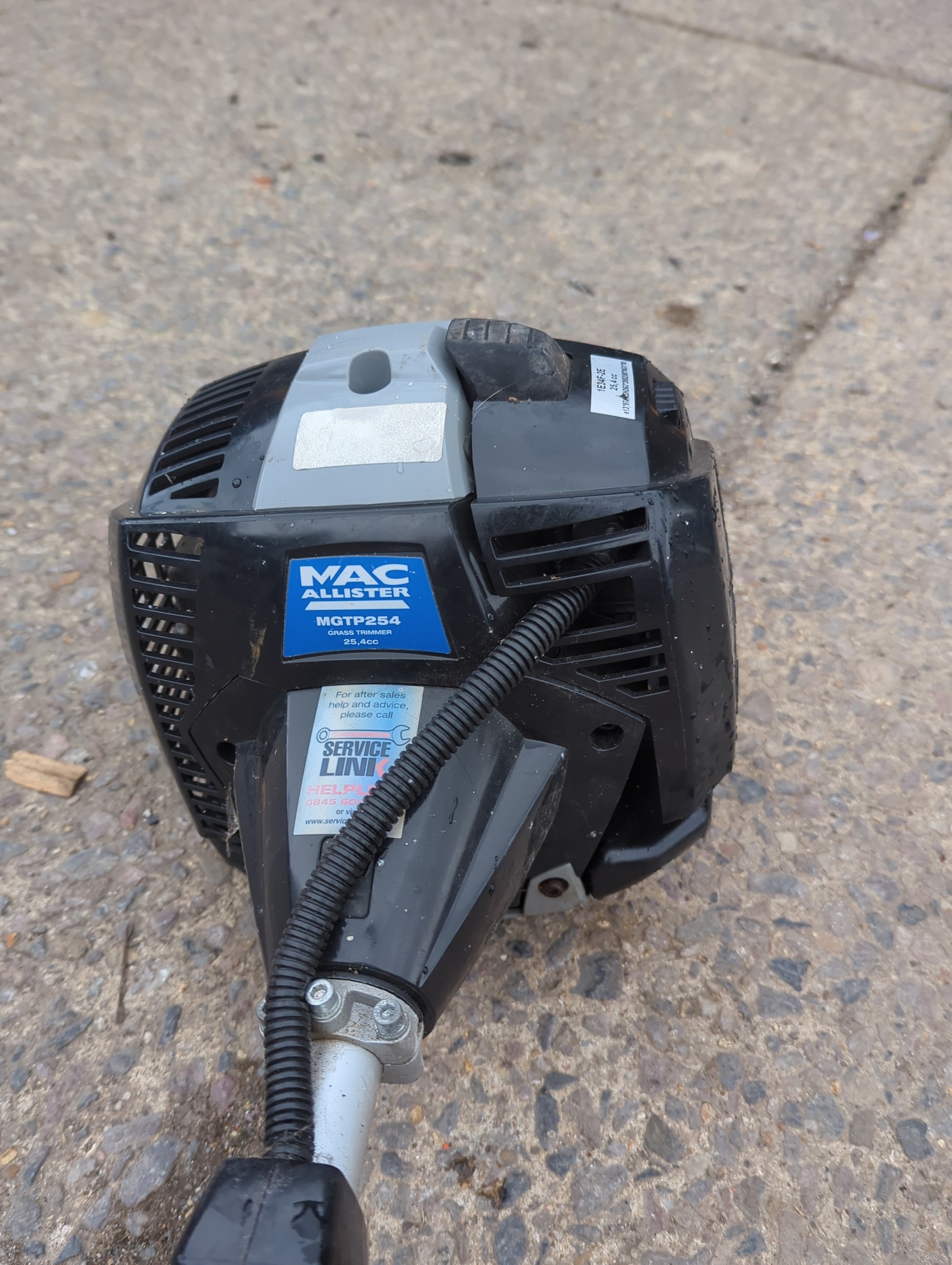 The Mac Allister MCTP254 is a petrol-powered grass trimmer designed for outdoor gardening tasks. It features a straight shaft with a loop handle and a robust engine, making it ideal for trimming grass and weeds in garden areas. The trimmer also has a protective guard to ensure safe operation during use.