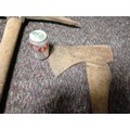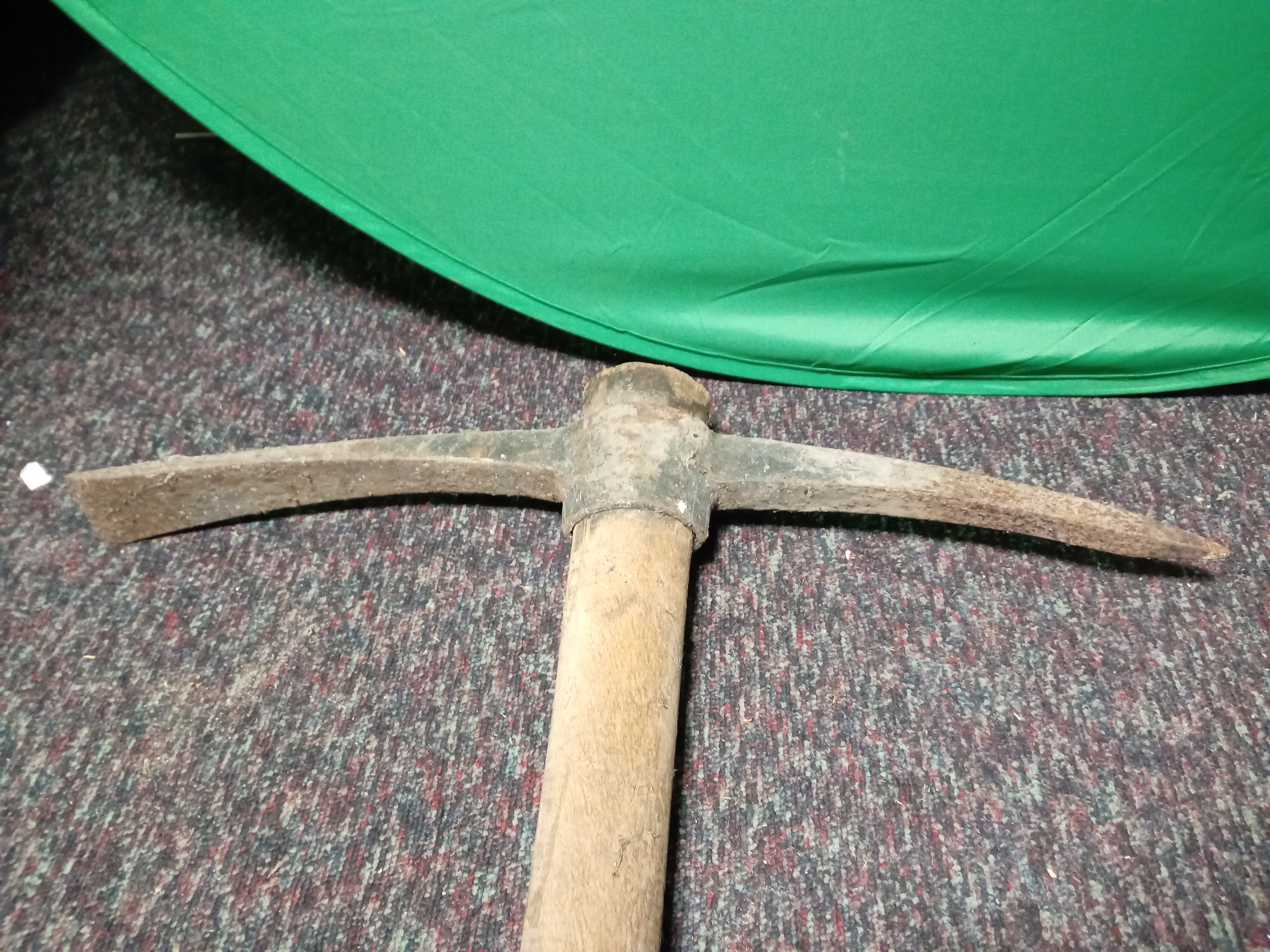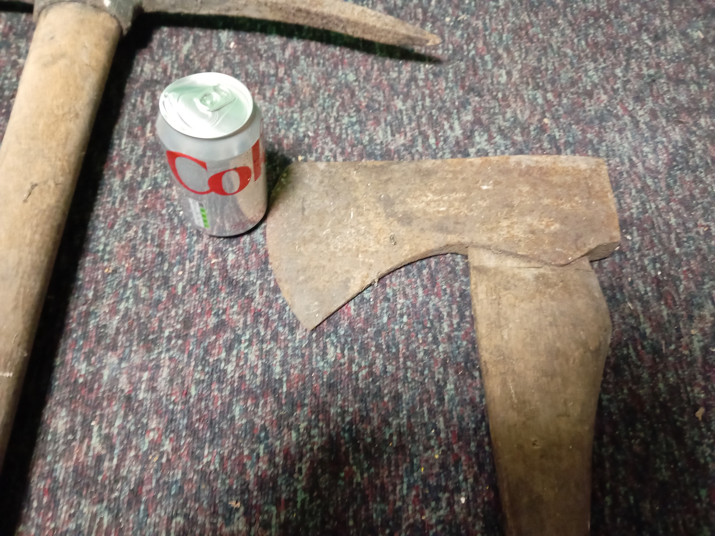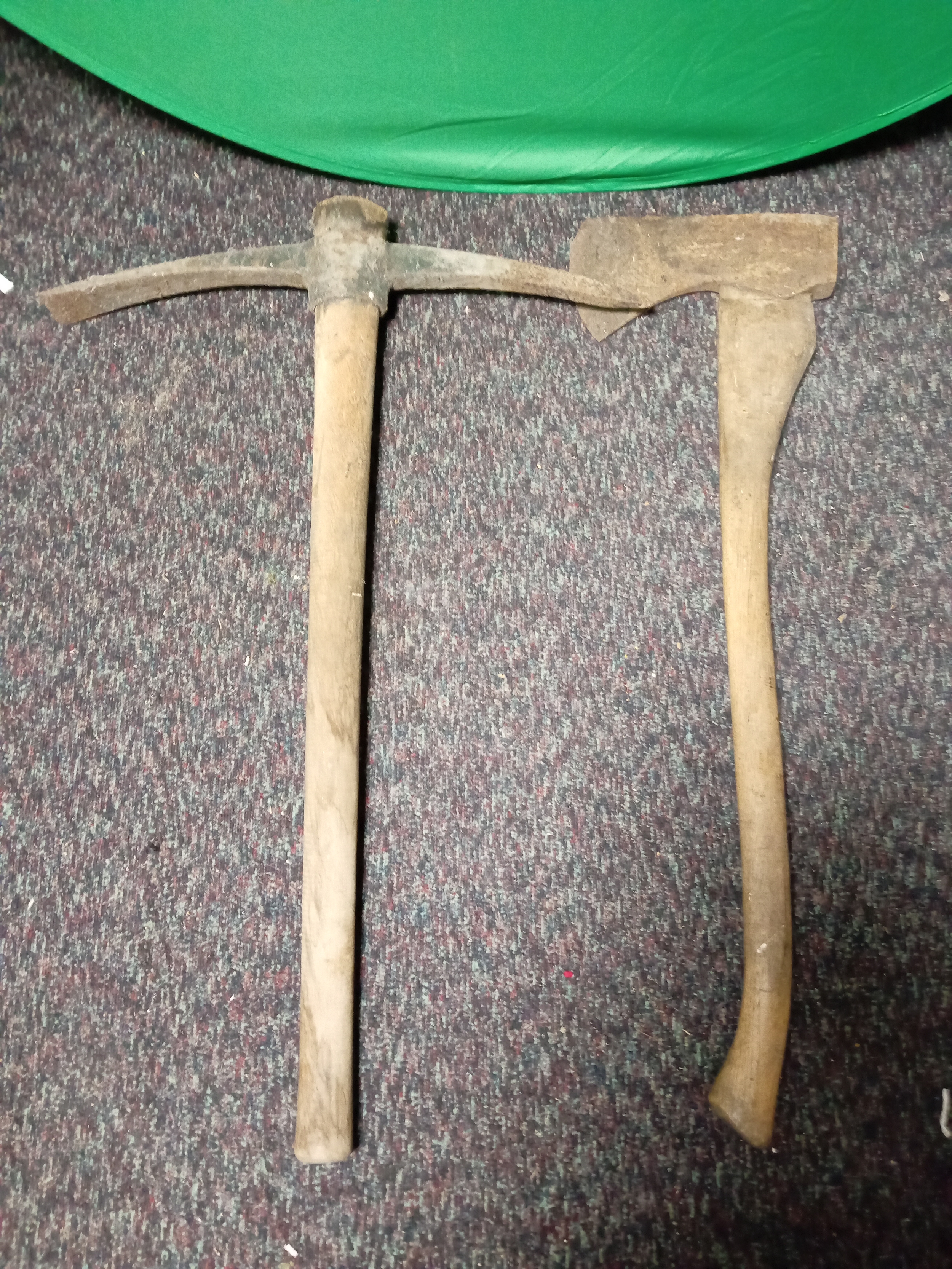 A large wooden handled wood splitting axe & a large wooden handled pickaxe.